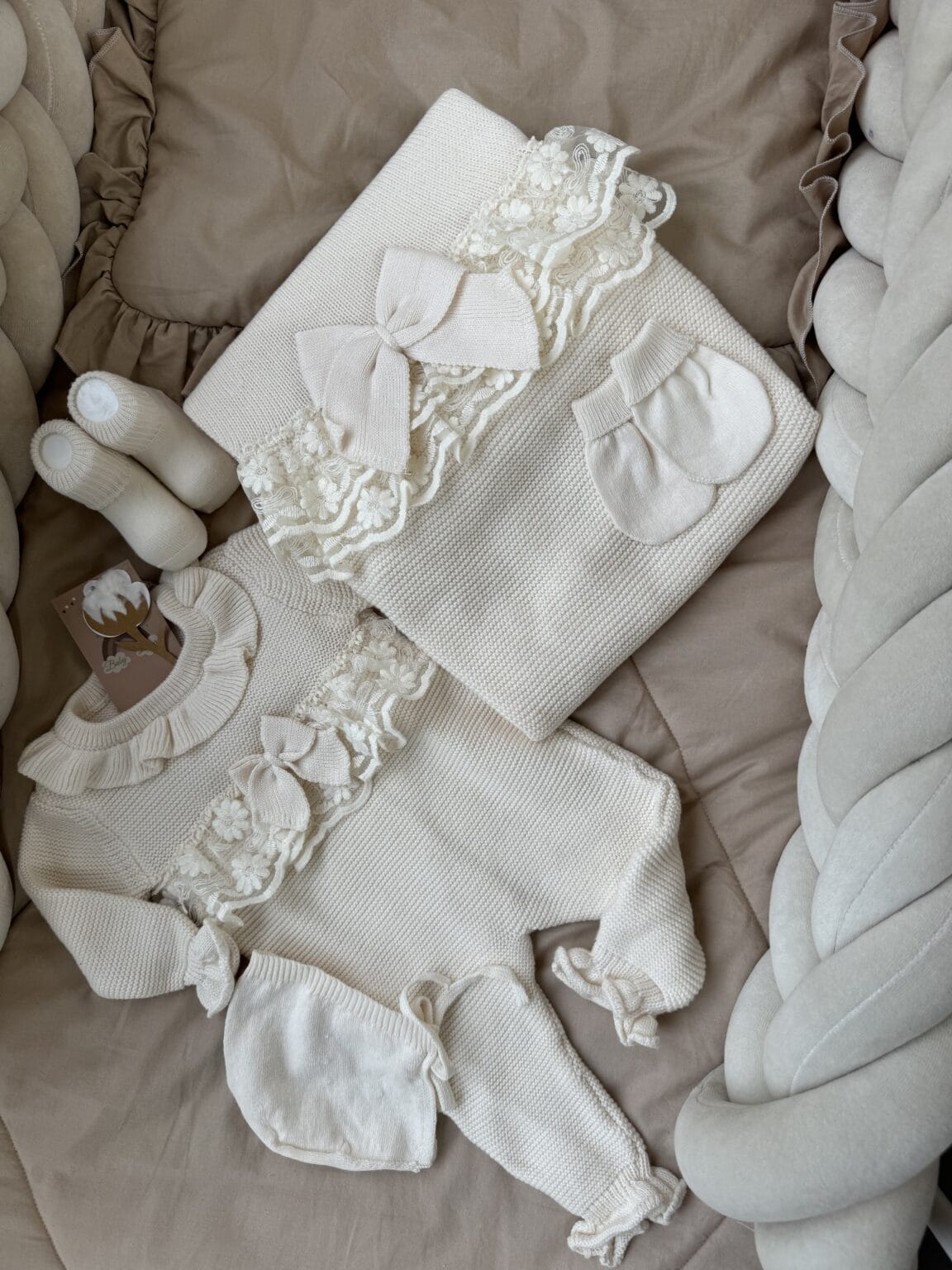 De sokjes, het mutsje, het wiegdekentje en de krabwantjes zijn allemaal in dezelfde stijl als het geboortepakje.