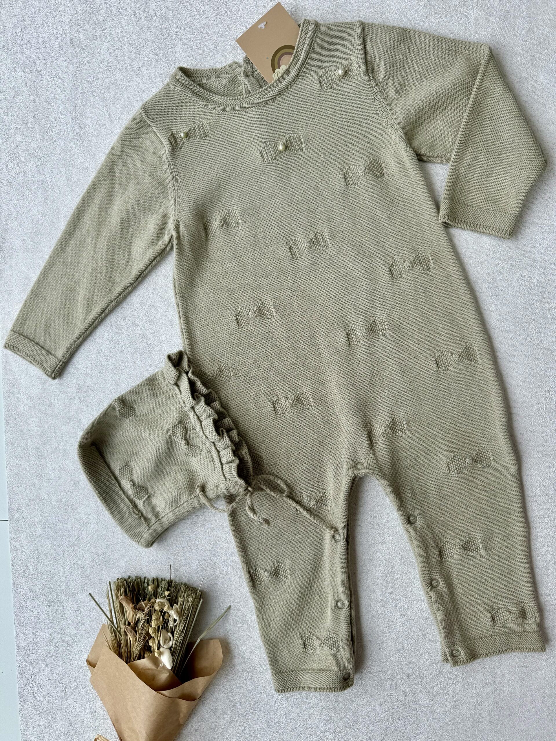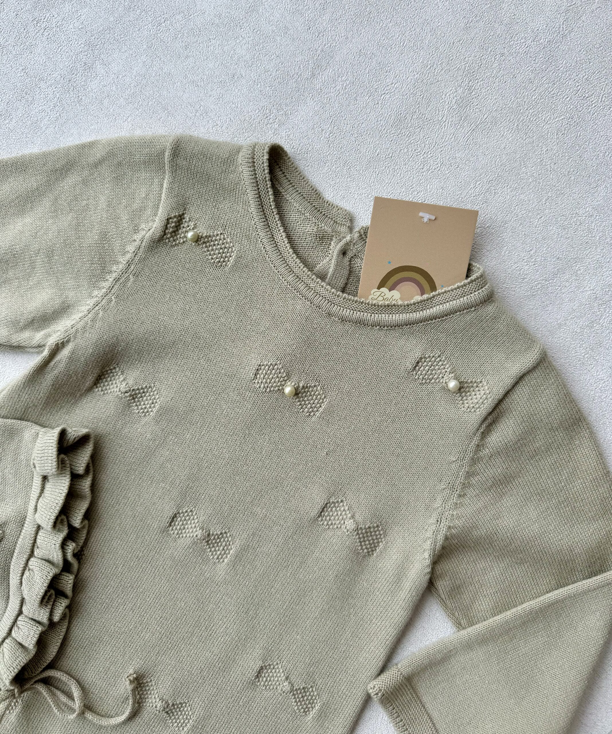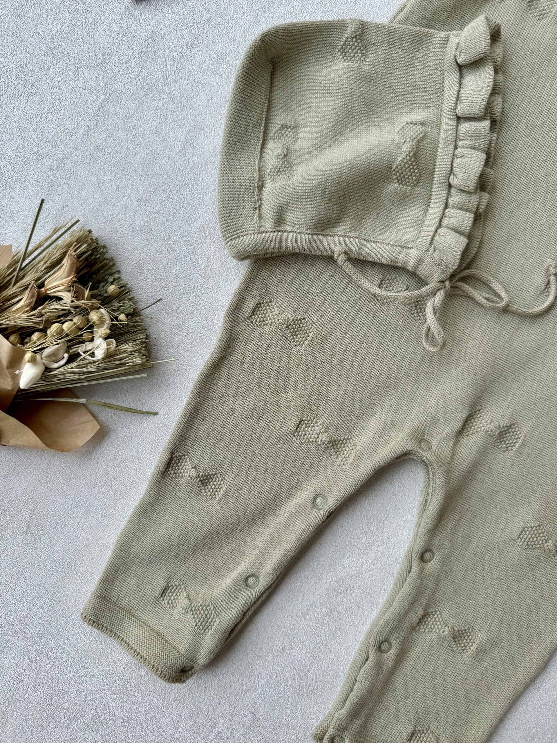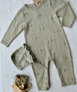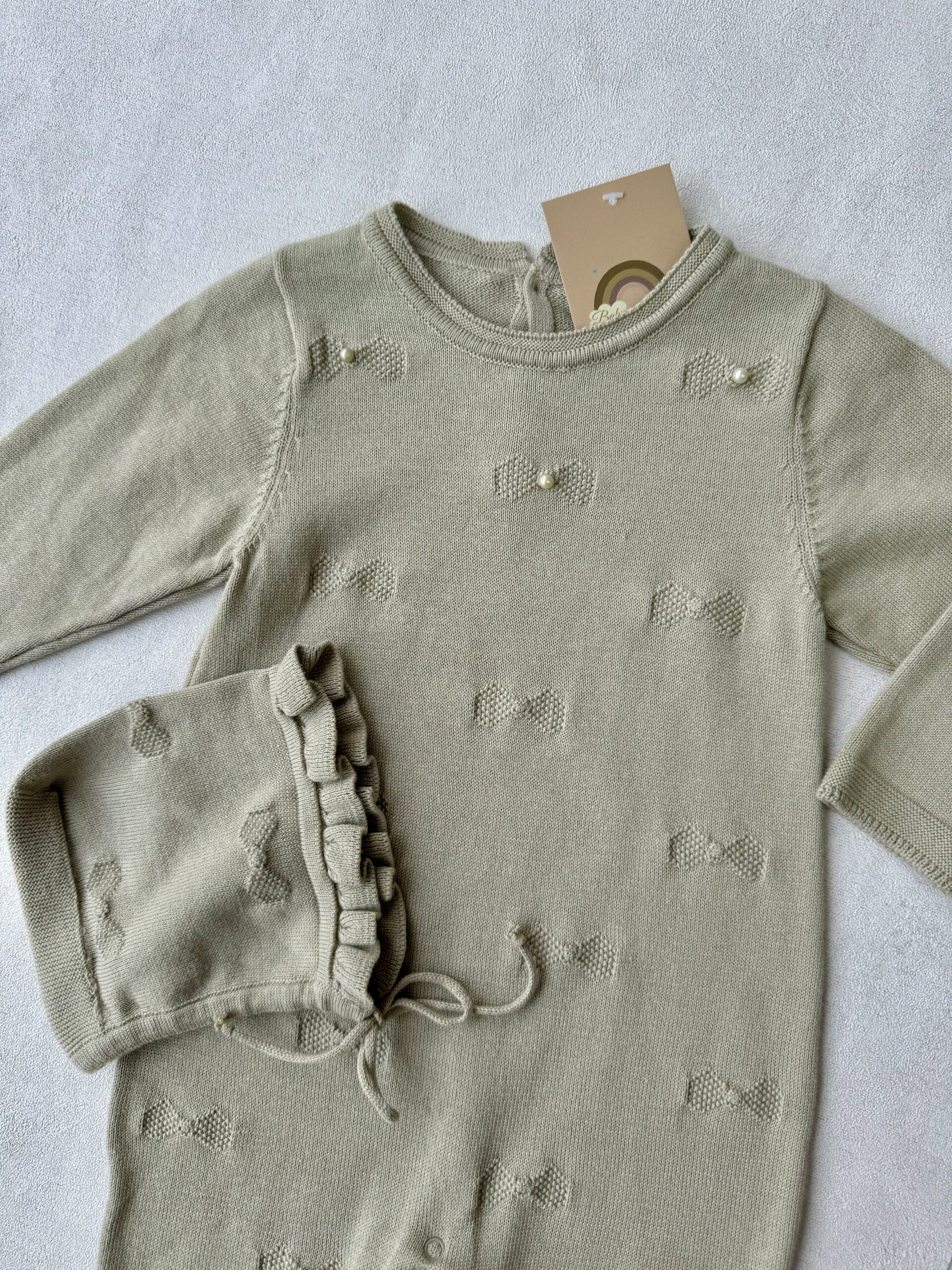 Het boxpakje heeft een bijpassend mutsje, gebreide details met parels en is gemaakt van 100% biologisch katoen.