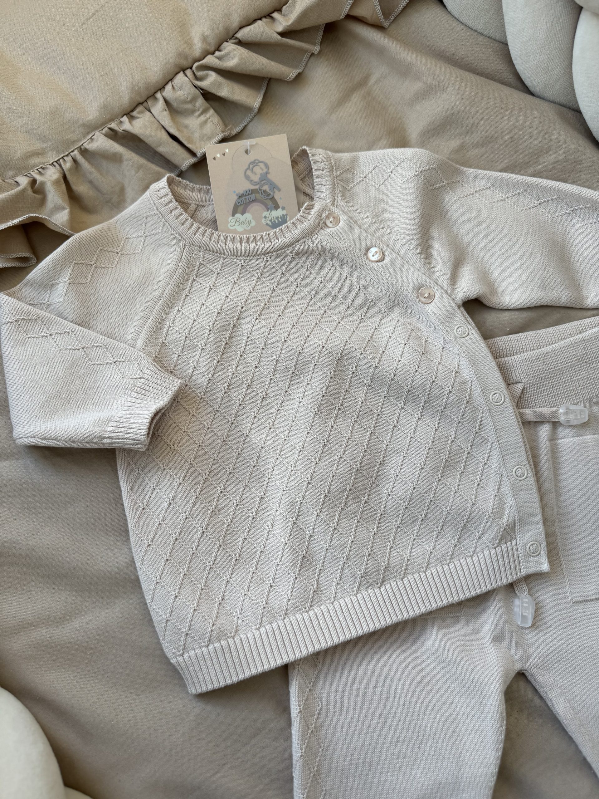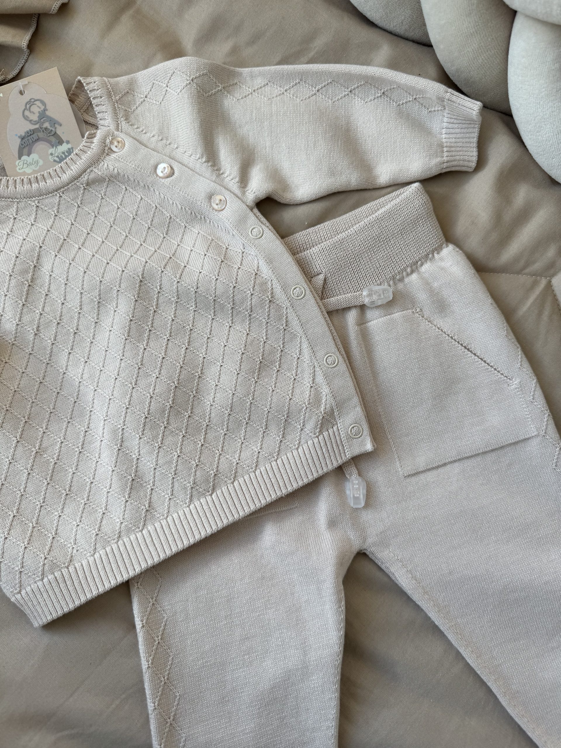 De set heeft overslag (druk)knoopjes en een gebreid patroon.