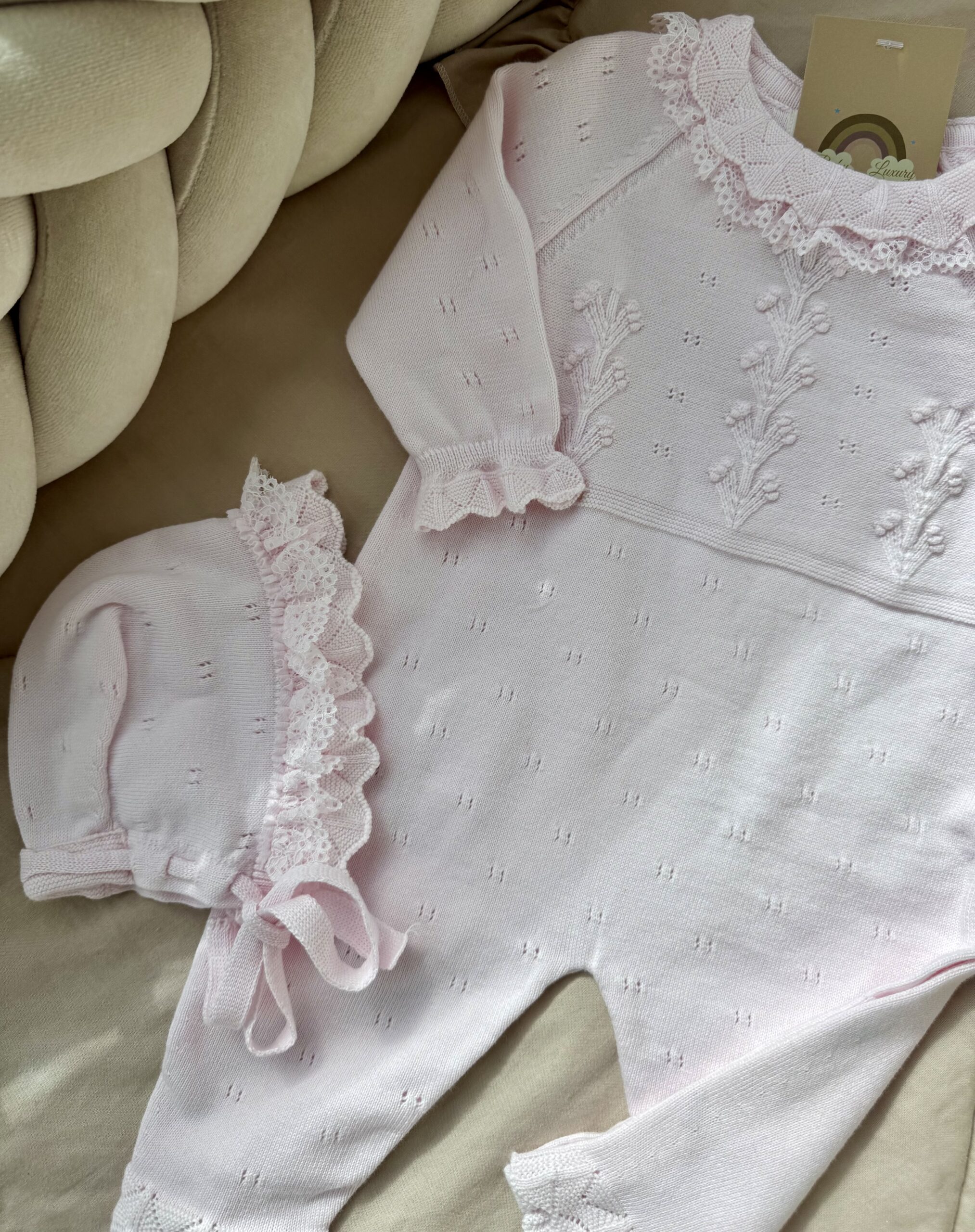 De set bestaat uit een boxpakje met een bijpassend mutsje.