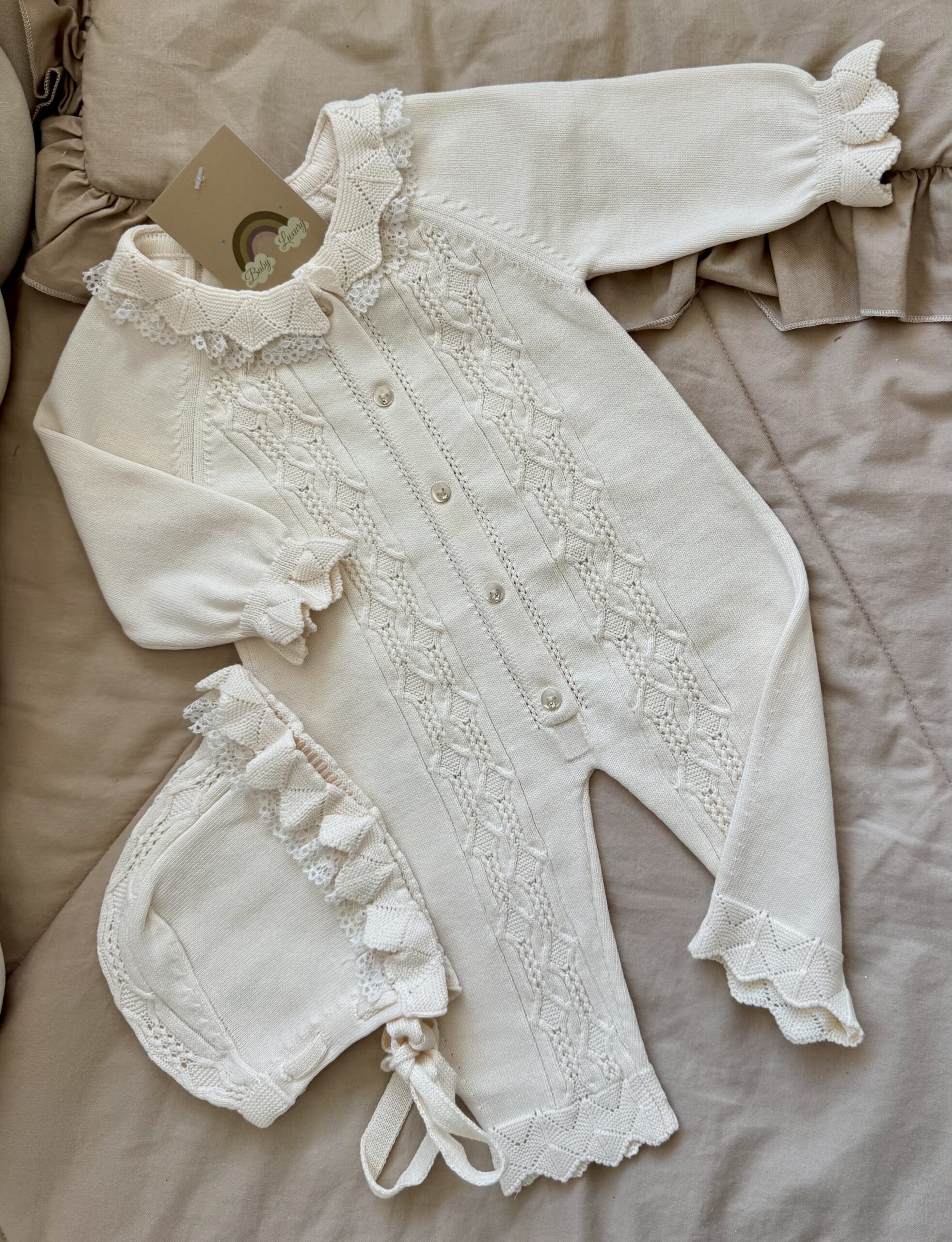 Een 2-delige set in de kleur Beige met een bijpassend mutsje.
