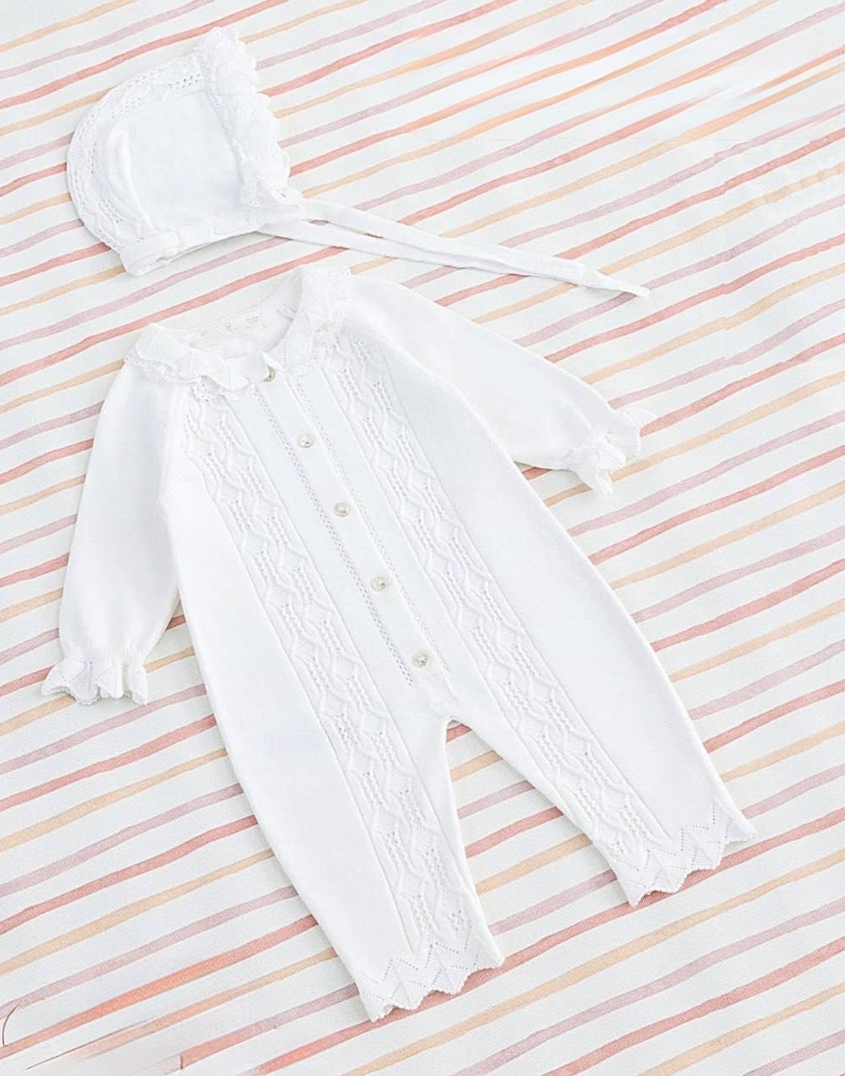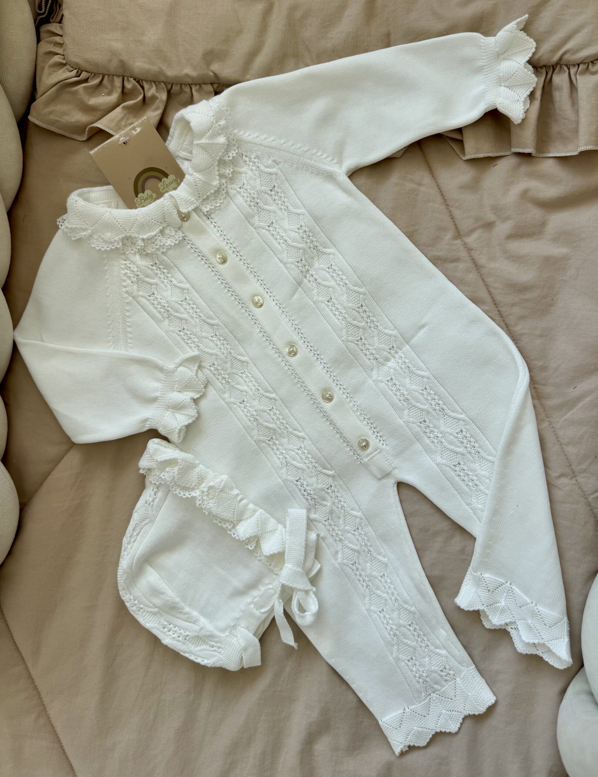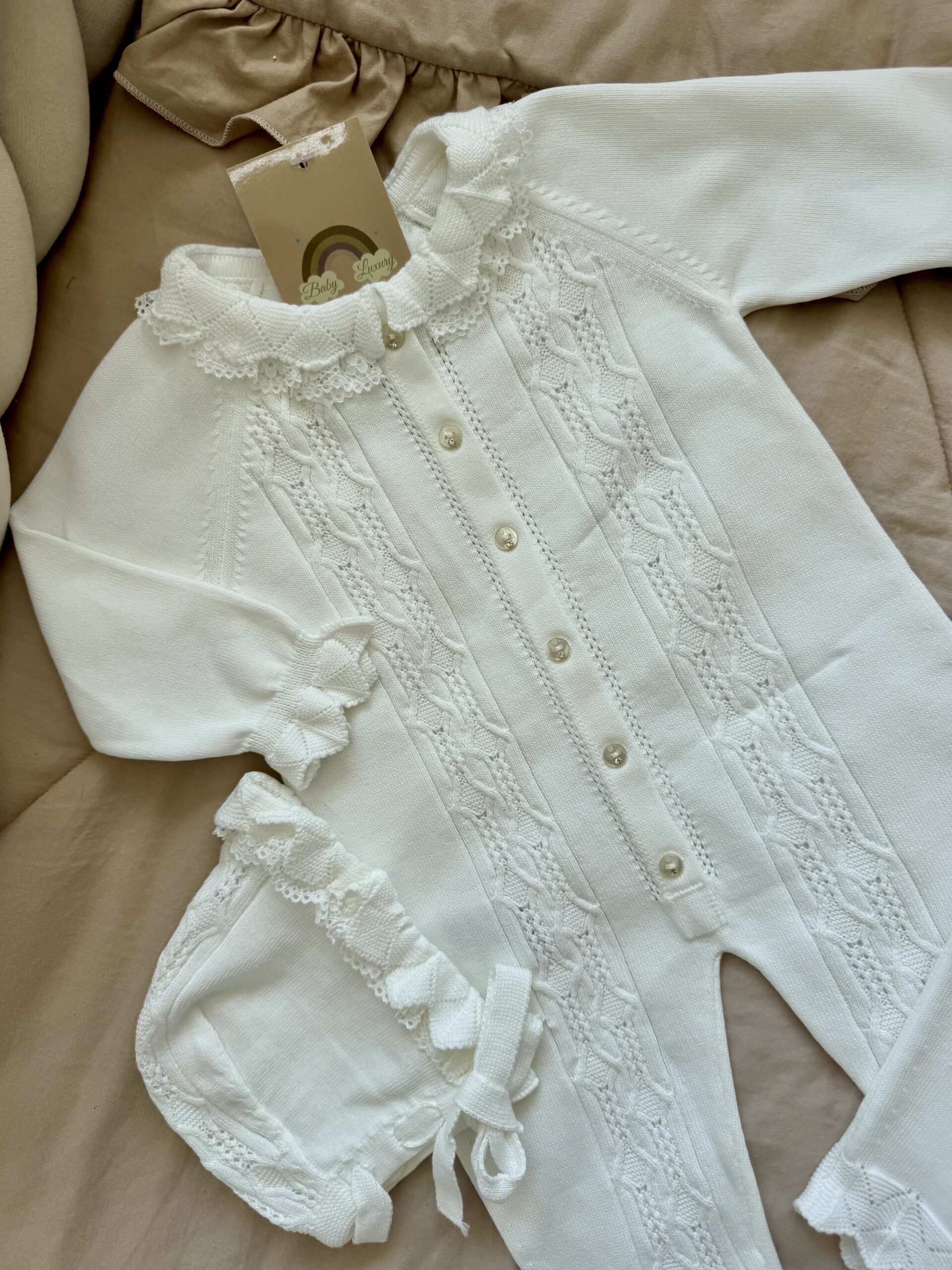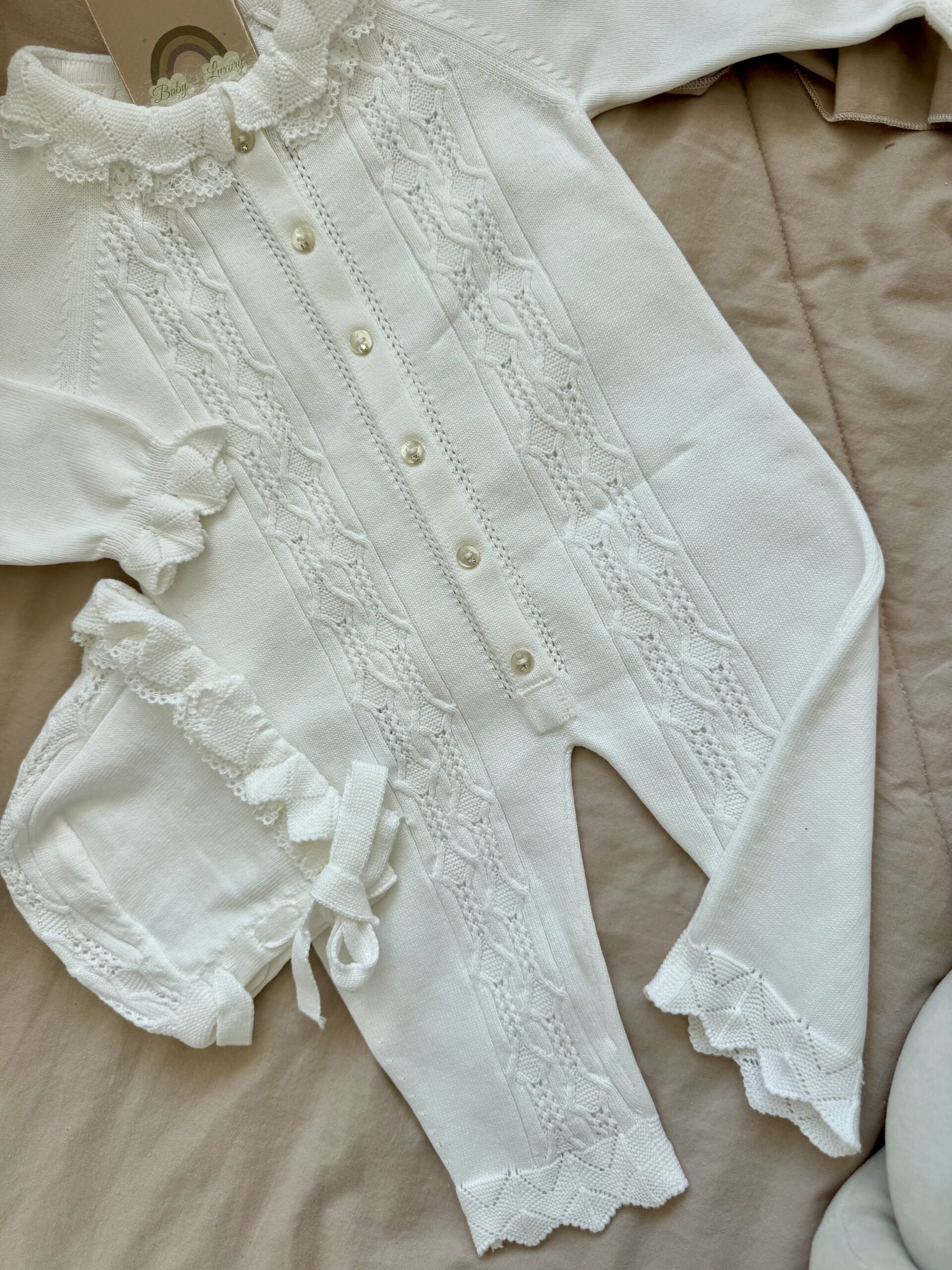 Een 2-delige set in de kleur cream met een bijpassend mutsje.
