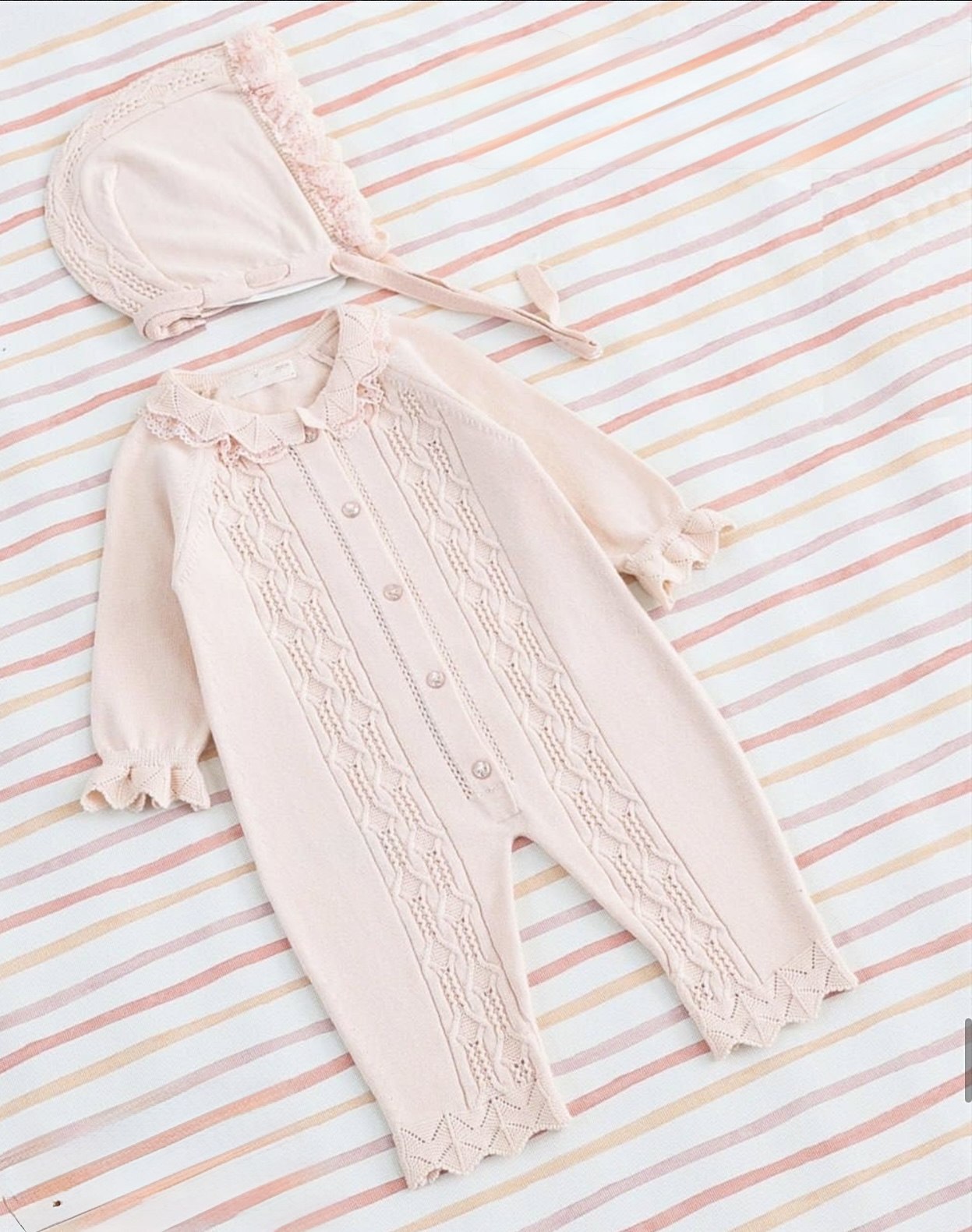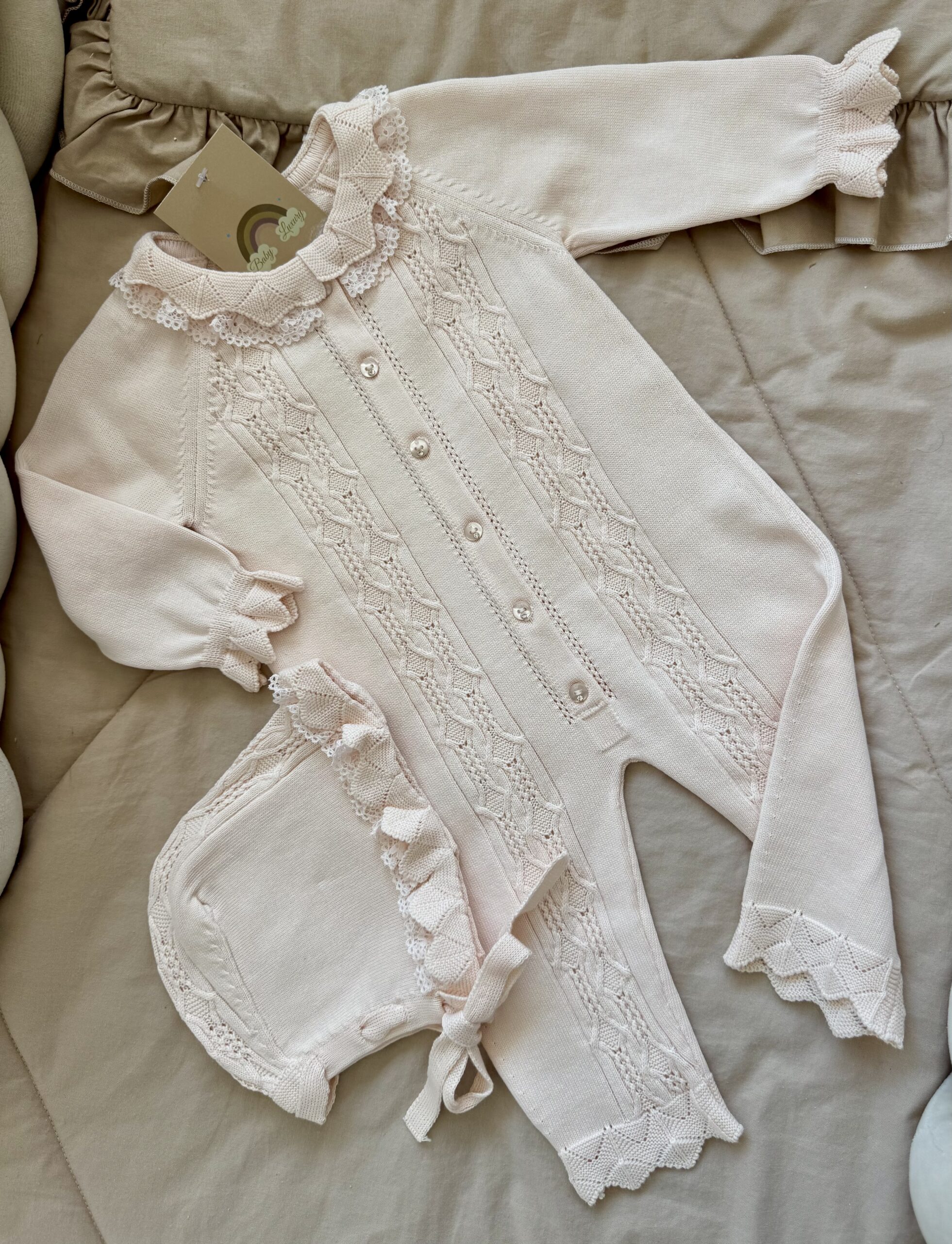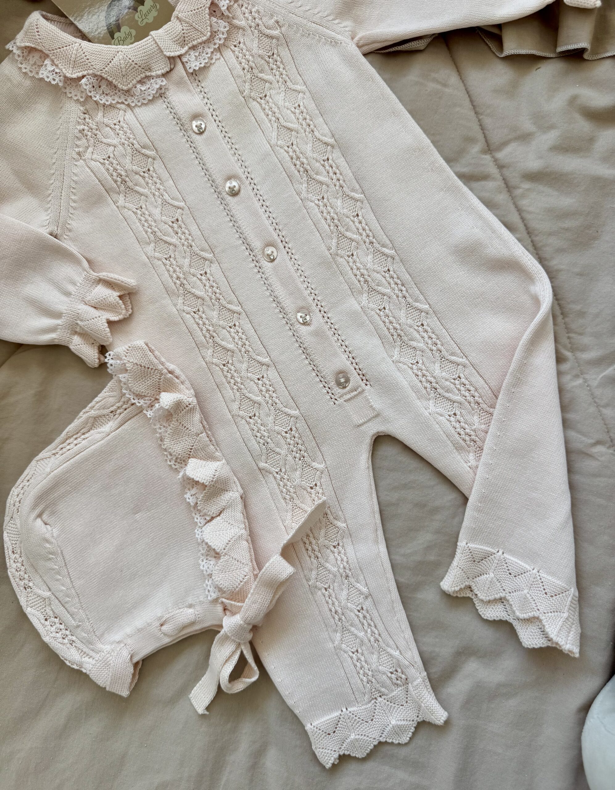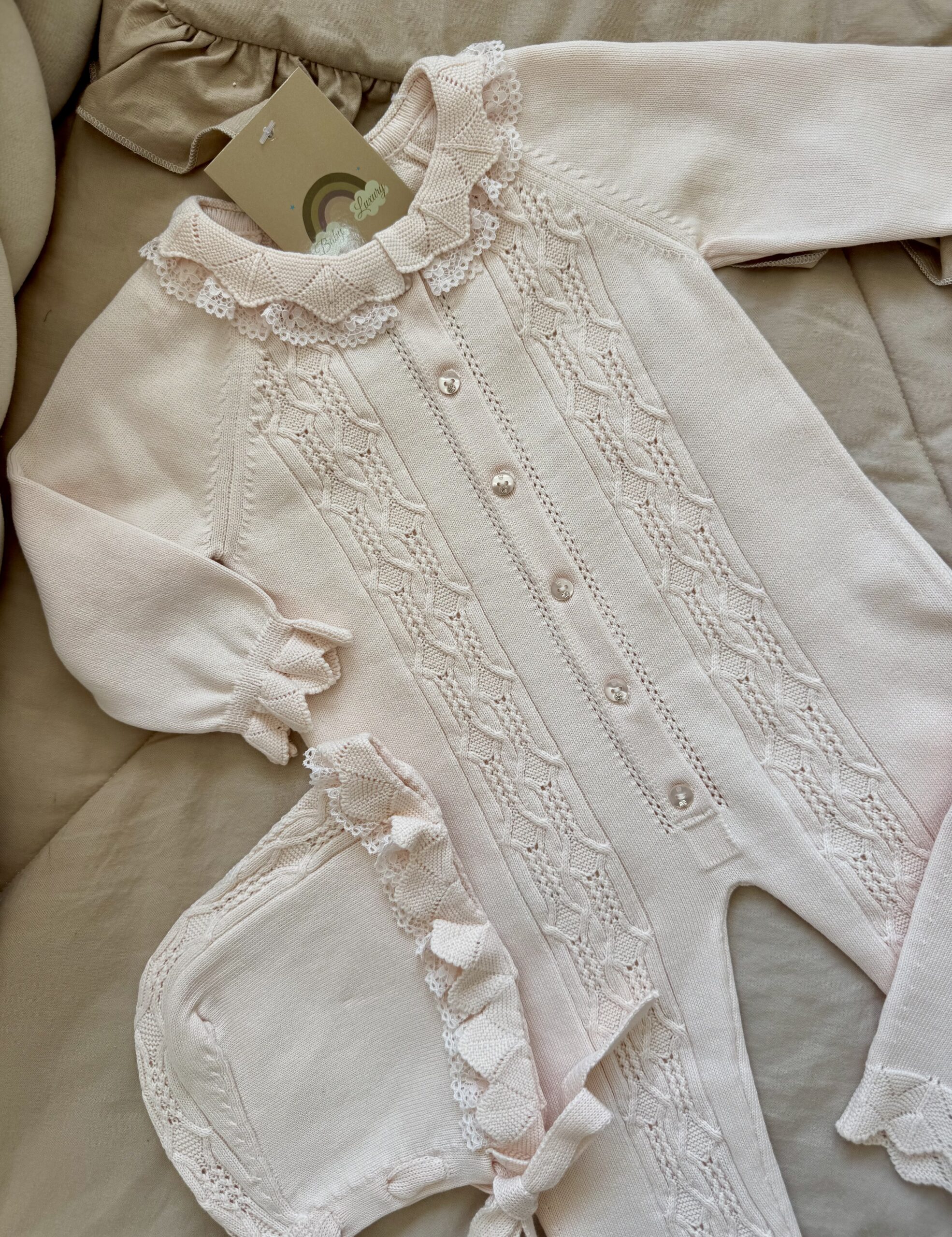 Een 2-delige set in de kleur roze met een bijpassend mutsje.