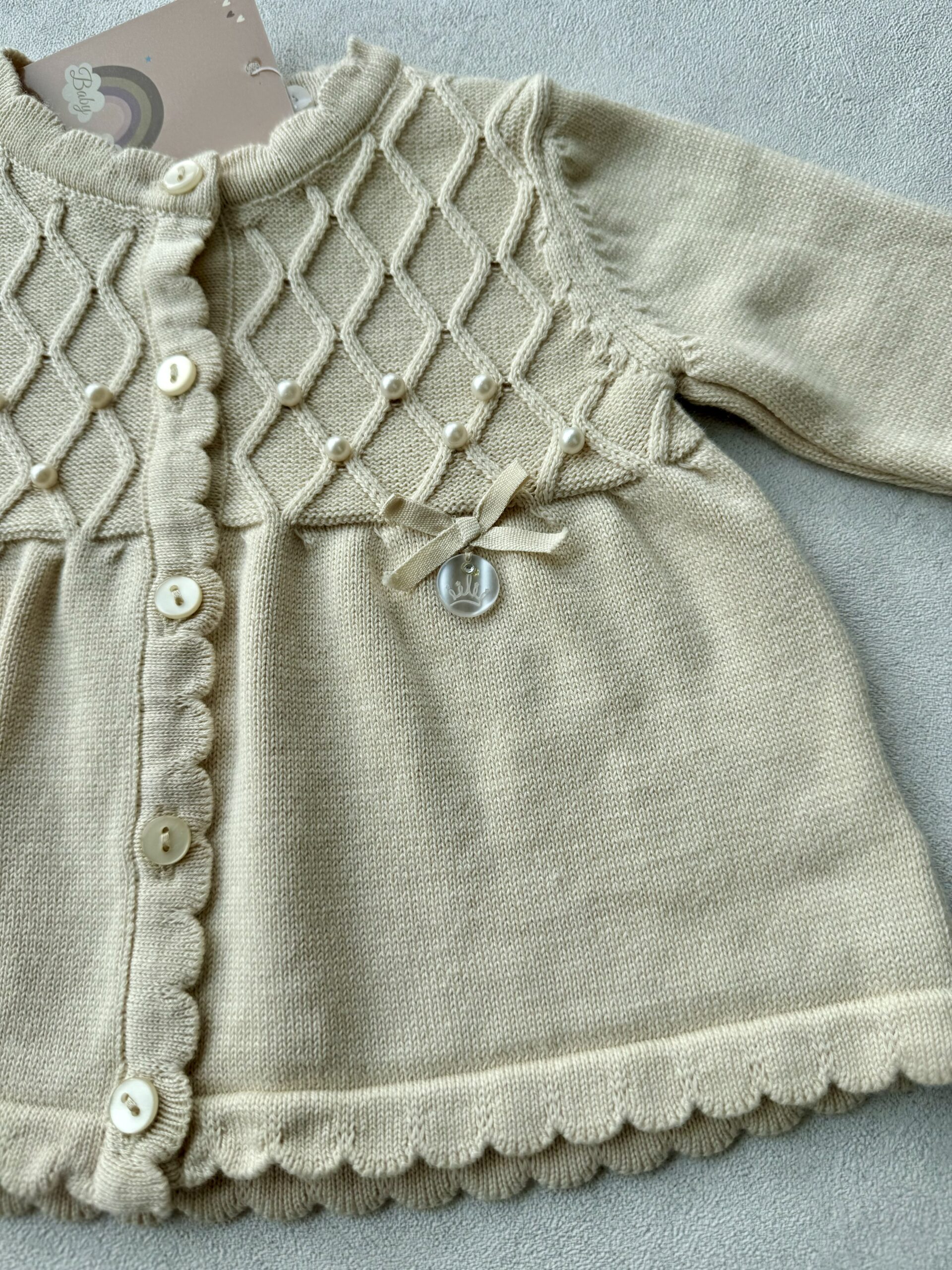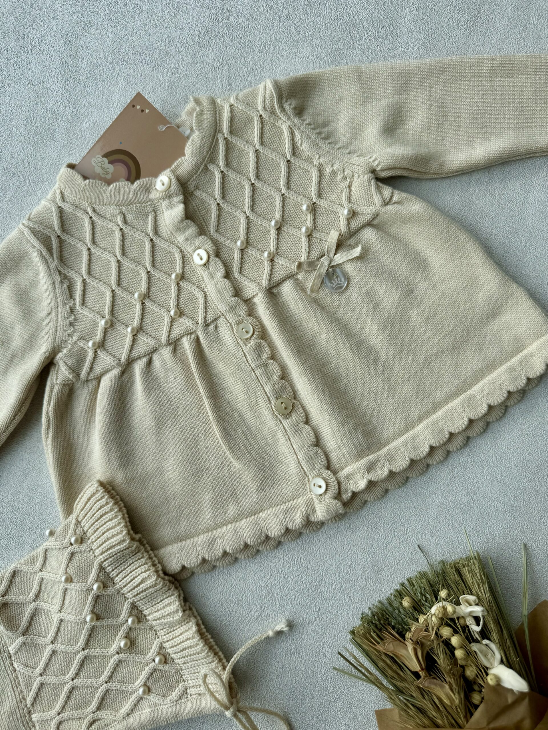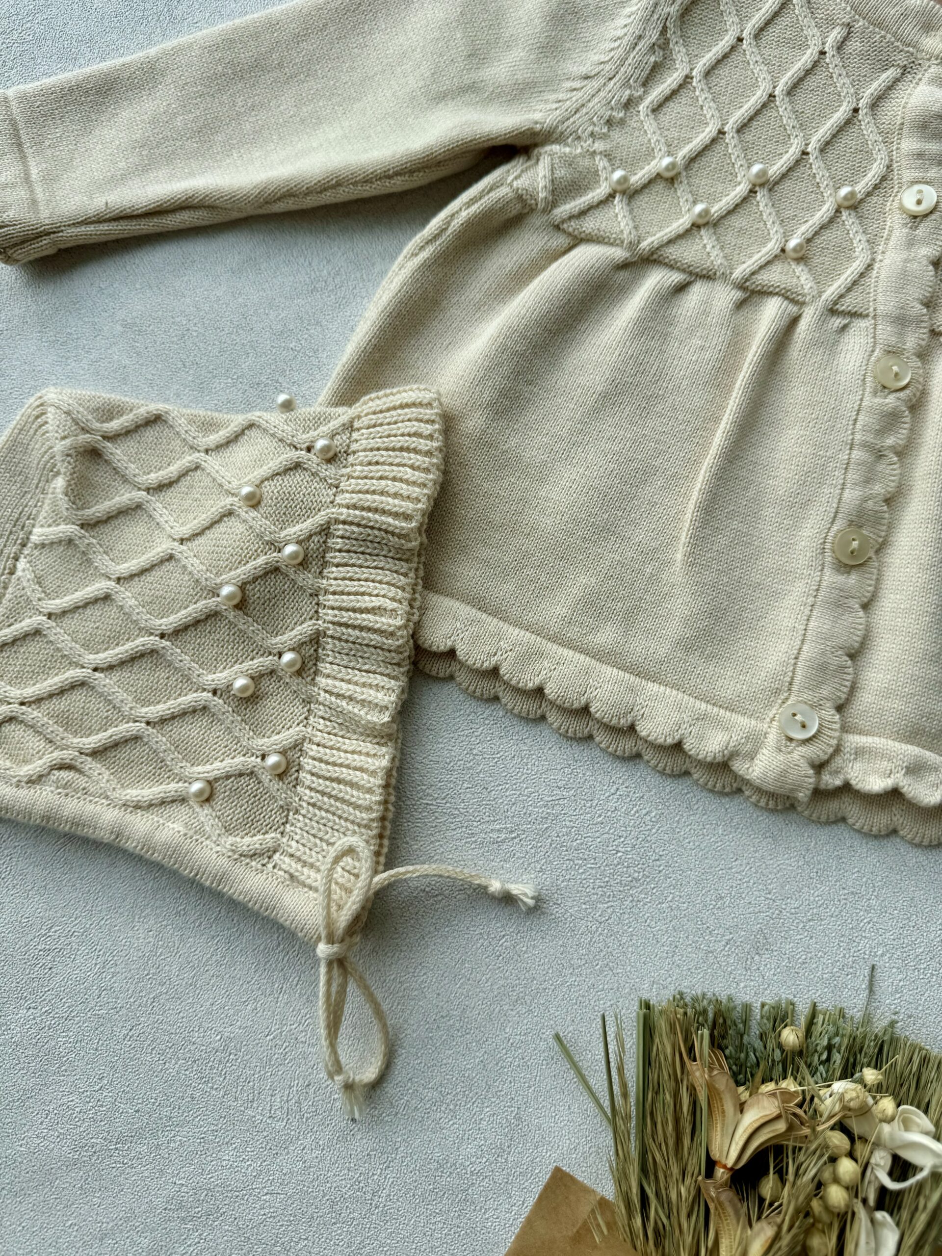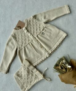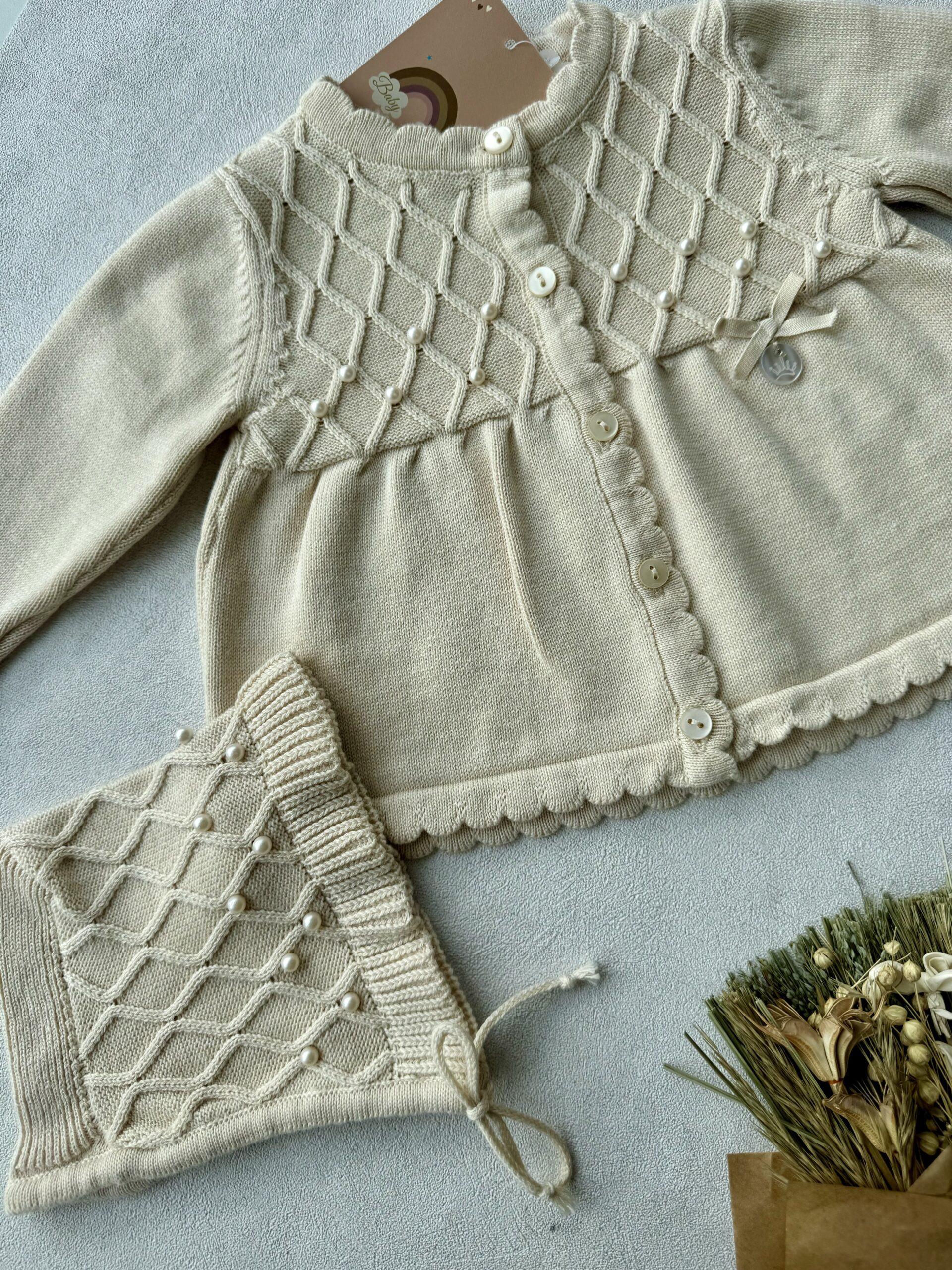 De set heeft een gebreid motief, parel afwerkingen, een strikje en een bijpassend mutsje.