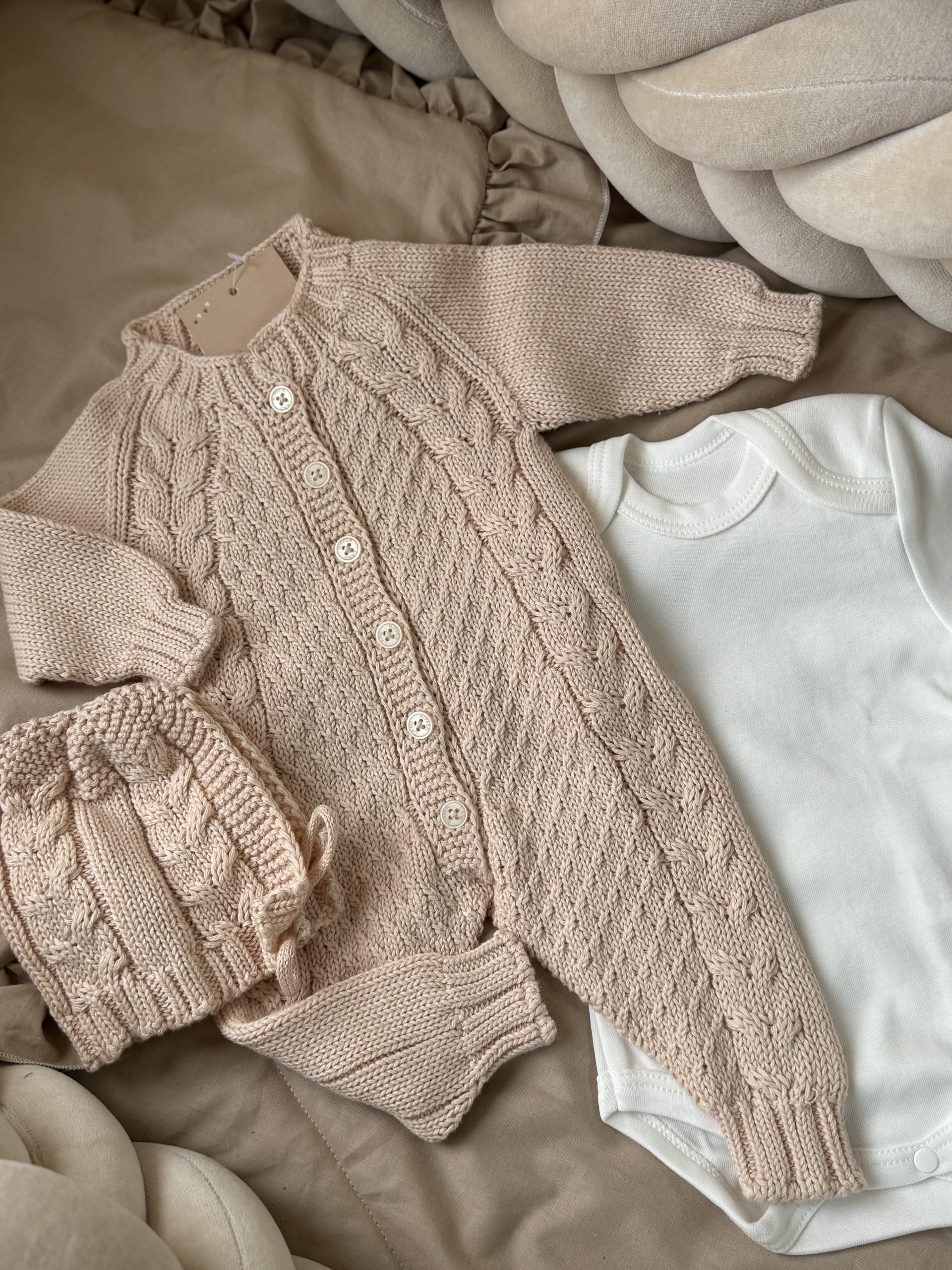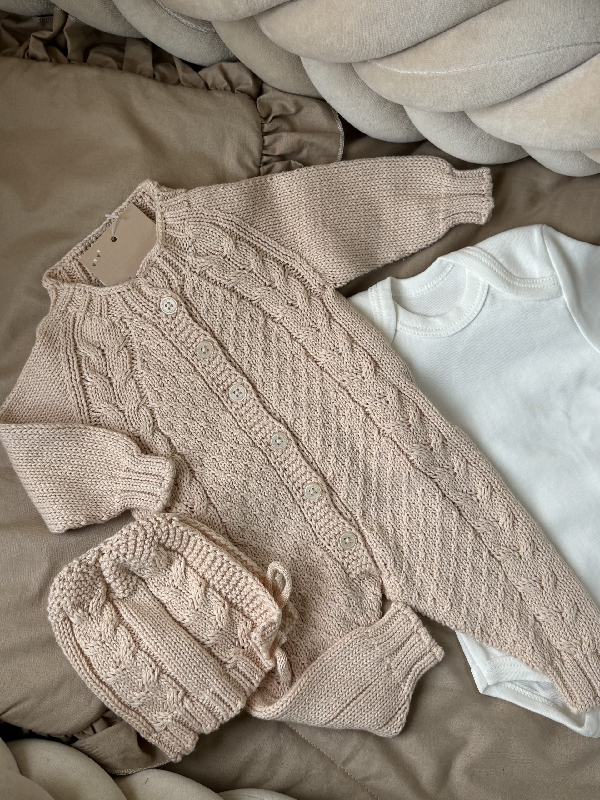 Deze set bestaat uit een gebreid boxpakje met prachtig brei werk, een gebreid mutsje en een zacht katoenen romper.