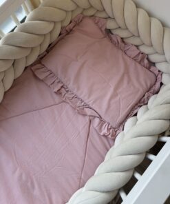 Het kussentje en dekbedje hebben een ruffle omranding en de kleur is oudroze.