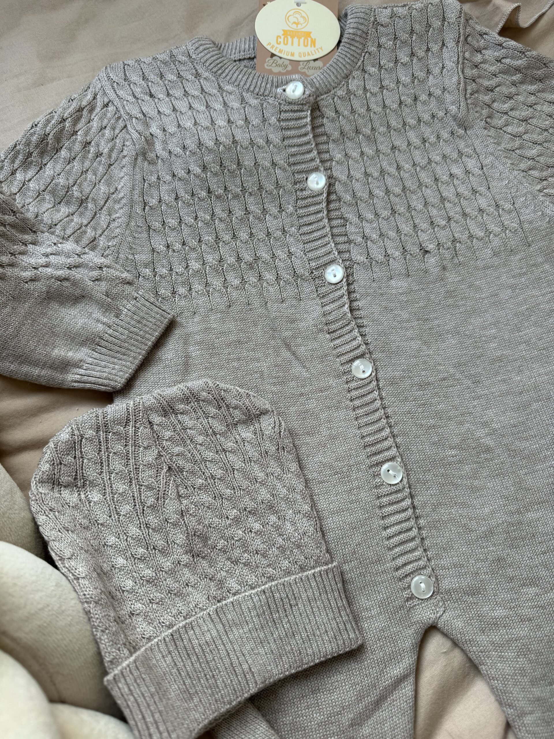 Een 2-delige set gemaakt van 100% biologisch katoen in de kleur taupe.