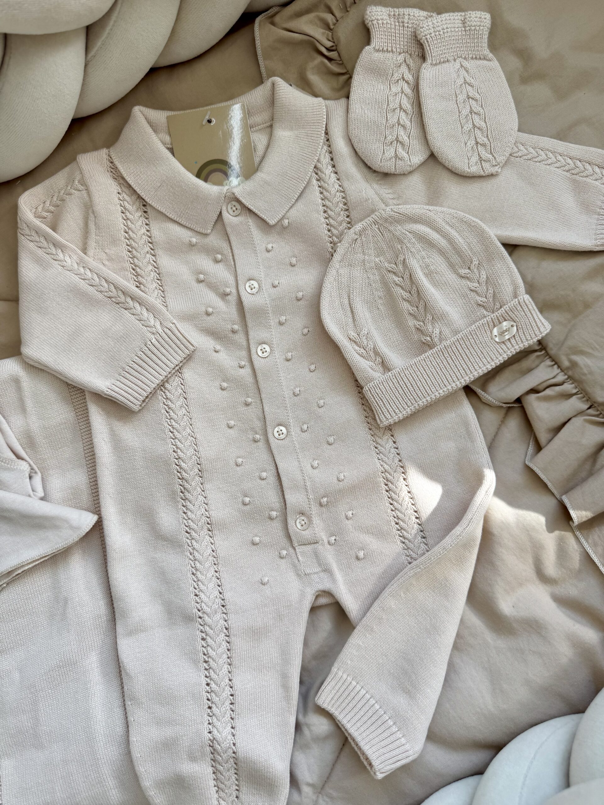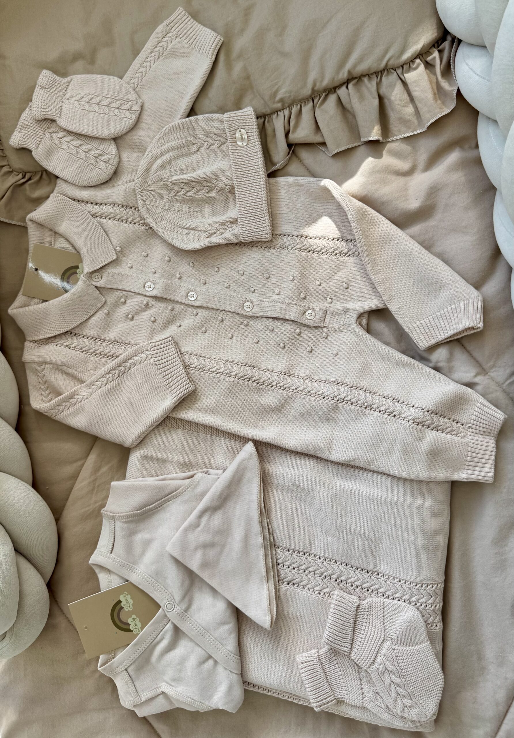 – Een gebreid boxpakje in de maat 0-3 maanden.