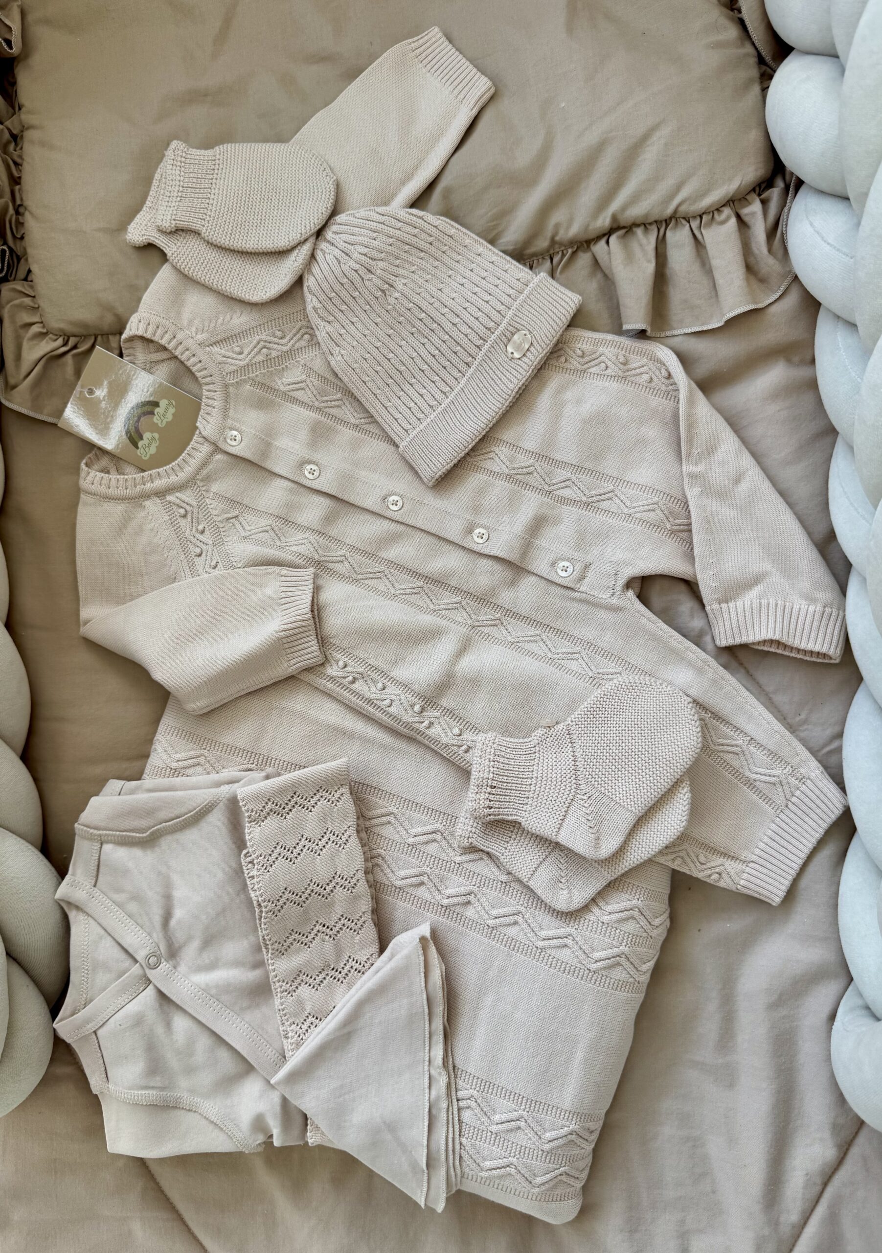 – Een gebreid boxpakje in de maat 0-3 maanden.
