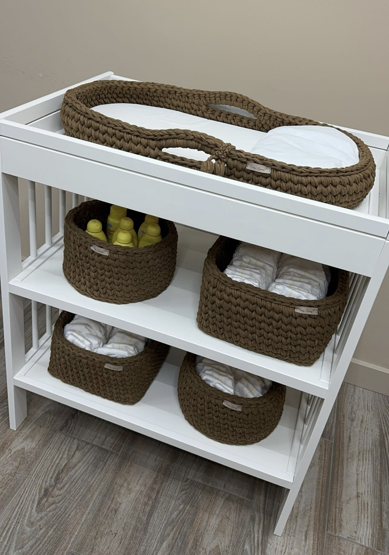Style Baby Luxury’s verschoonmand met onze prachtige mozesmand en schommelwieg in de babykamer om een compleet gehaakte set te creëren.
