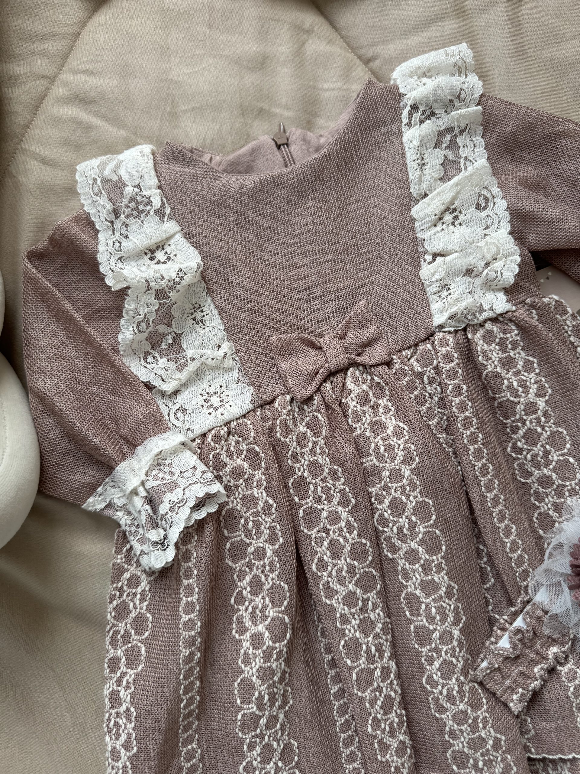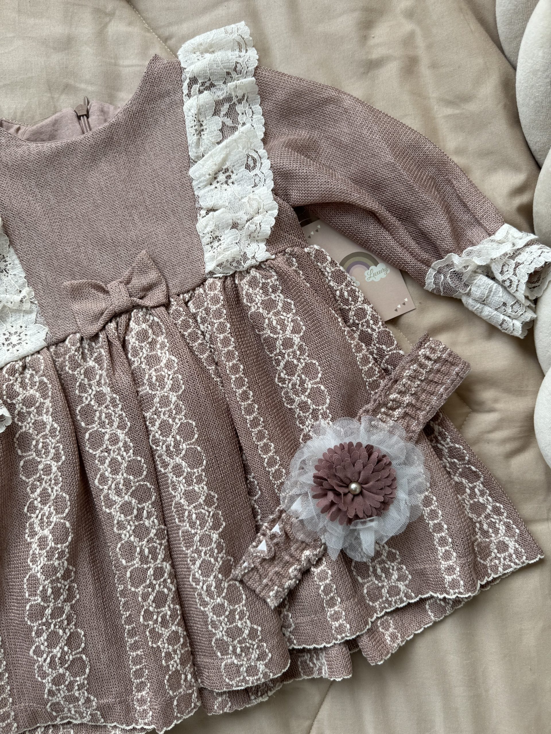 Een exclusieve jurk met kanten details in de kleur oudroze.