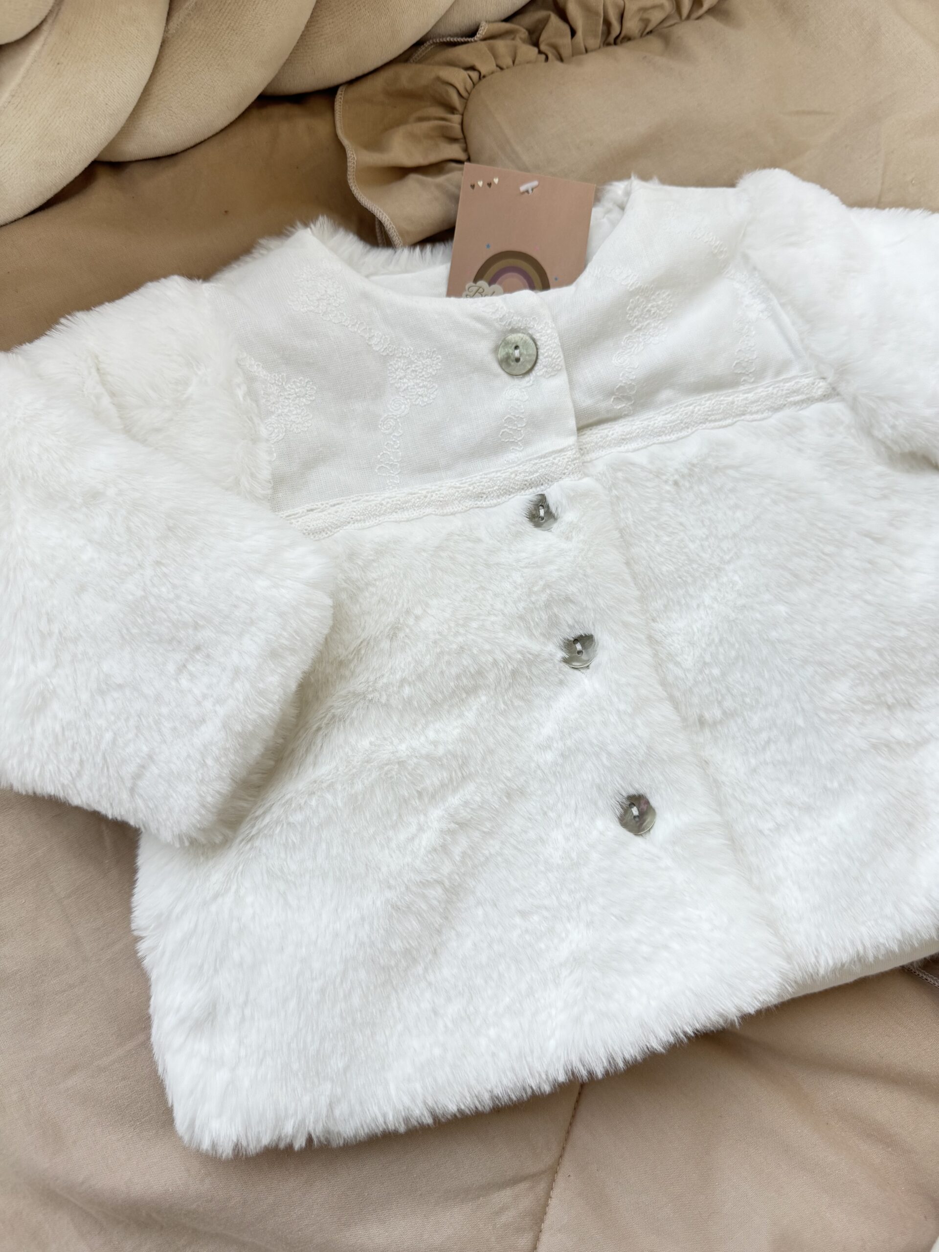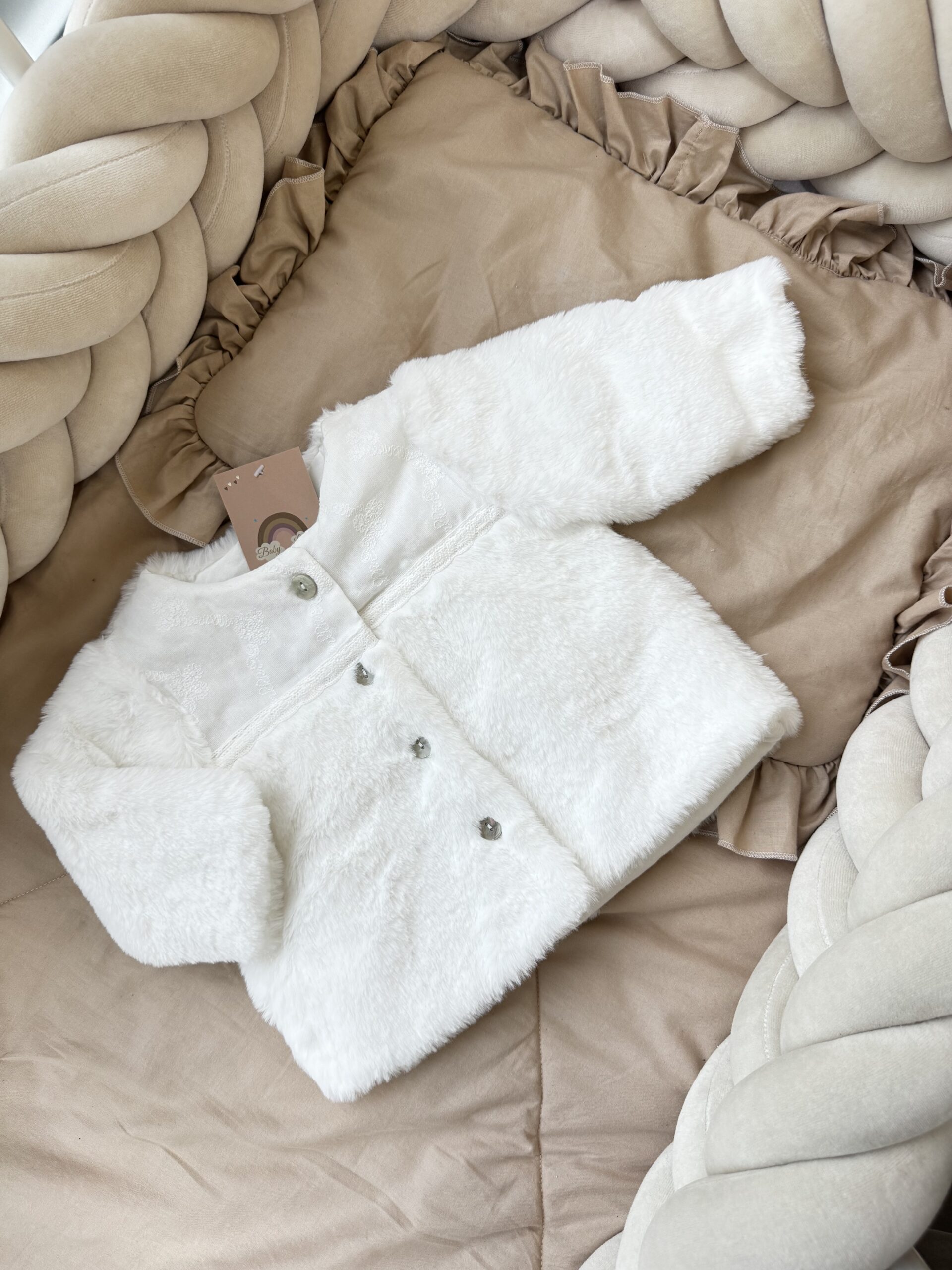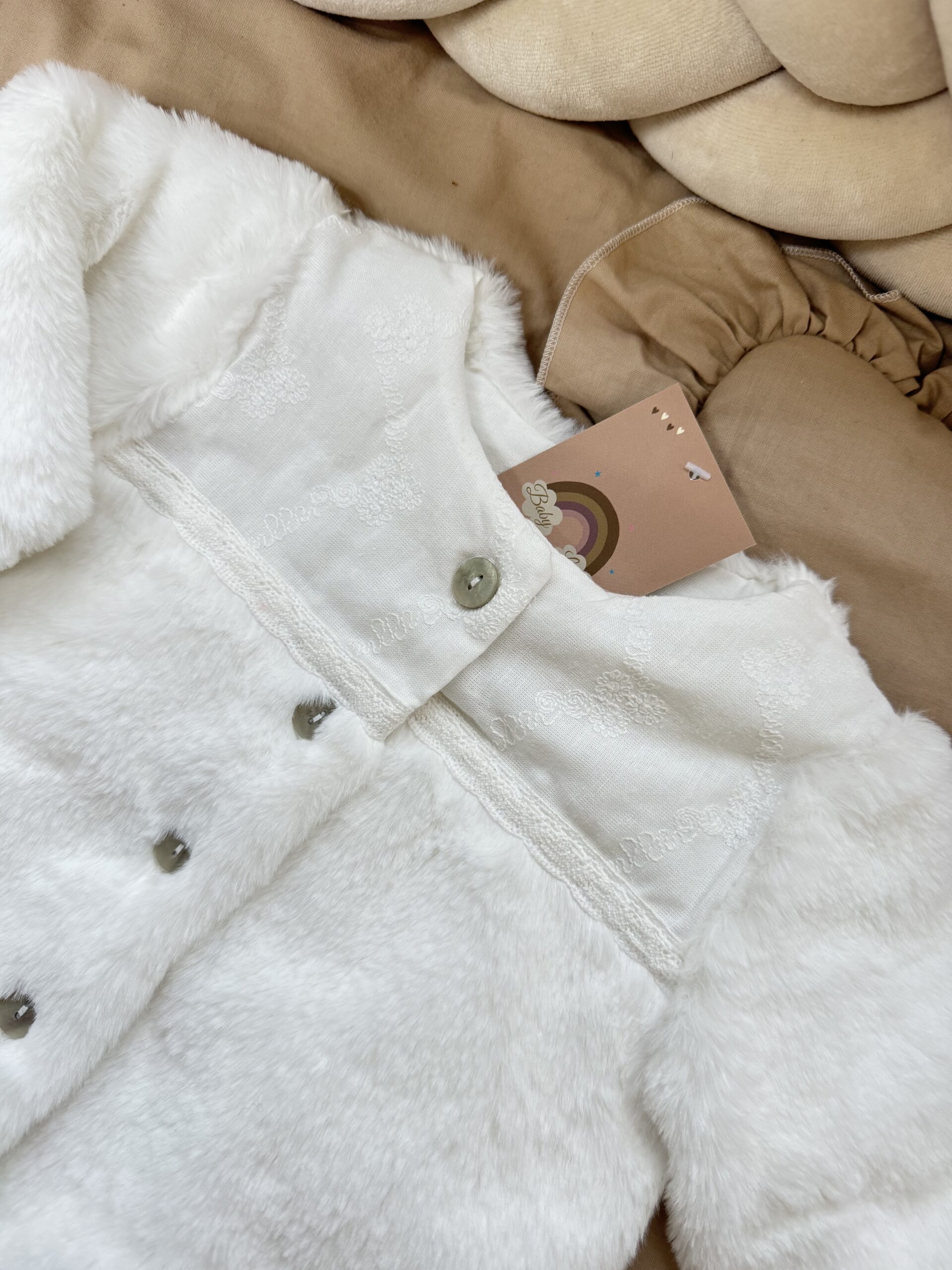 Een babyjasje van hoogwaardig fluffy fauxfur.