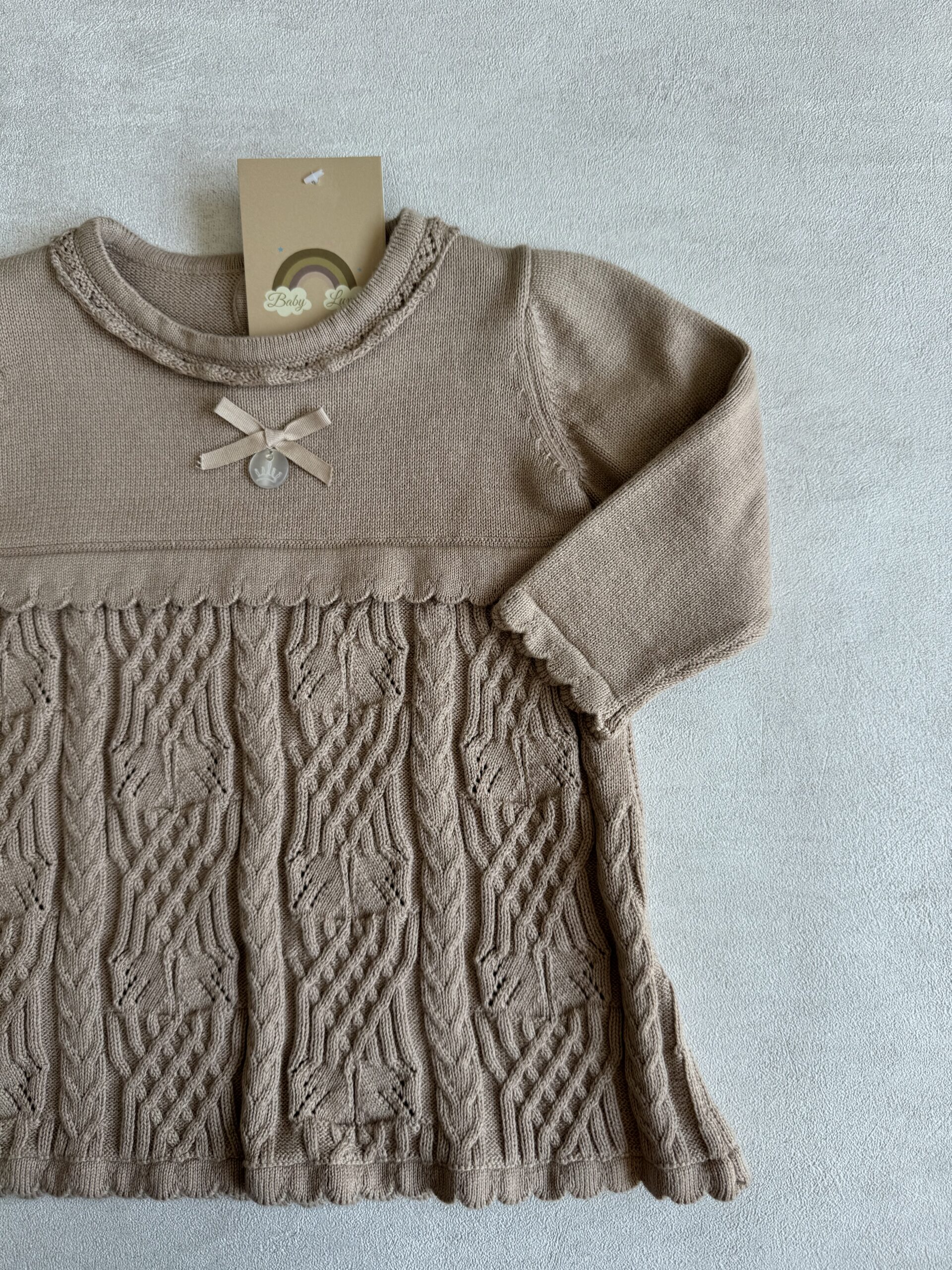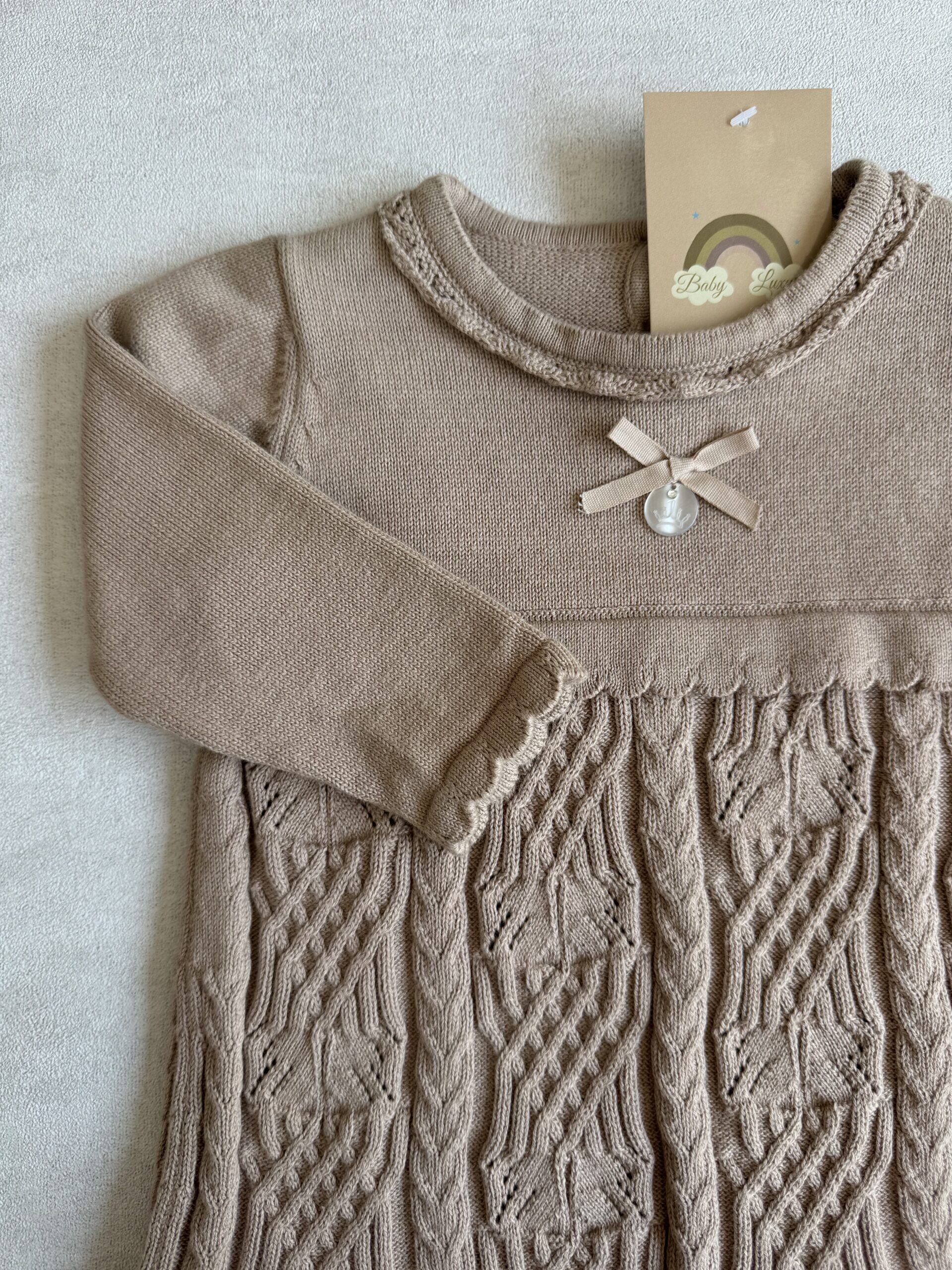 Een gebreid jurkje in de kleur Almond.