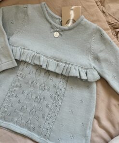Een gebreid jurkje in de kleur AquaMint. Prachtige pointelle breiwerk, een strikje en ruffle afwerkingen.