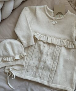 Een gebreid jurkje in de kleur Beige. Prachtige pointelle breiwerk, een strikje en ruffle afwerkingen.