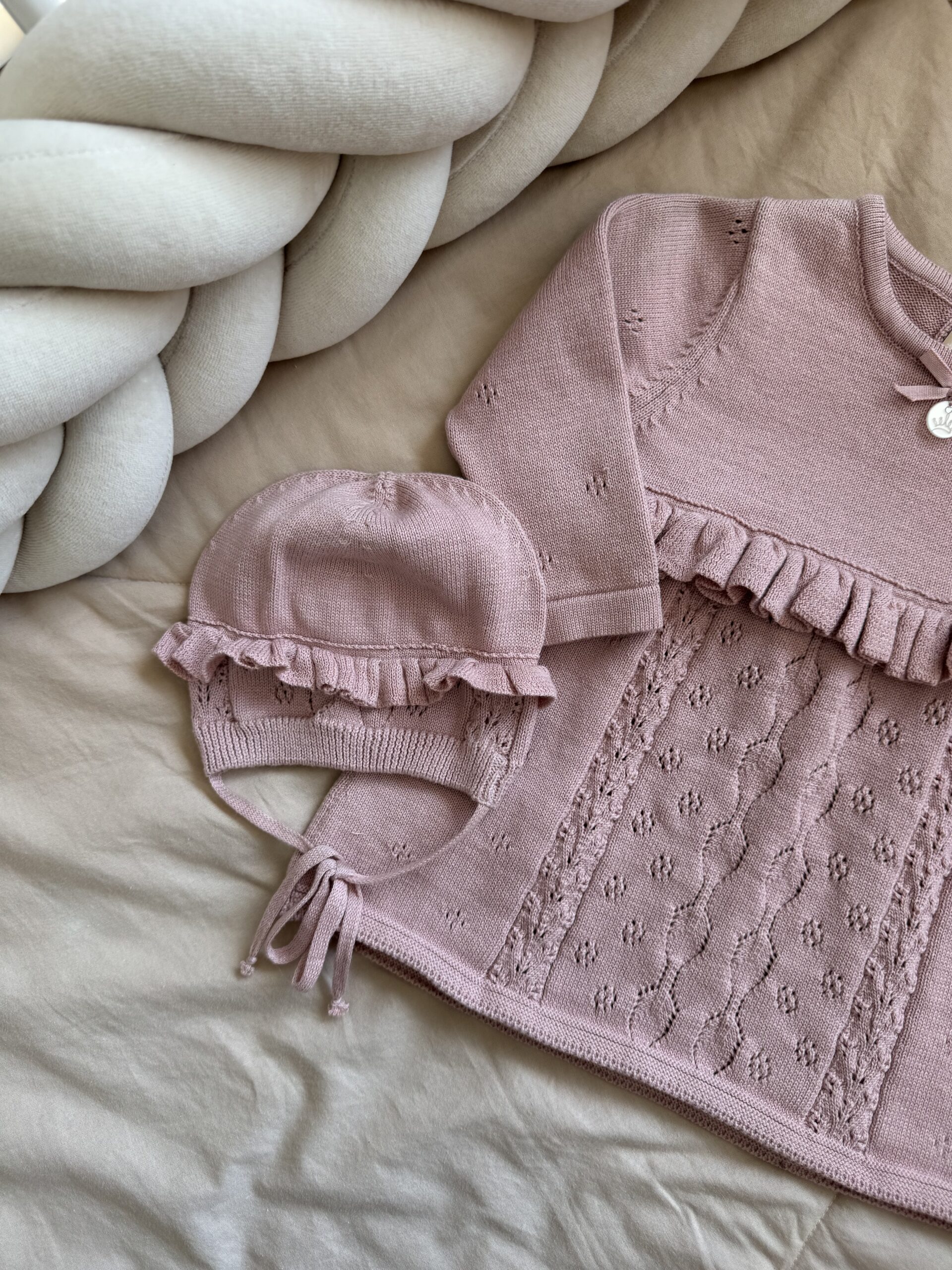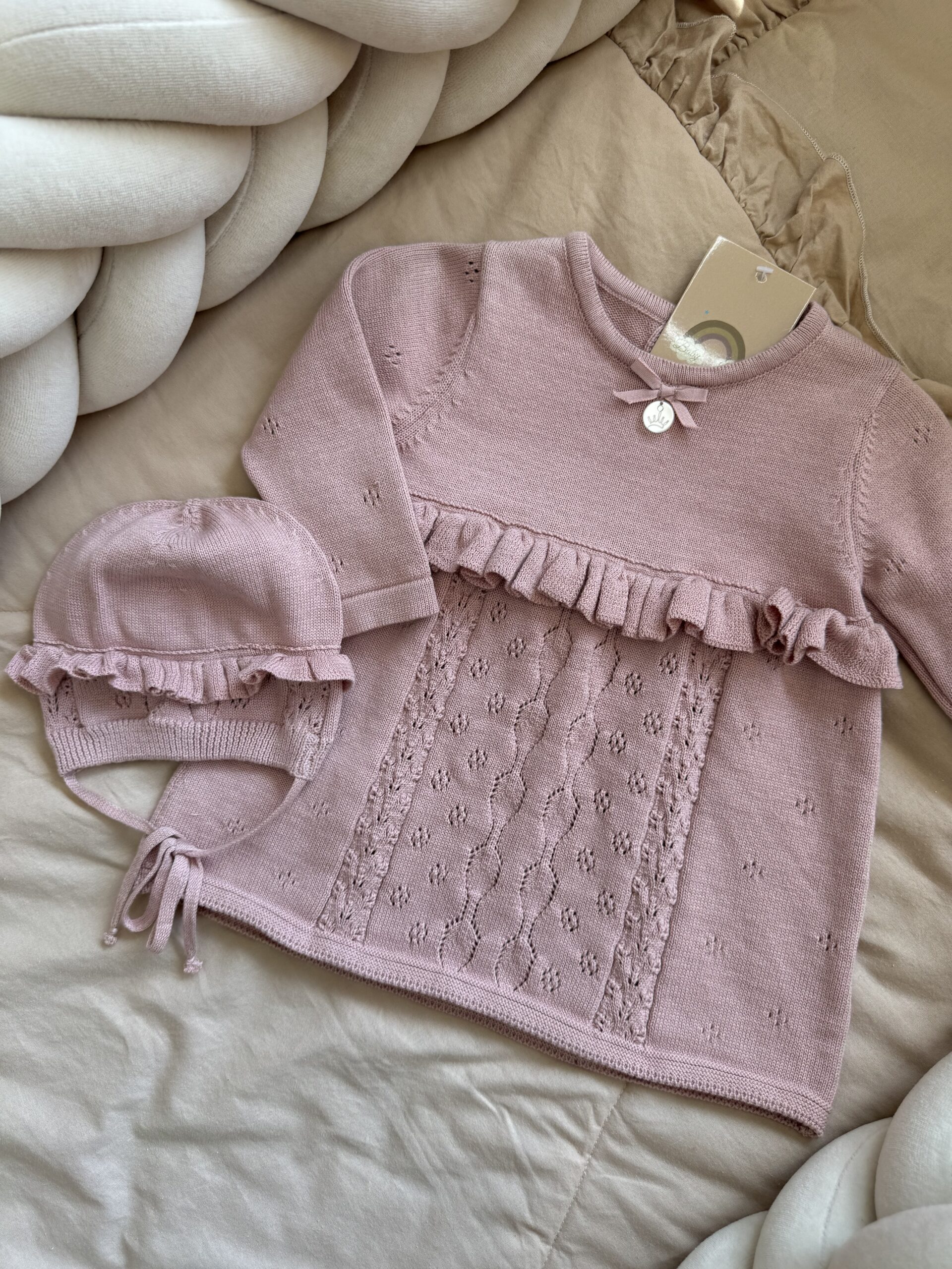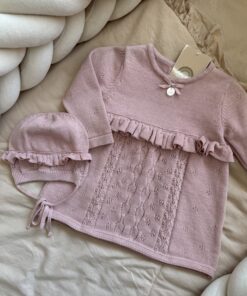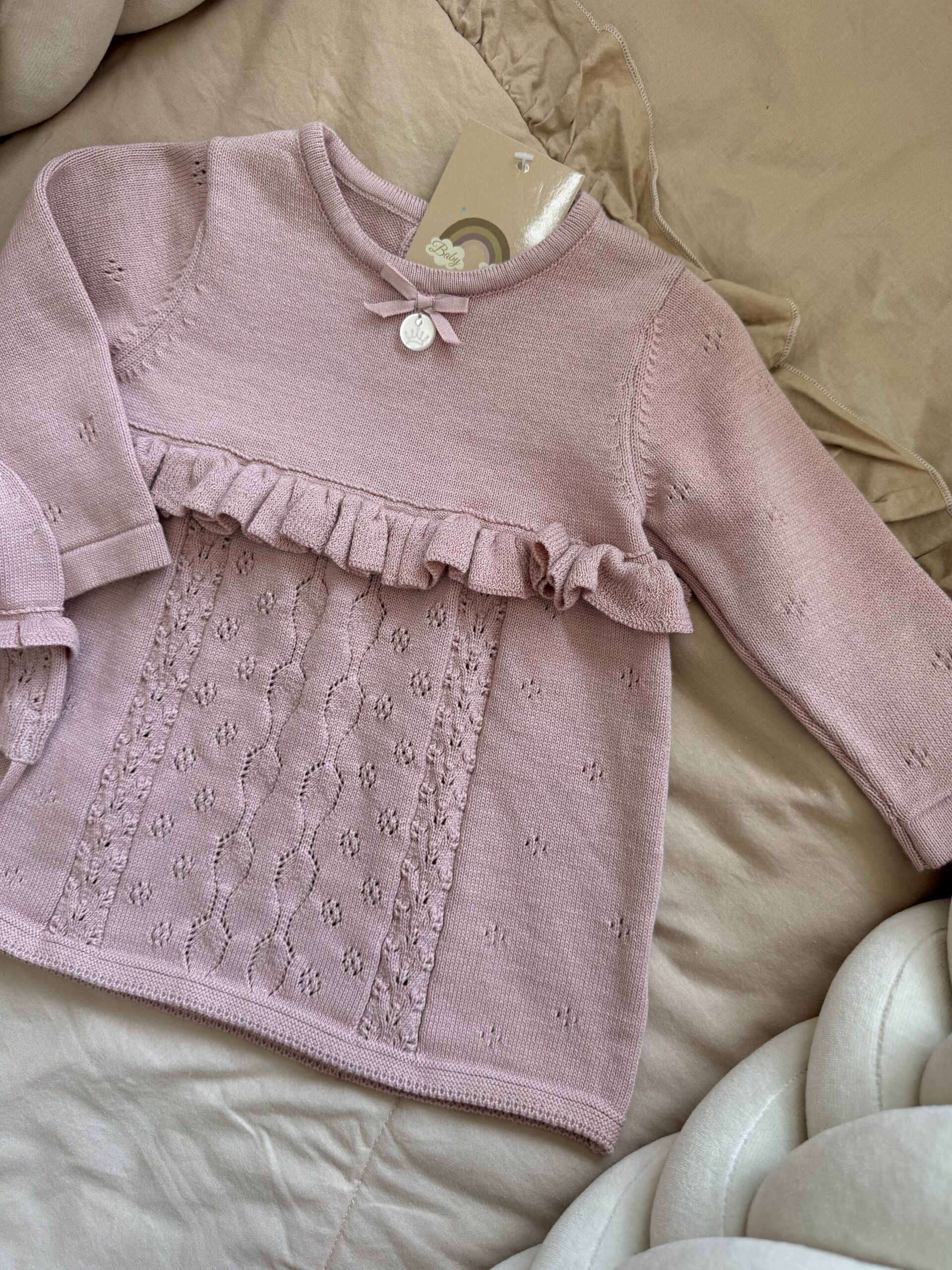 Prachtige pointelle breiwerk, een strikje en ruffle afwerkingen.