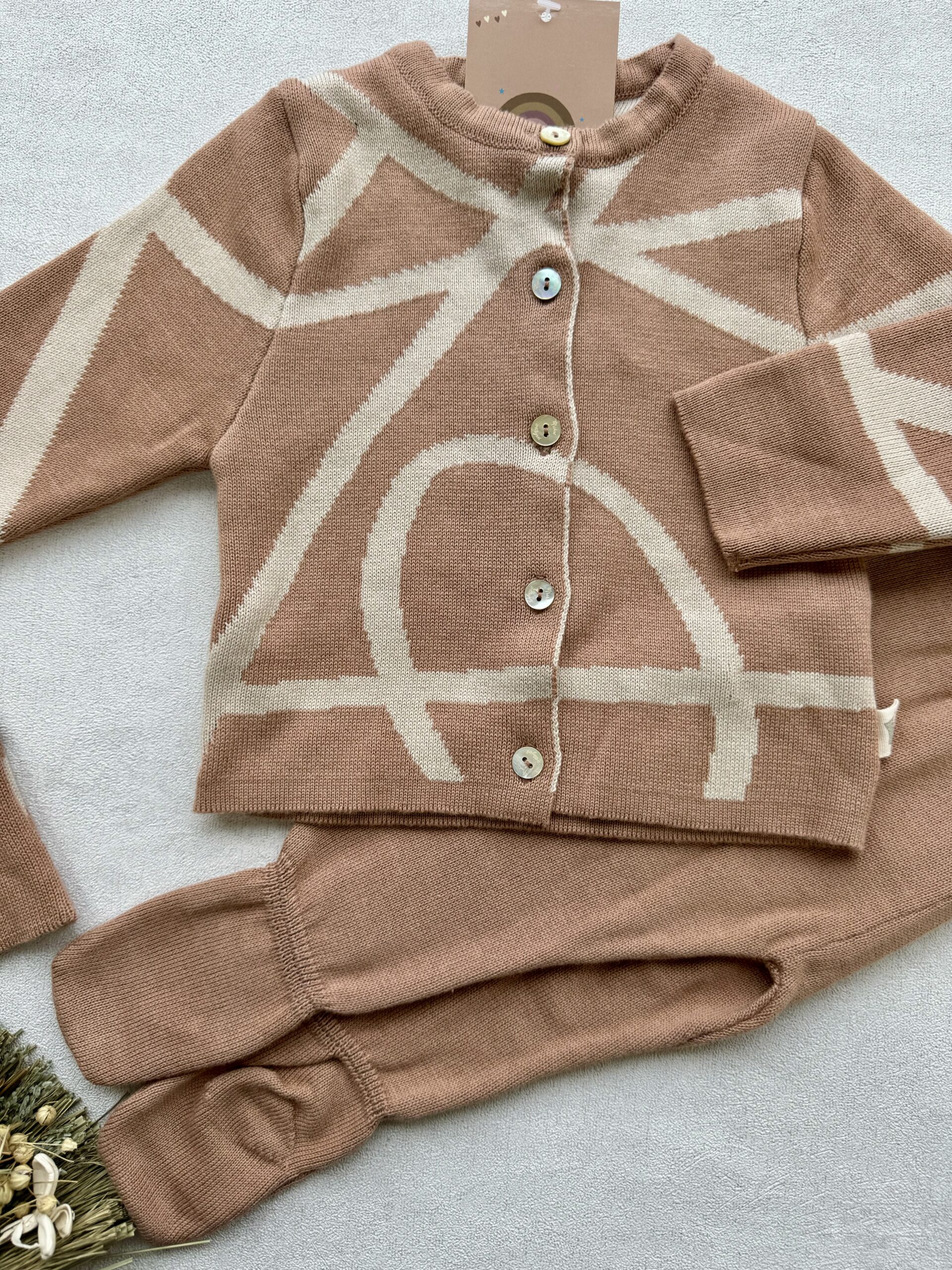 De set bestaat uit een gebreid vest, gebreid broekje en een gebreid mutsje in dezelfde stijl.