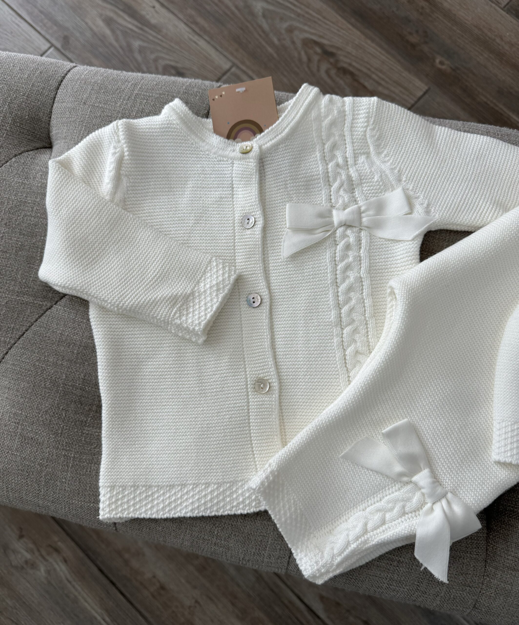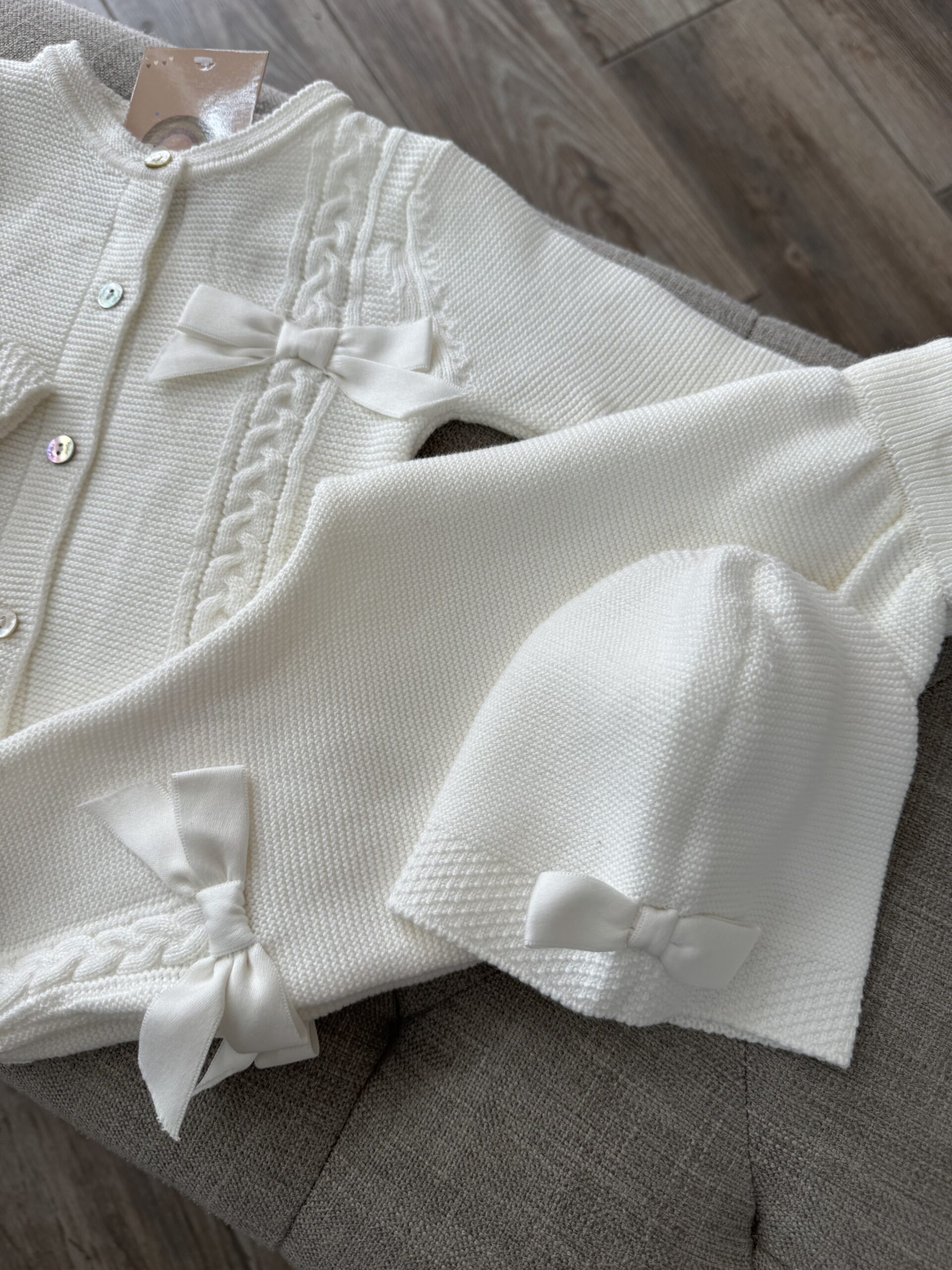 Strikjes op het broekje, een strik op het mutsje en een strik op het vestje.