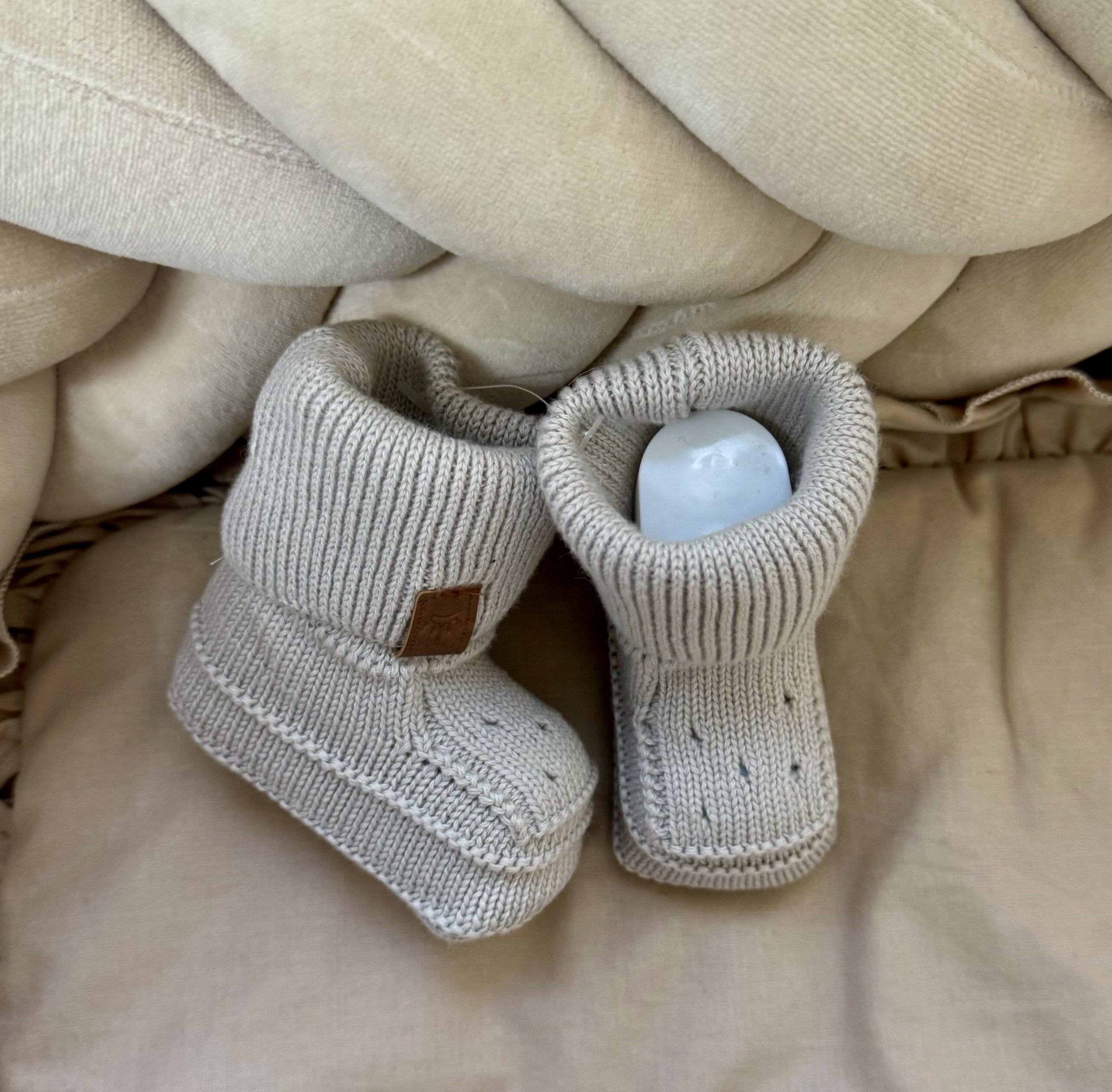 Gebreide booties/slofjes in de kleur Mink. De slofjes zijn gemaakt van 100% biologisch katoen.