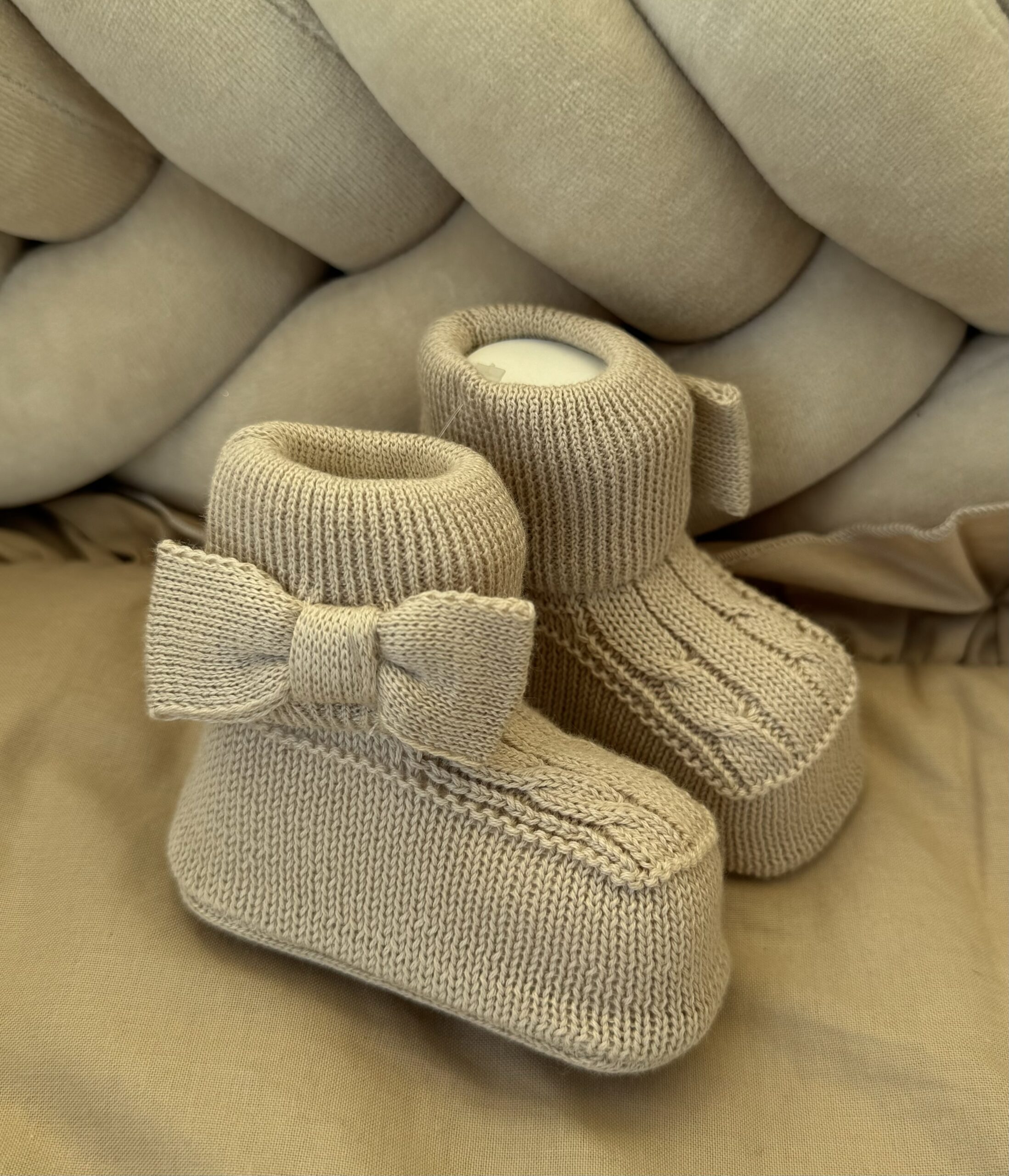 De slofjes hebben een gebreid motief en een grote strik aan de zijkant.