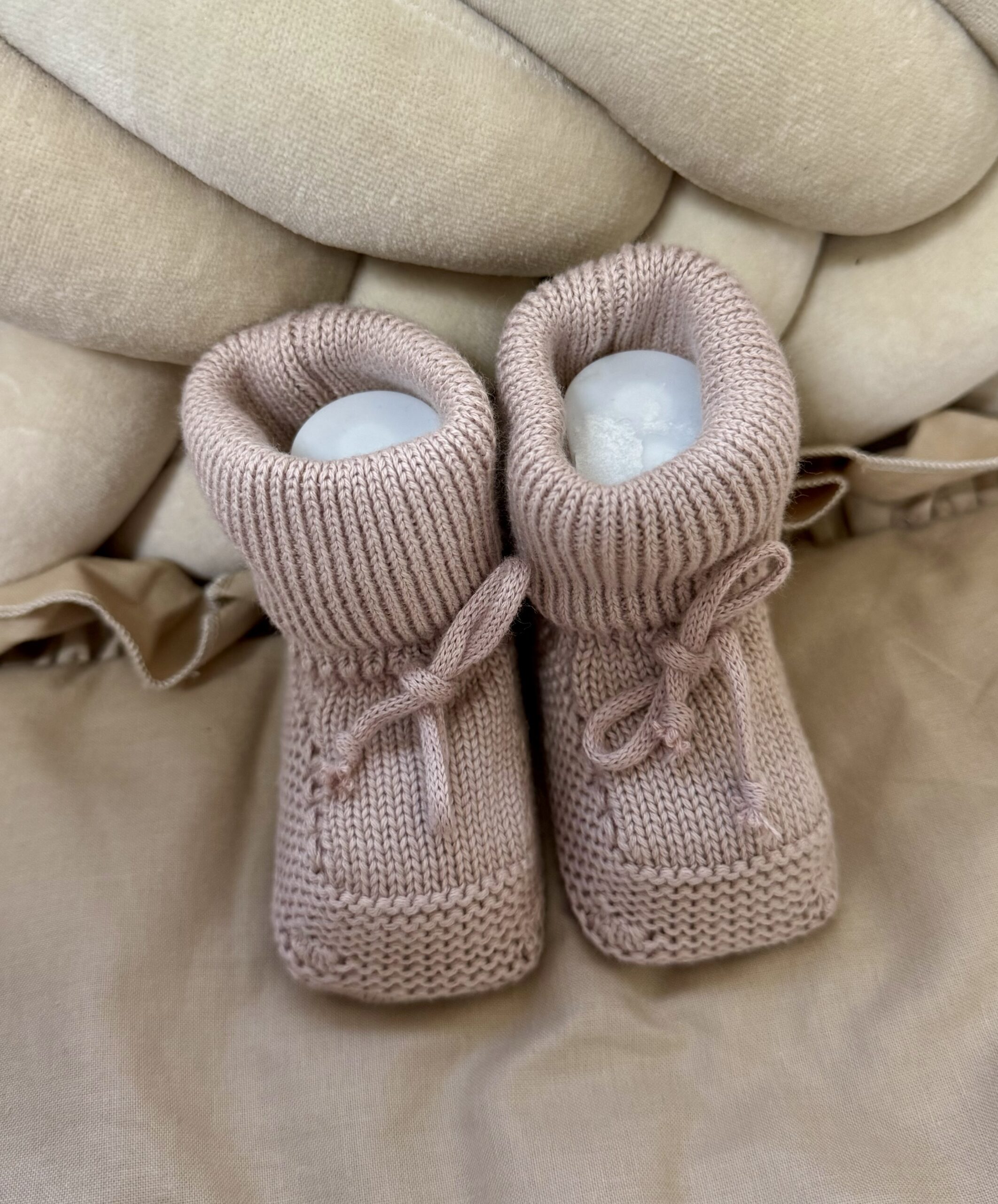 Gebreide booties/slofjes in de kleur RoseMary. De slofjes zijn gemaakt van 100% biologisch katoen.