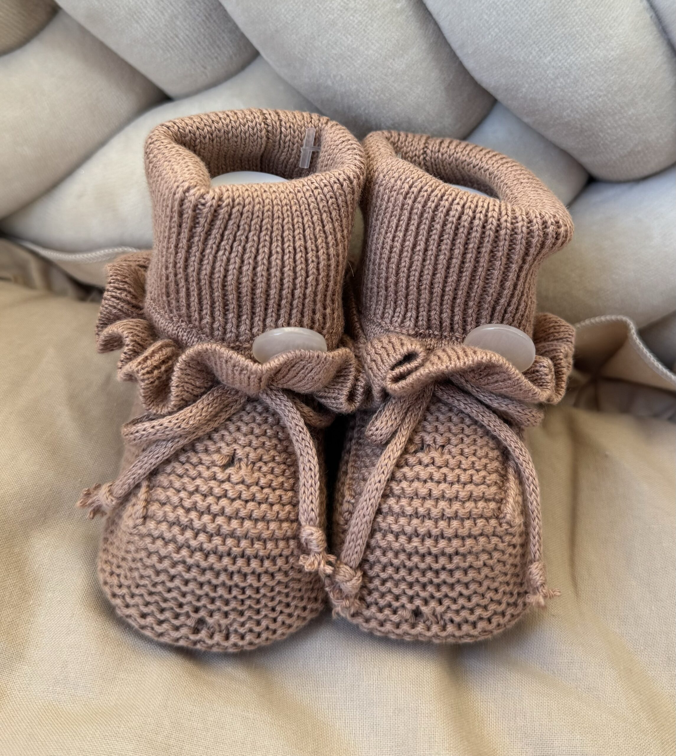 De slofjes hebben een gebreid motief en ruffle afwerkingen.