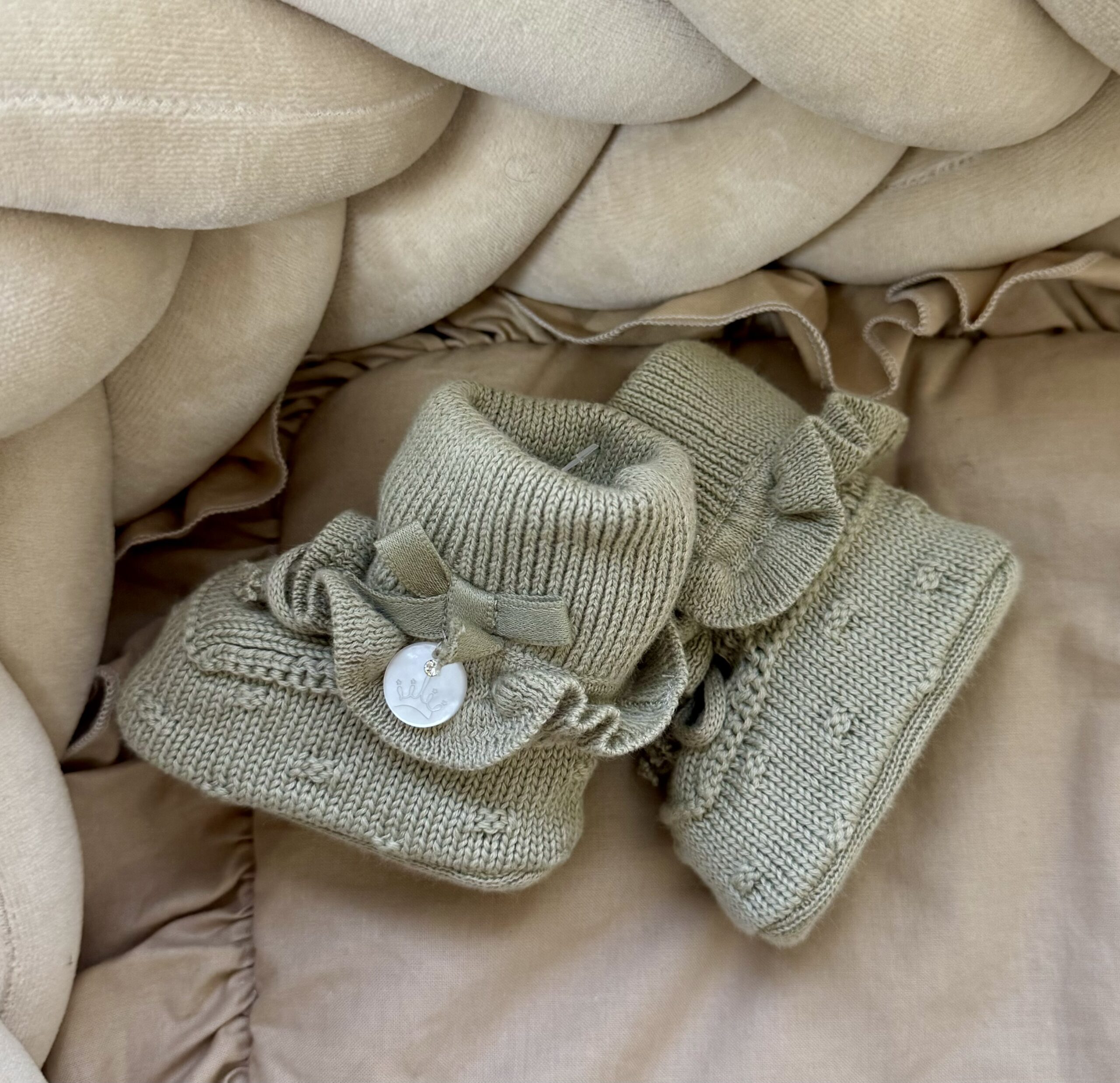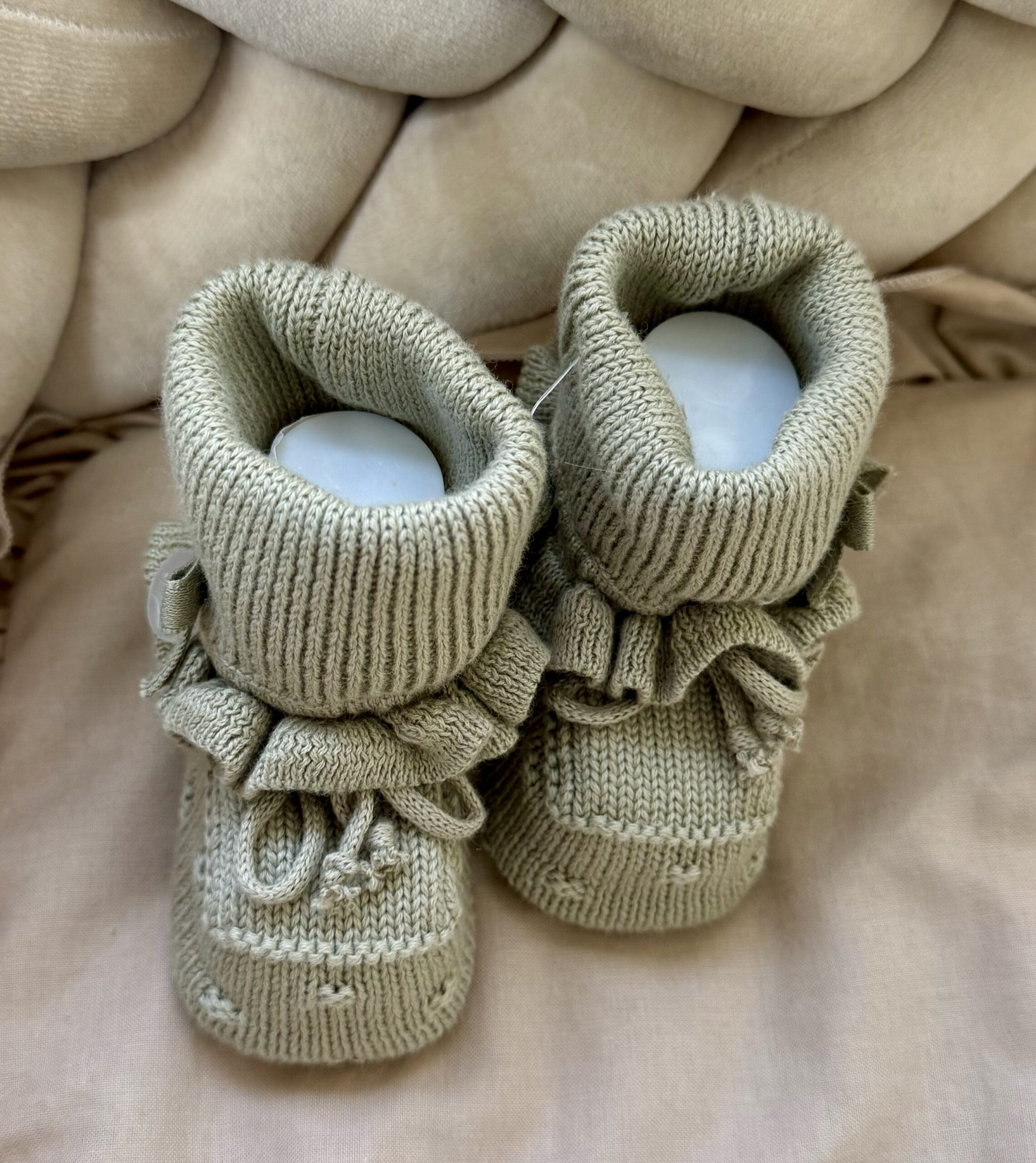 De slofjes hebben een ruffle afwerkingen, pointelle motief en een strik. De slofjes vallen als een 0-6 maanden.