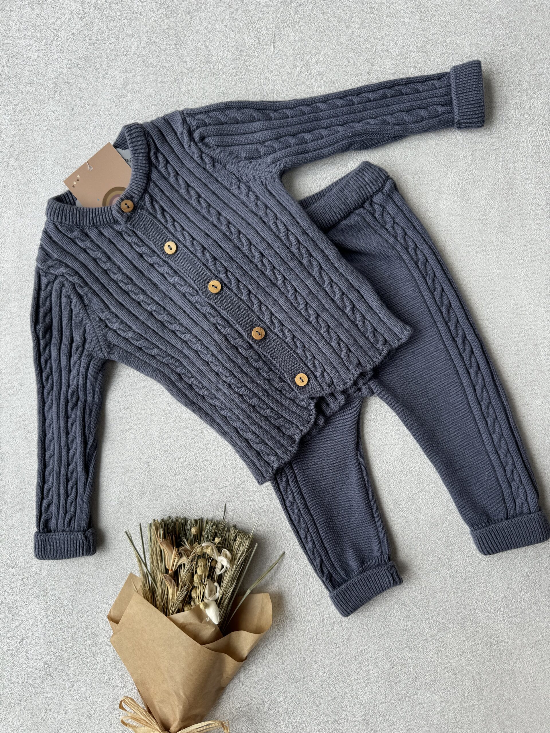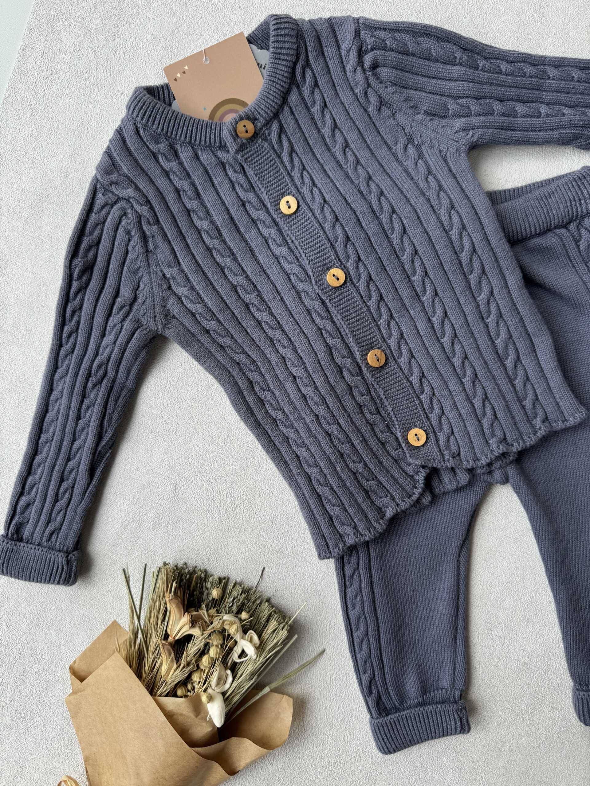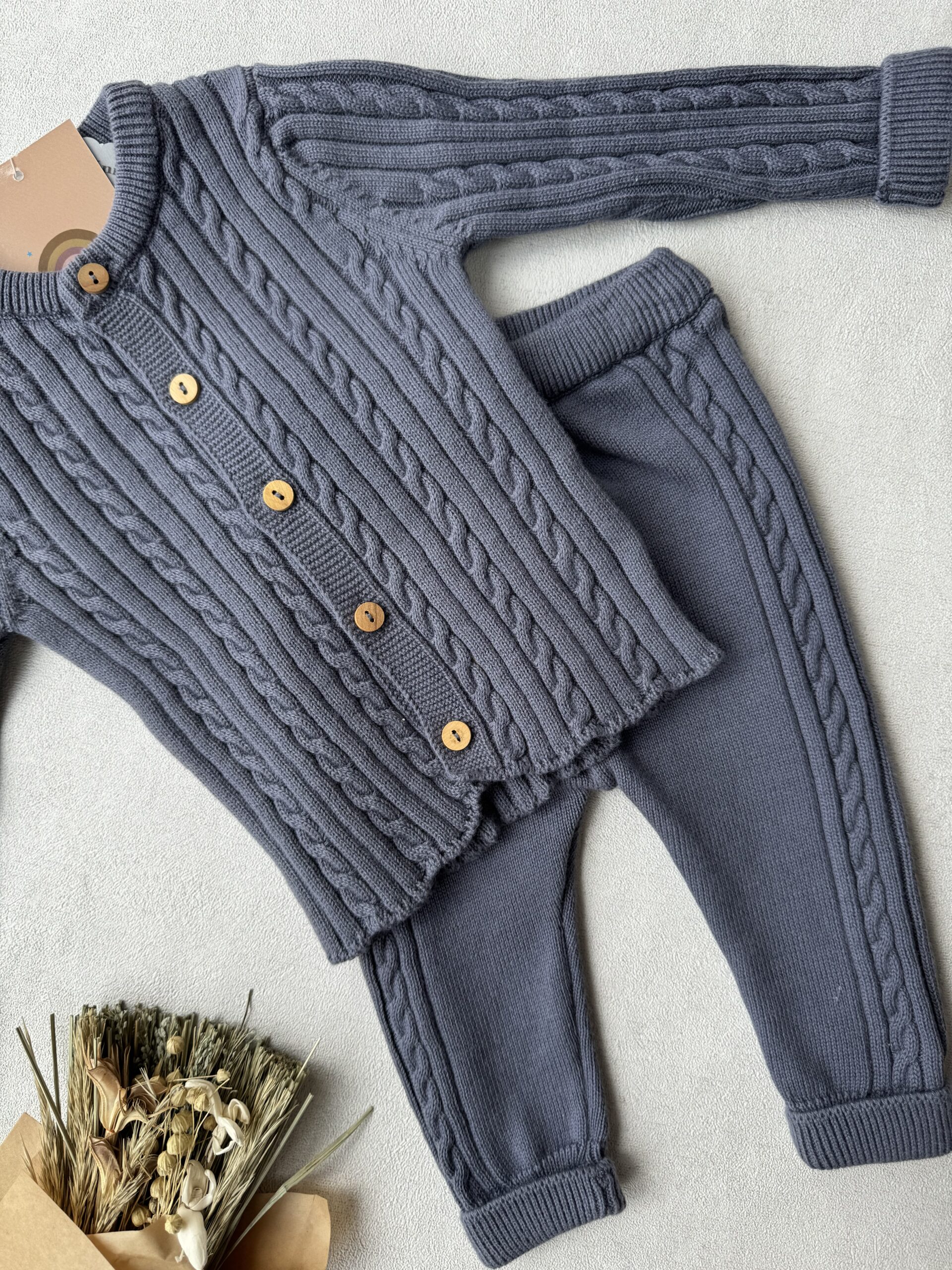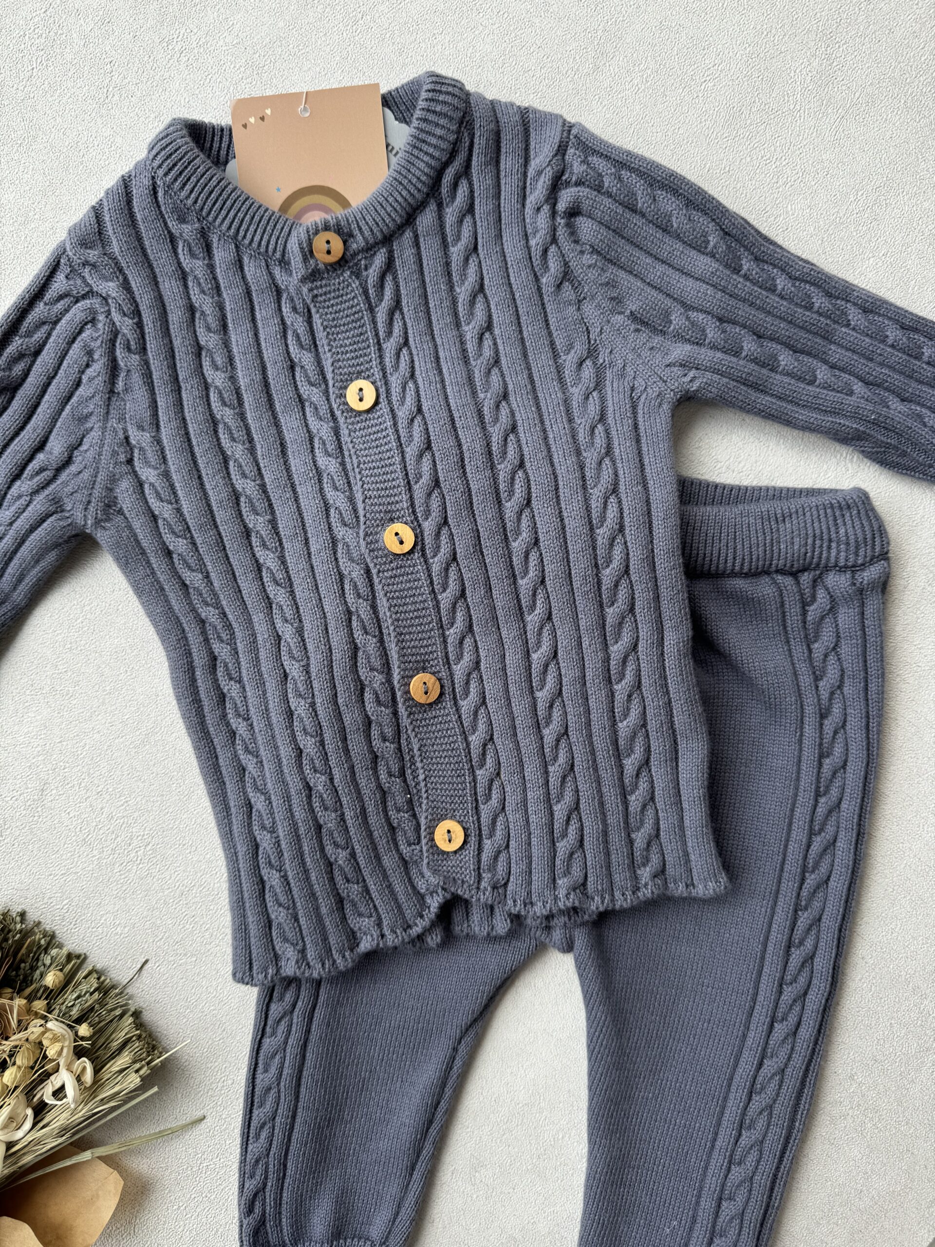 De set heeft een Cable brei patroon en is verkrijgbaar in een 0-3 maanden.