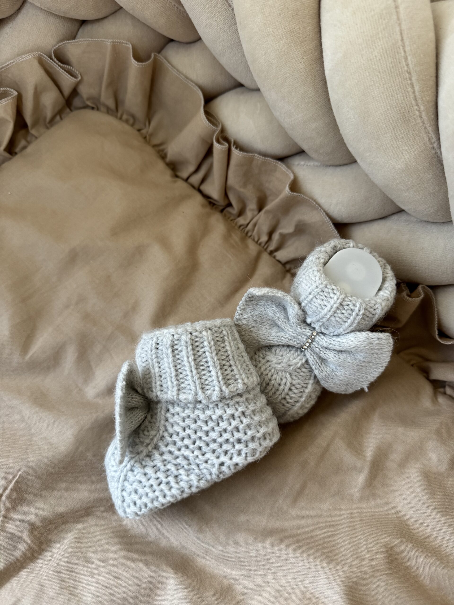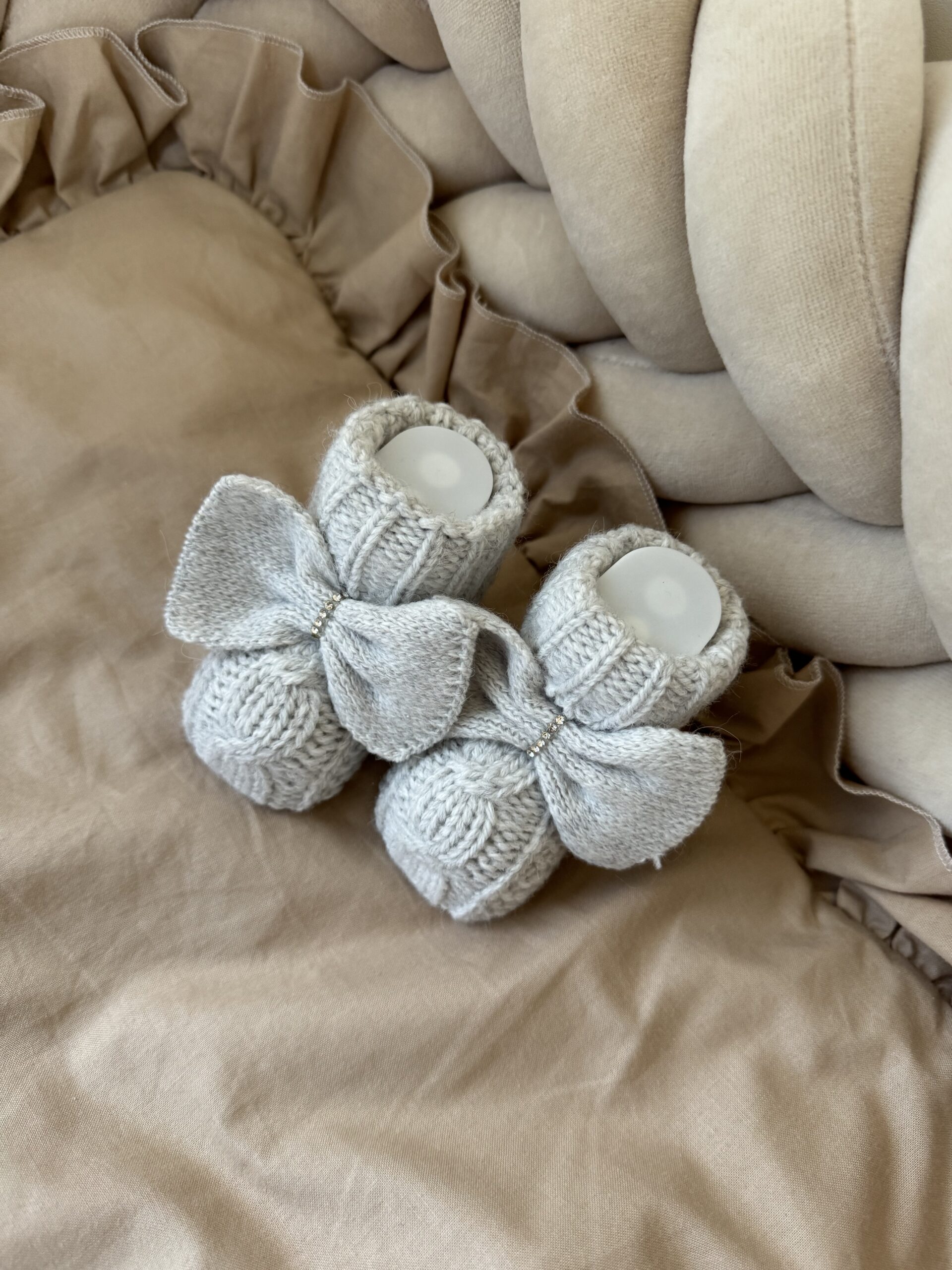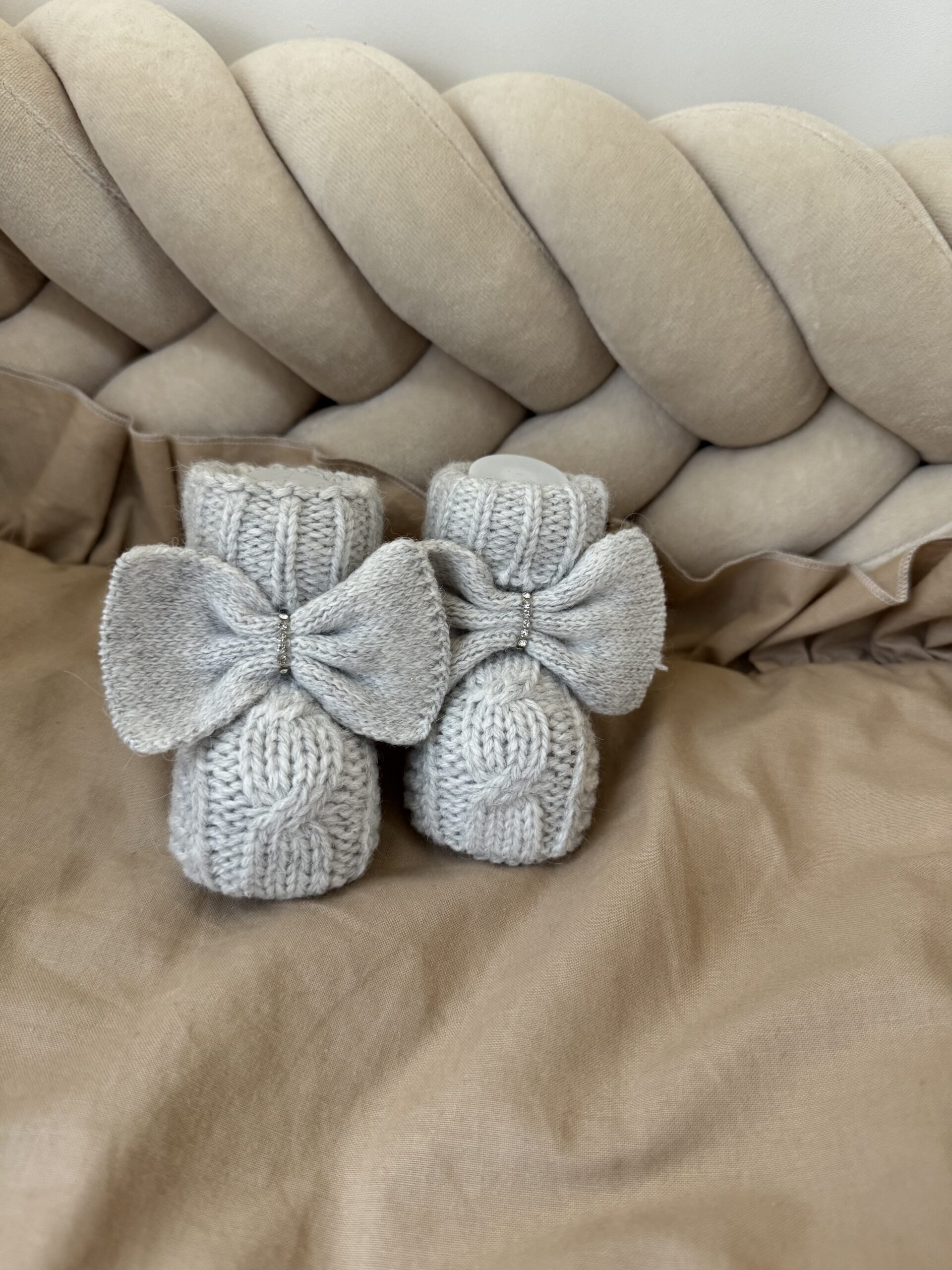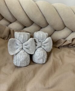 Gebreide slofjes van 100% wol. De slofjes zijn gebreid, hebben een grote strik met diamantjes.
