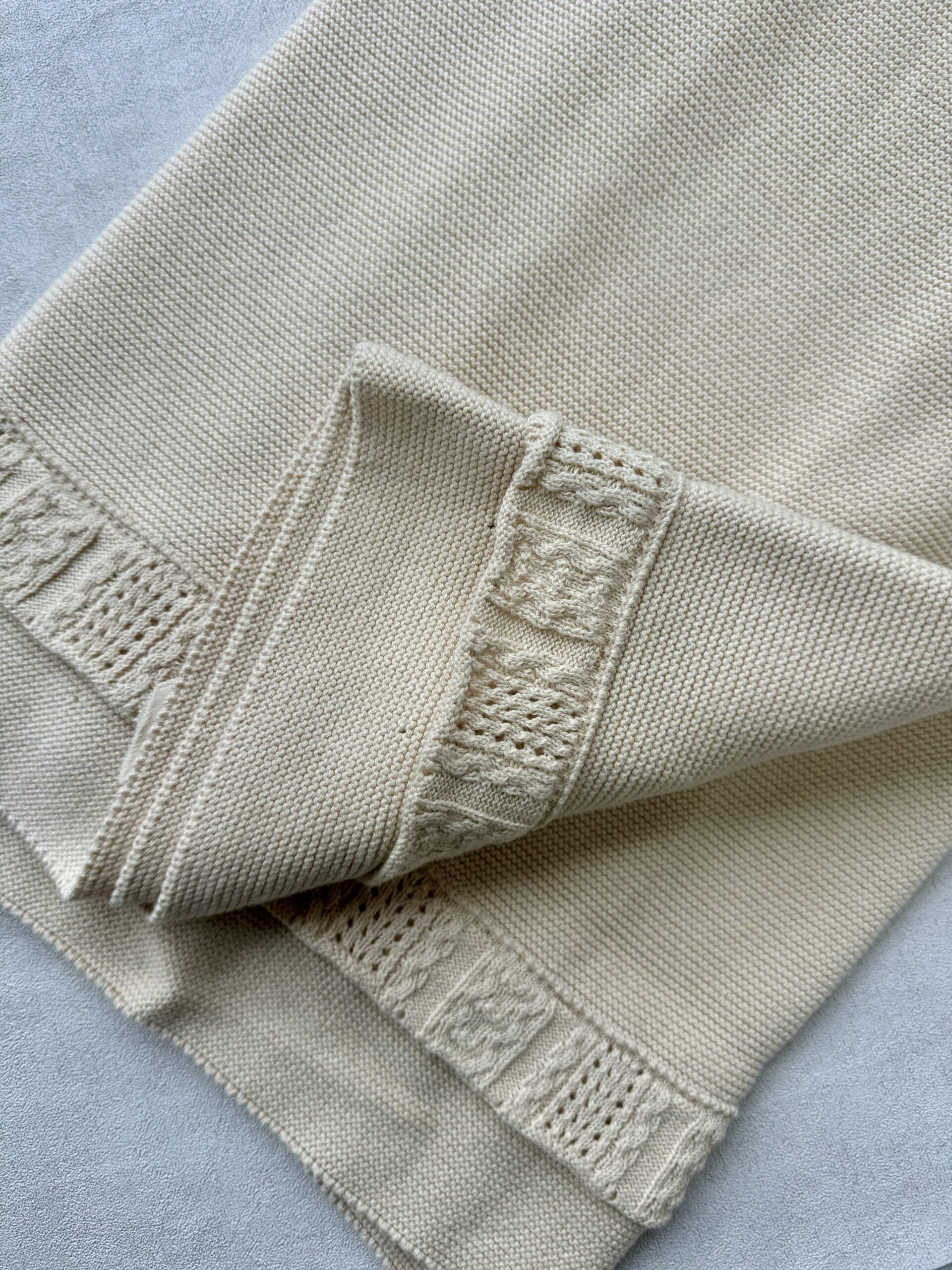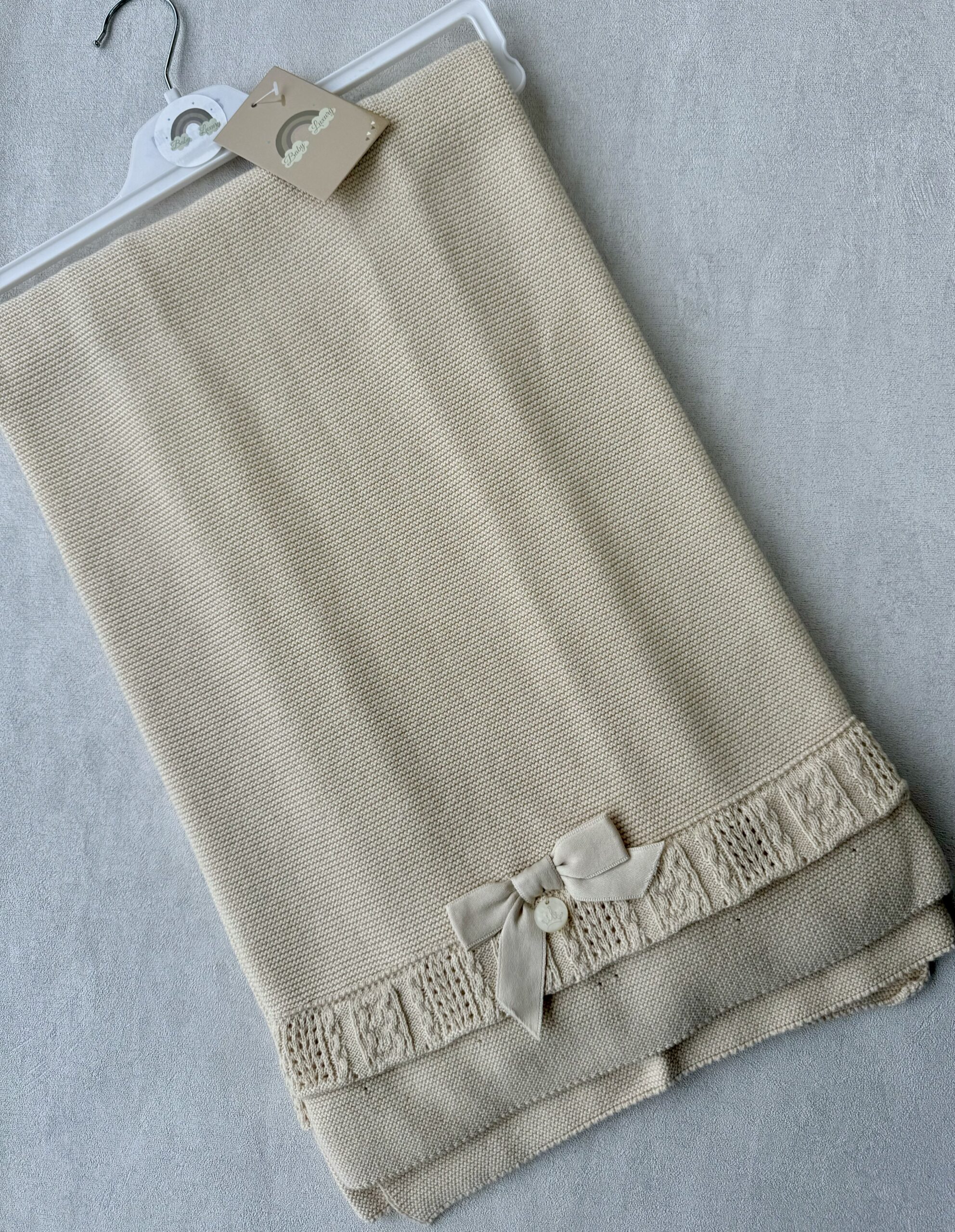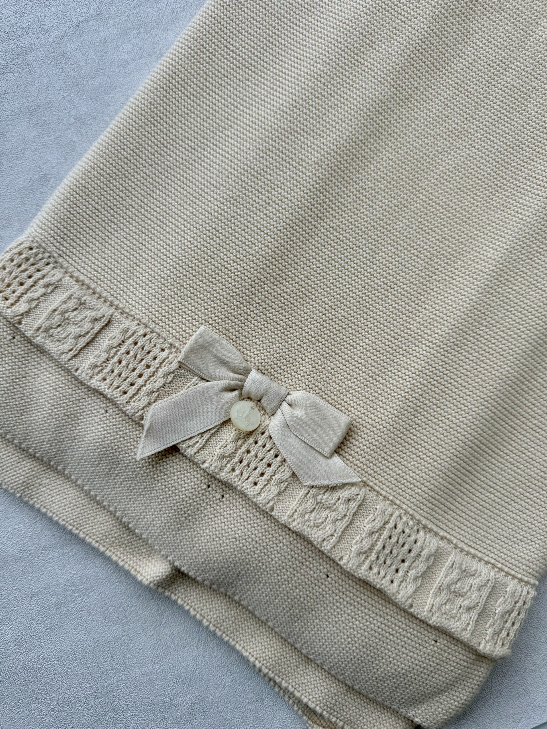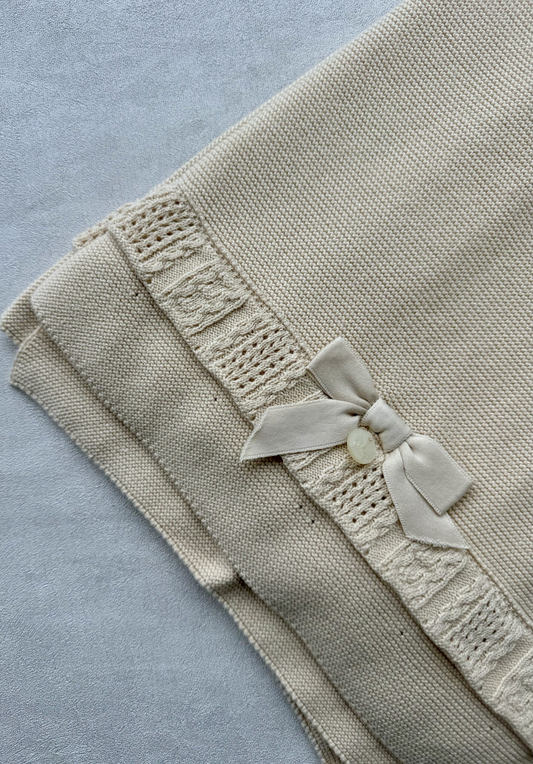 De wiegdeken heeft een gebreid broderie motief en een strik.