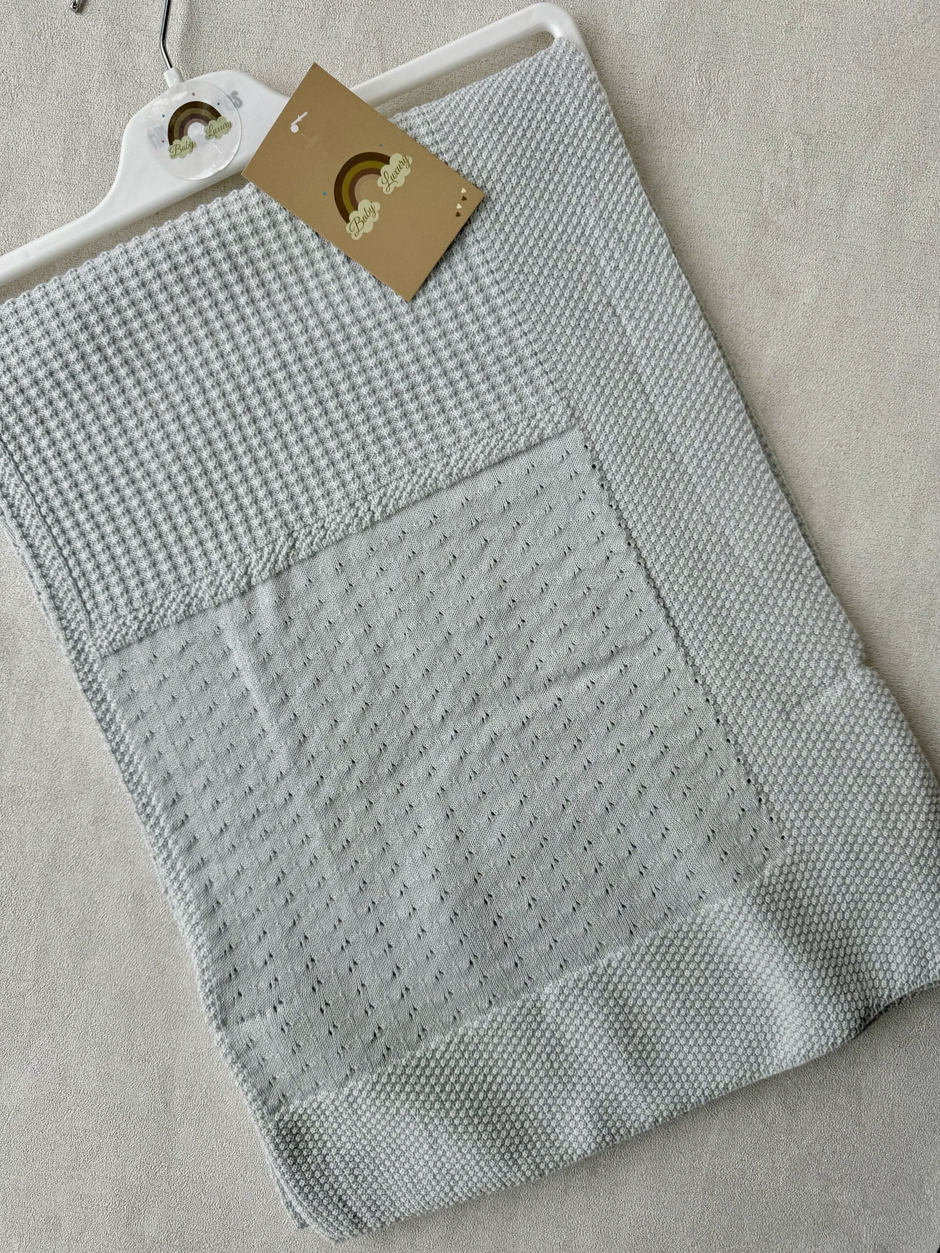 De wiegdeken heeft een gebreid motief.