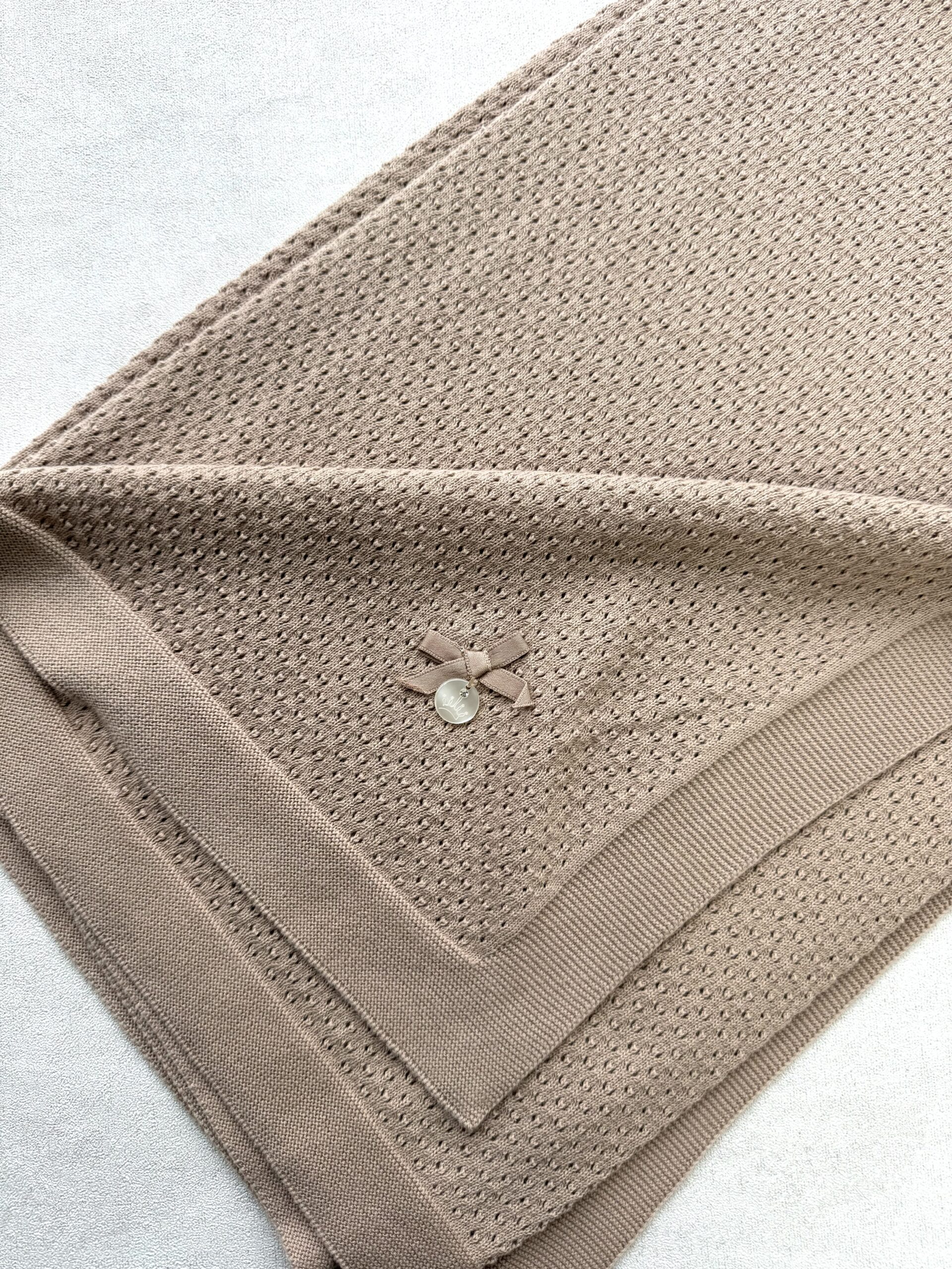 De wiegdeken heeft een gebreid motief en eemmstrik detail.