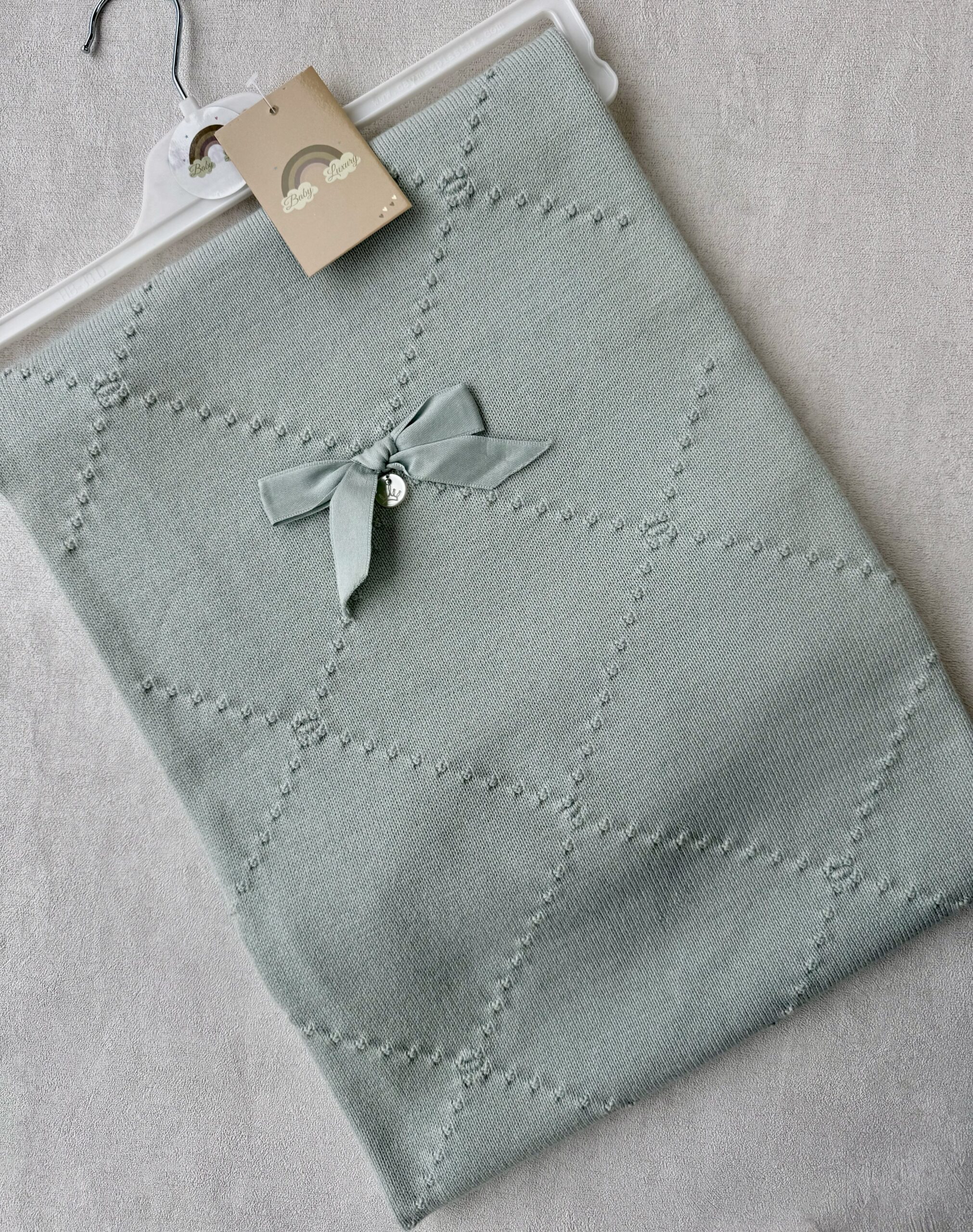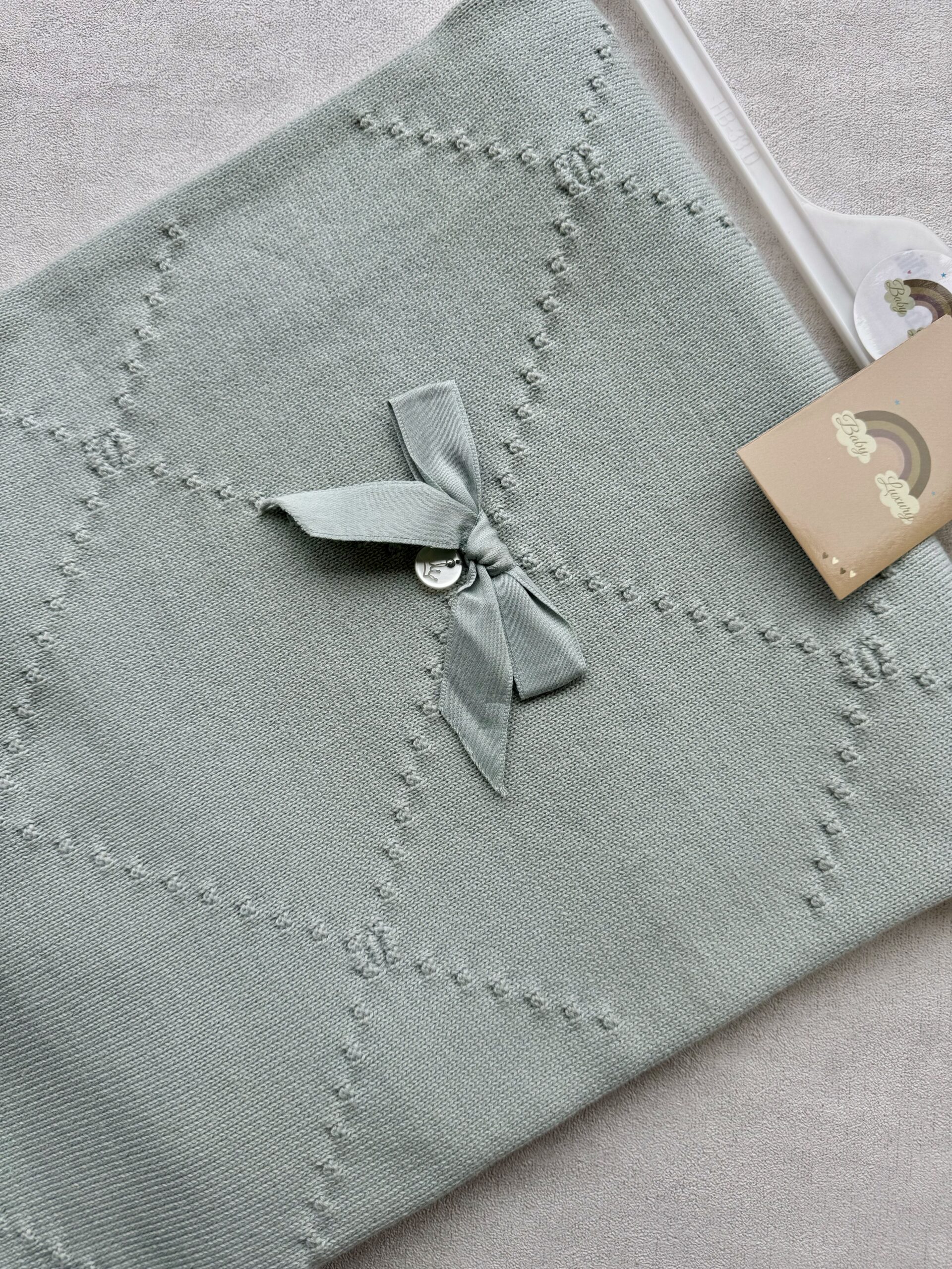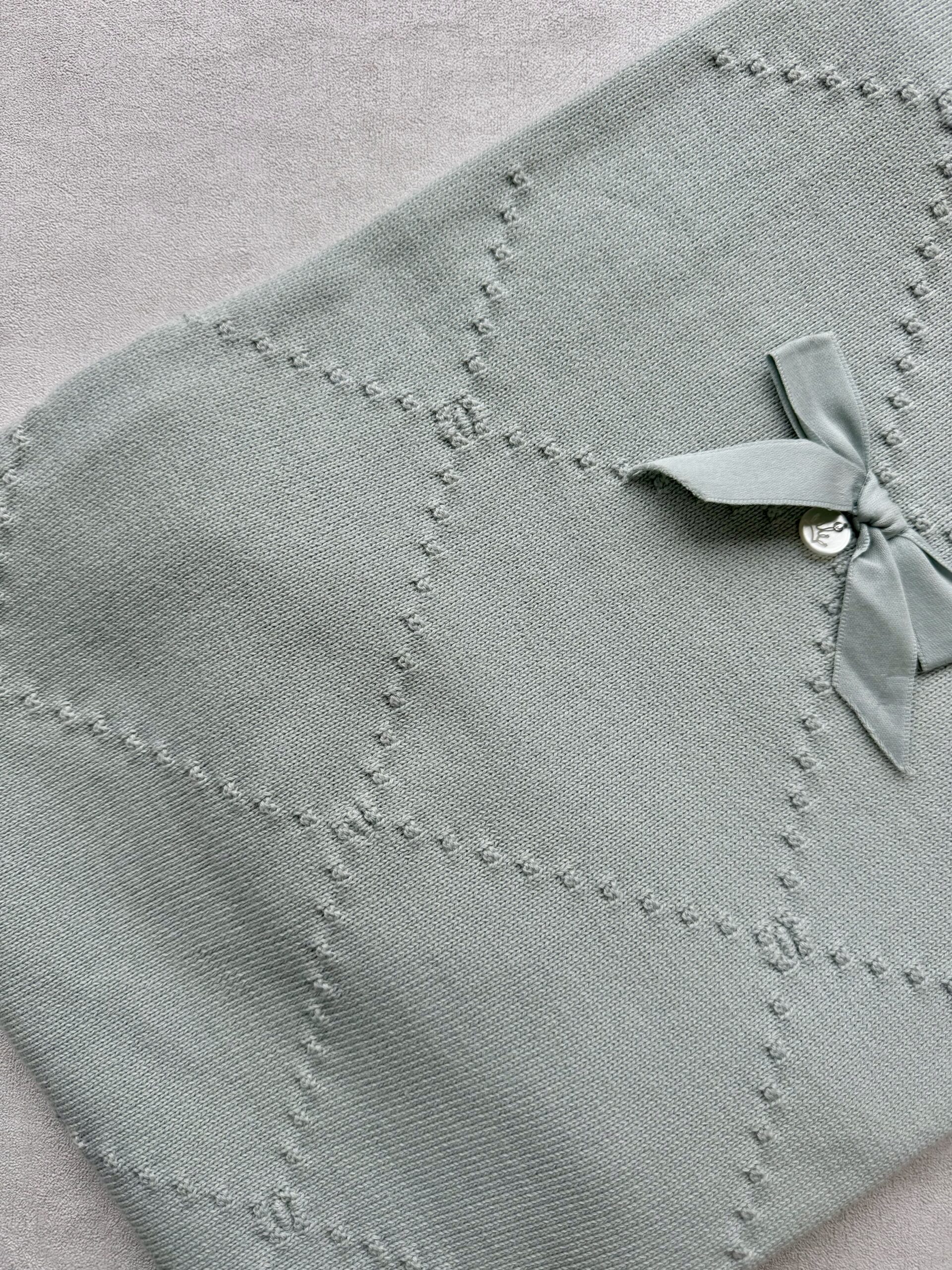 De wiegdeken heeft een gebreid broderie motief en een strik.
