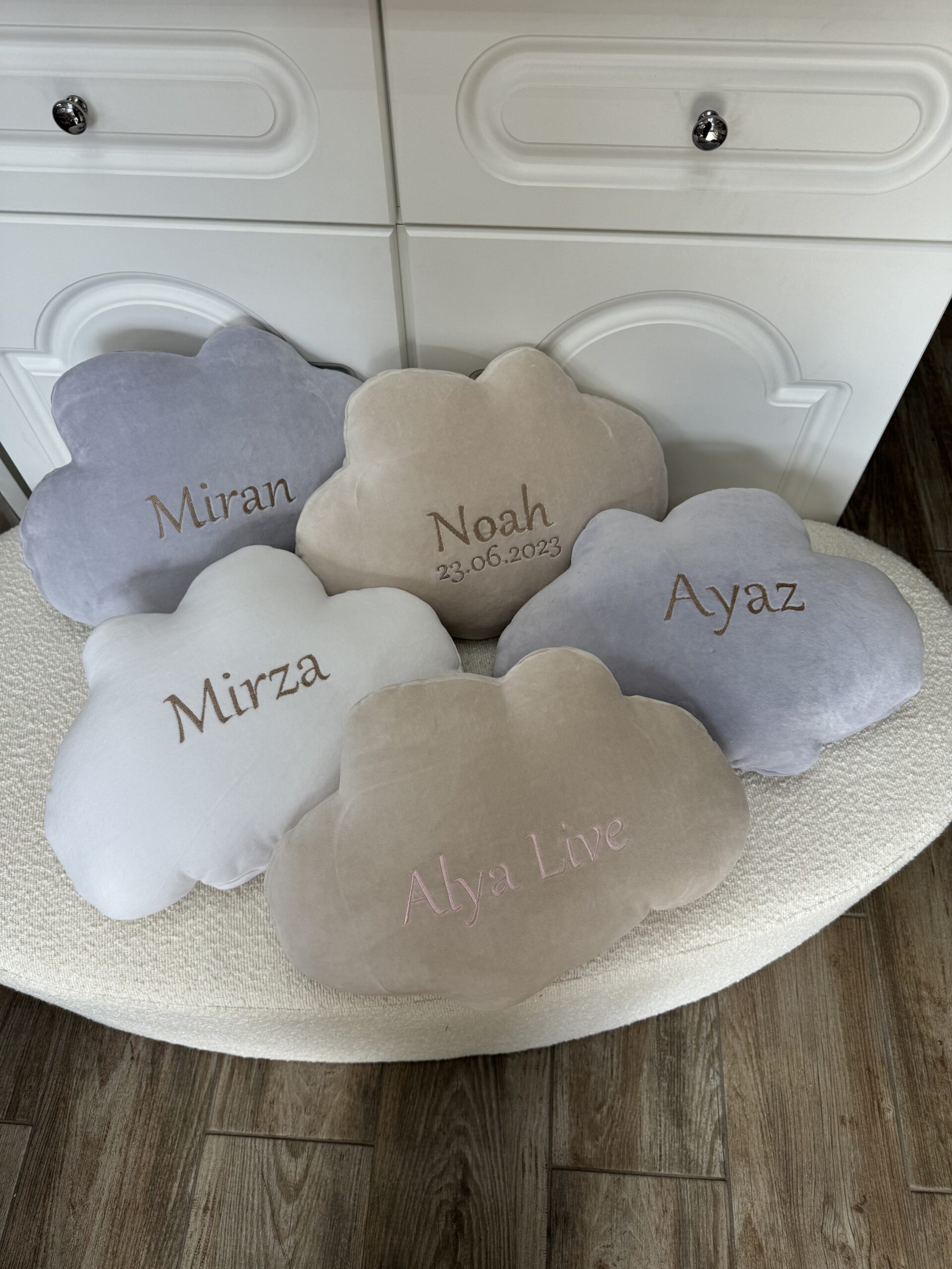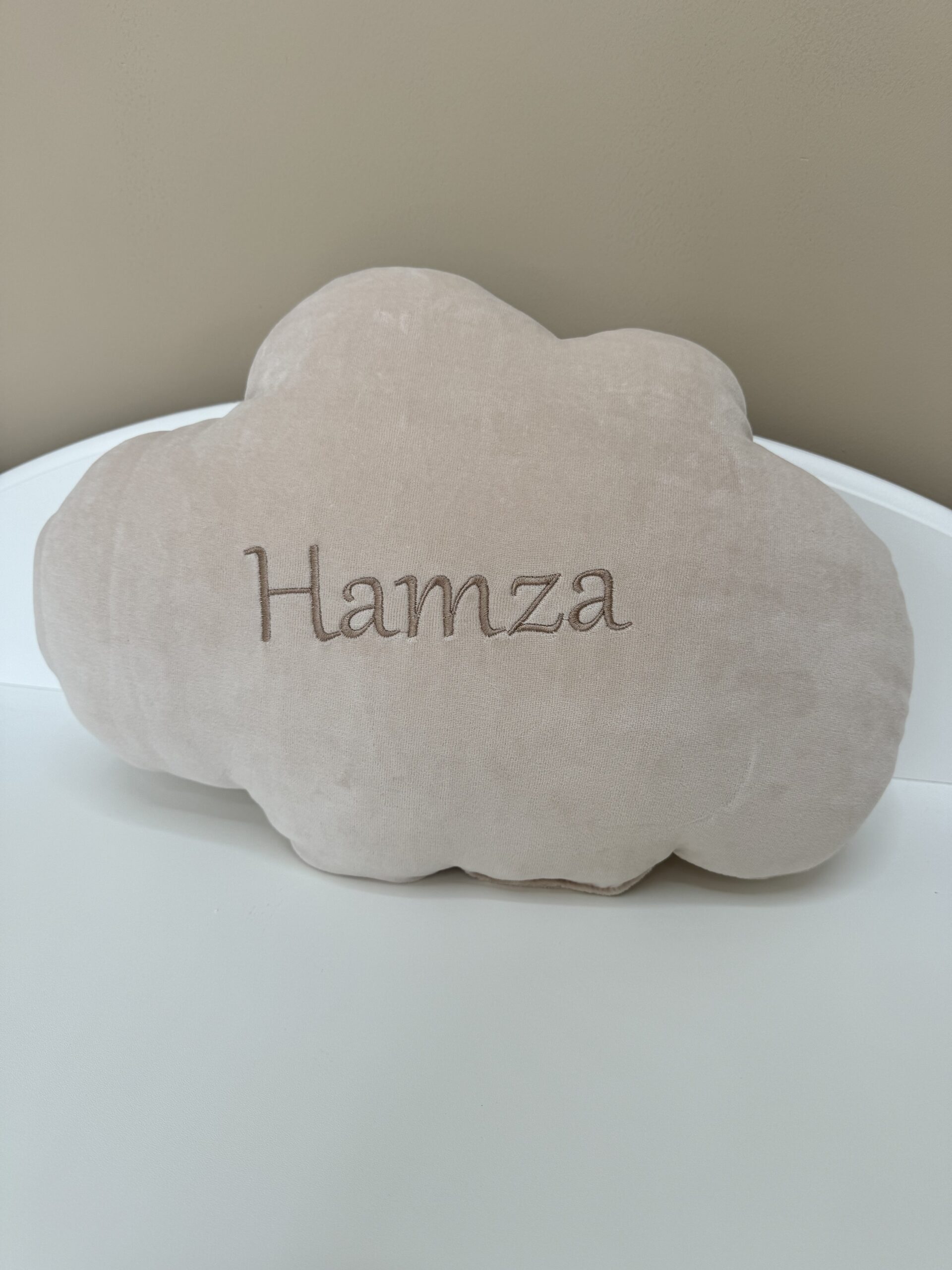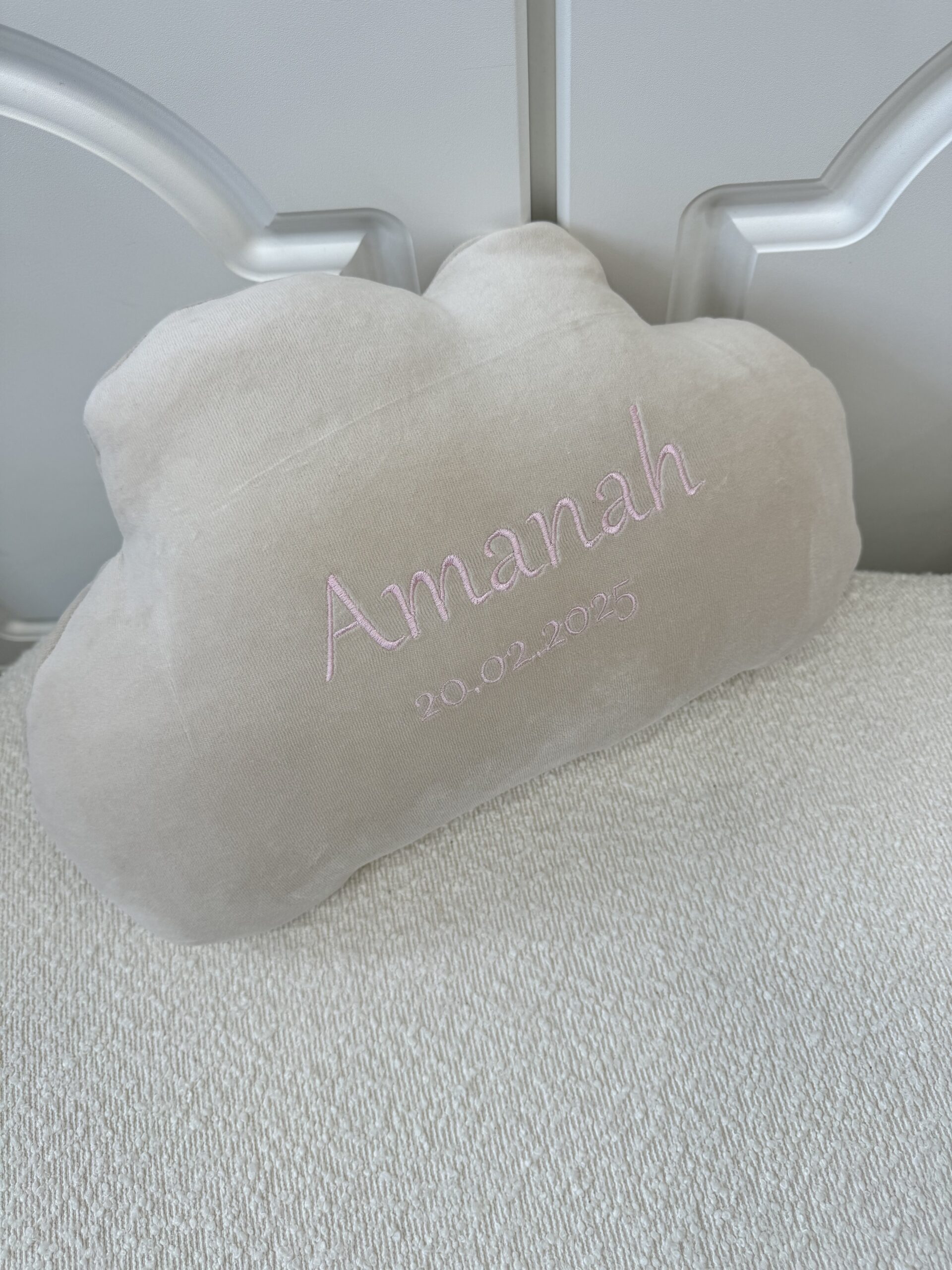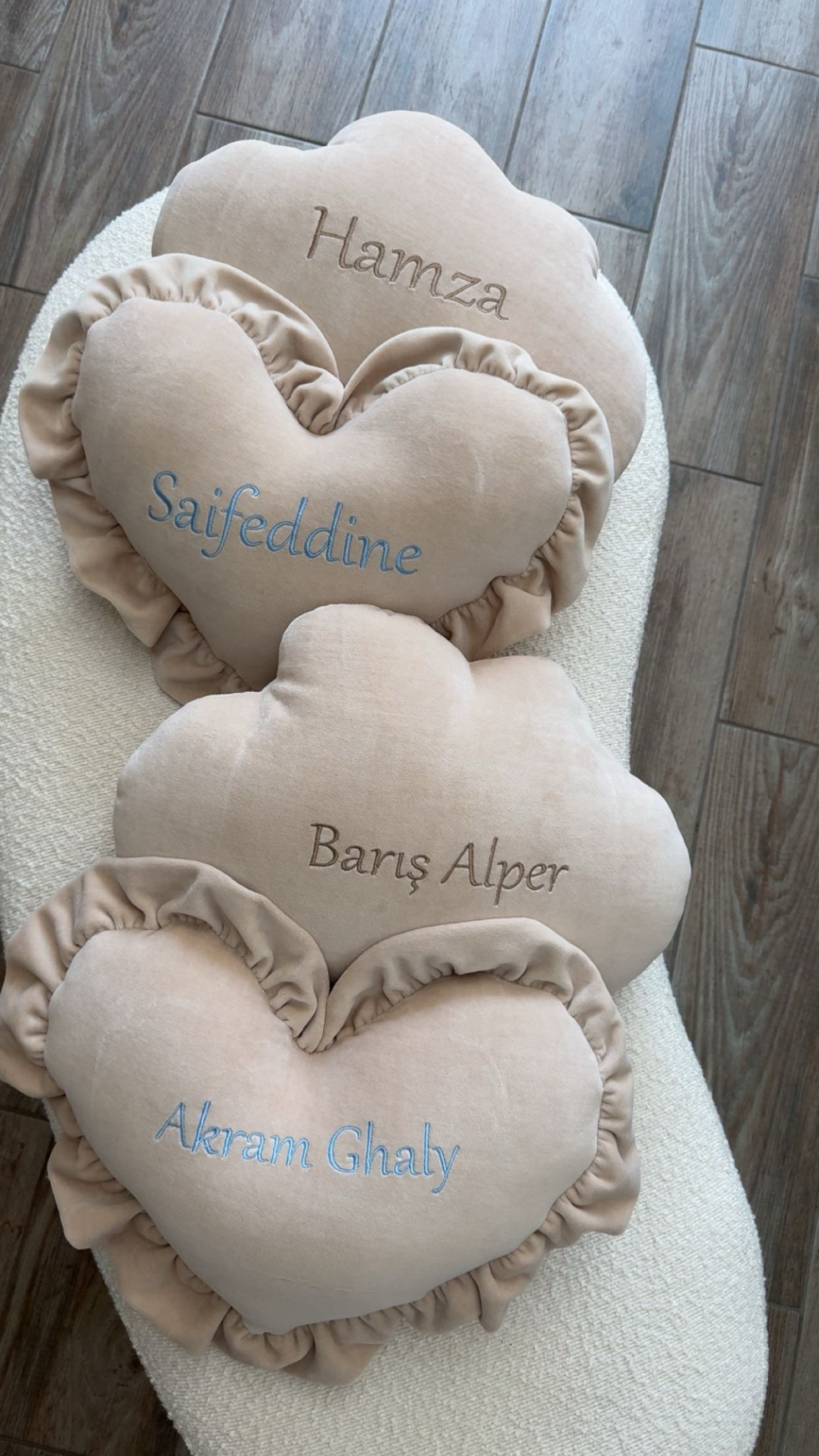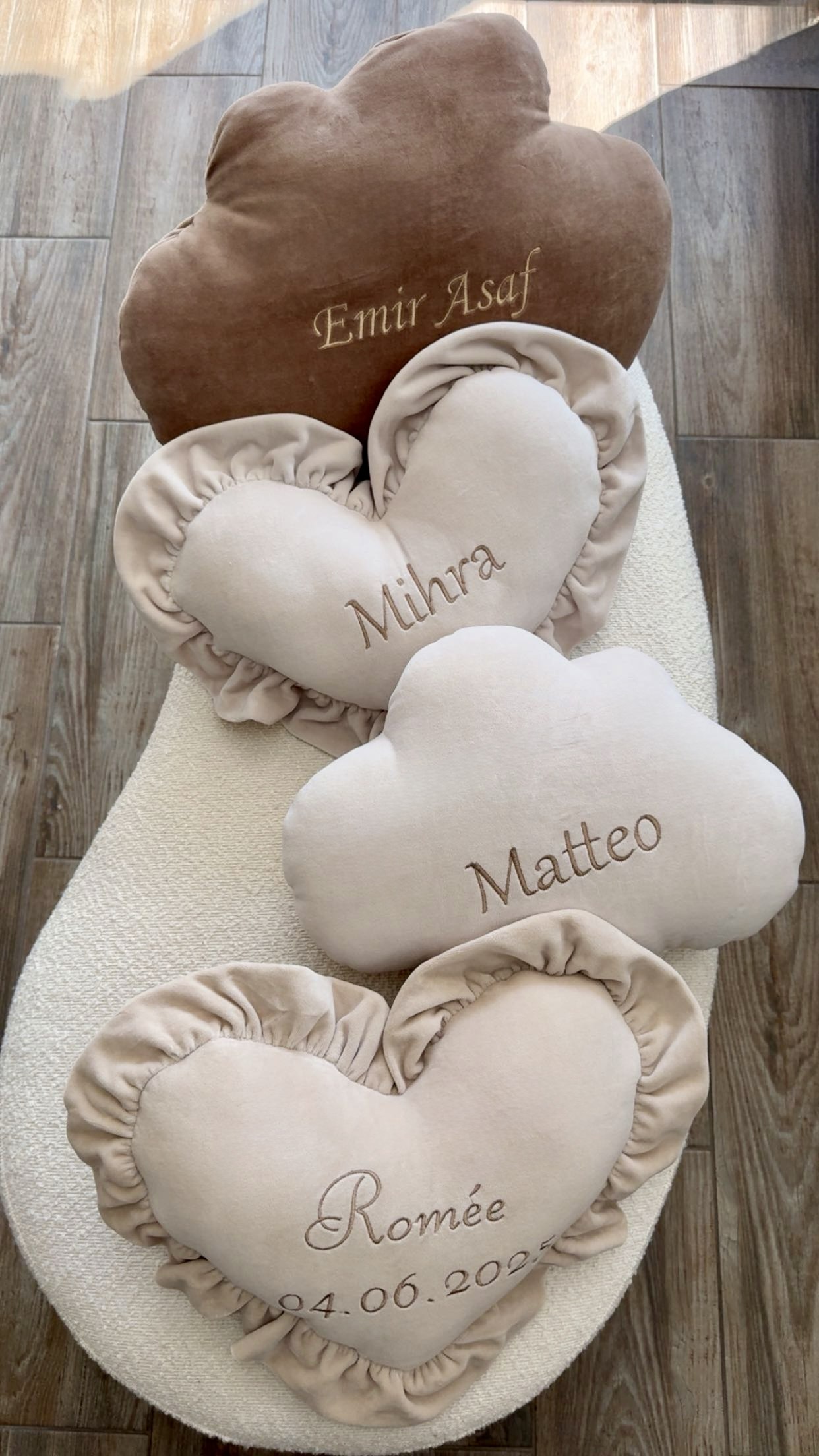 De handgemaakte kussens met geborduurde naam zijn verkrijgbaar in 45 cm en 55 cm.