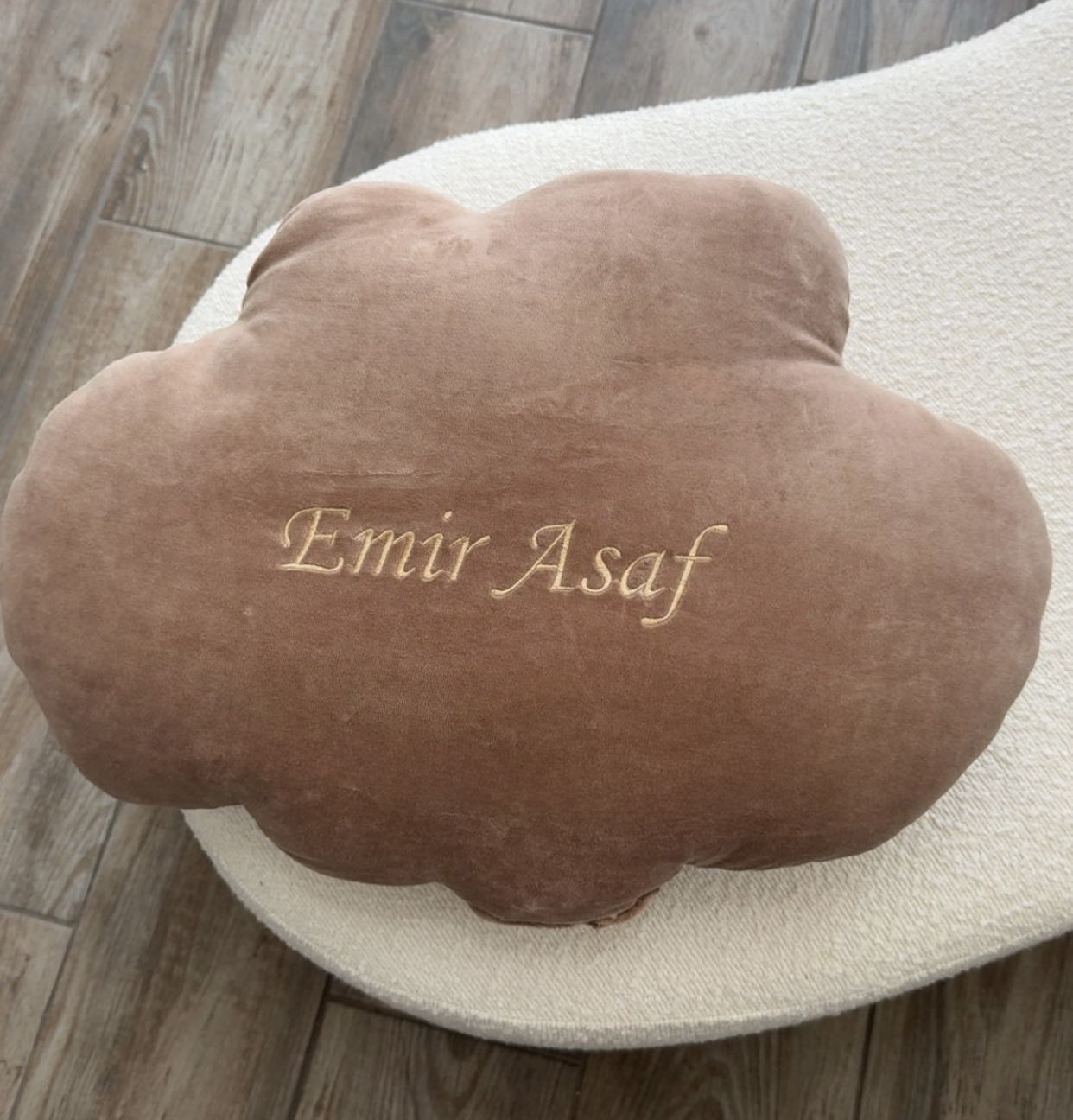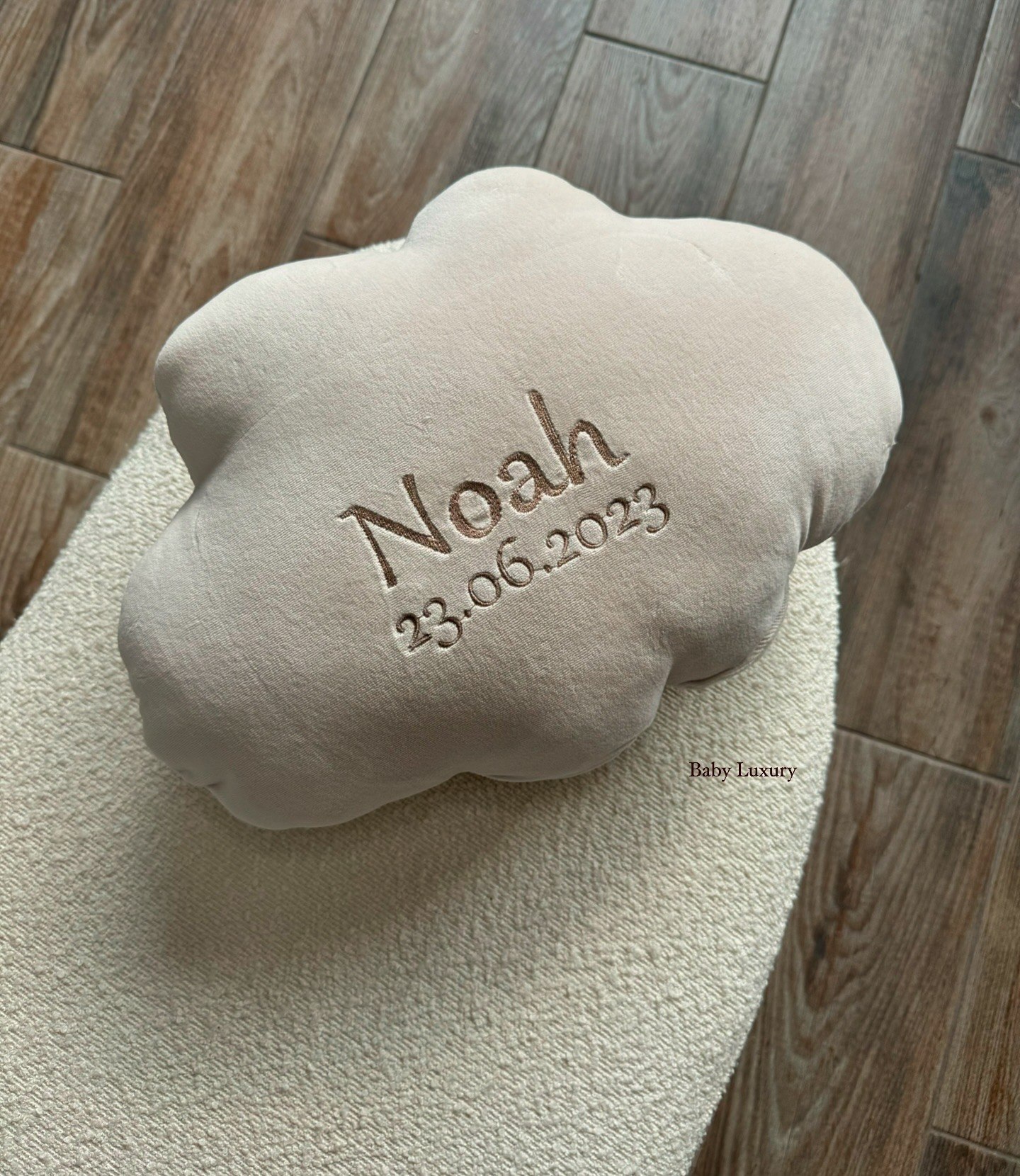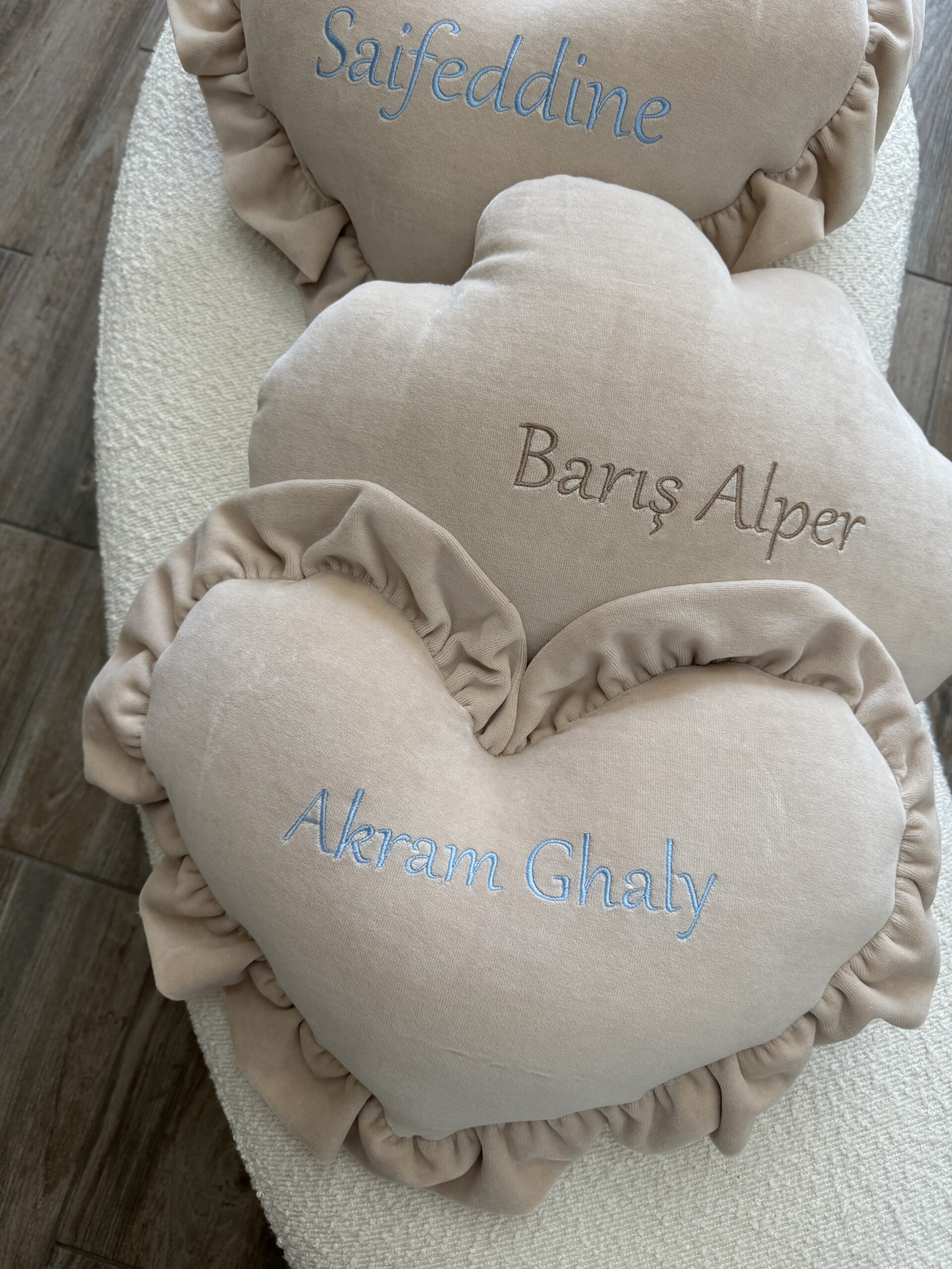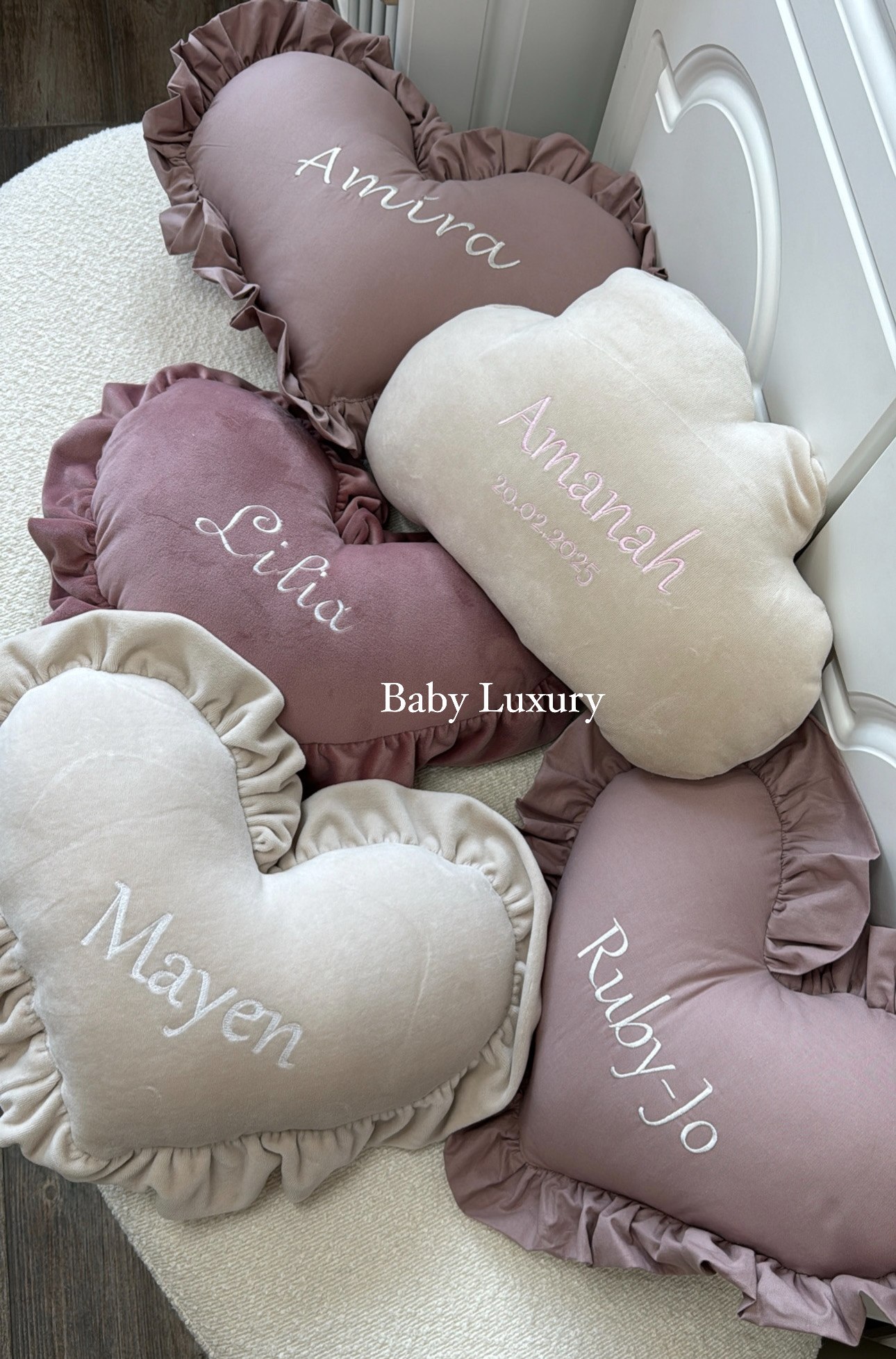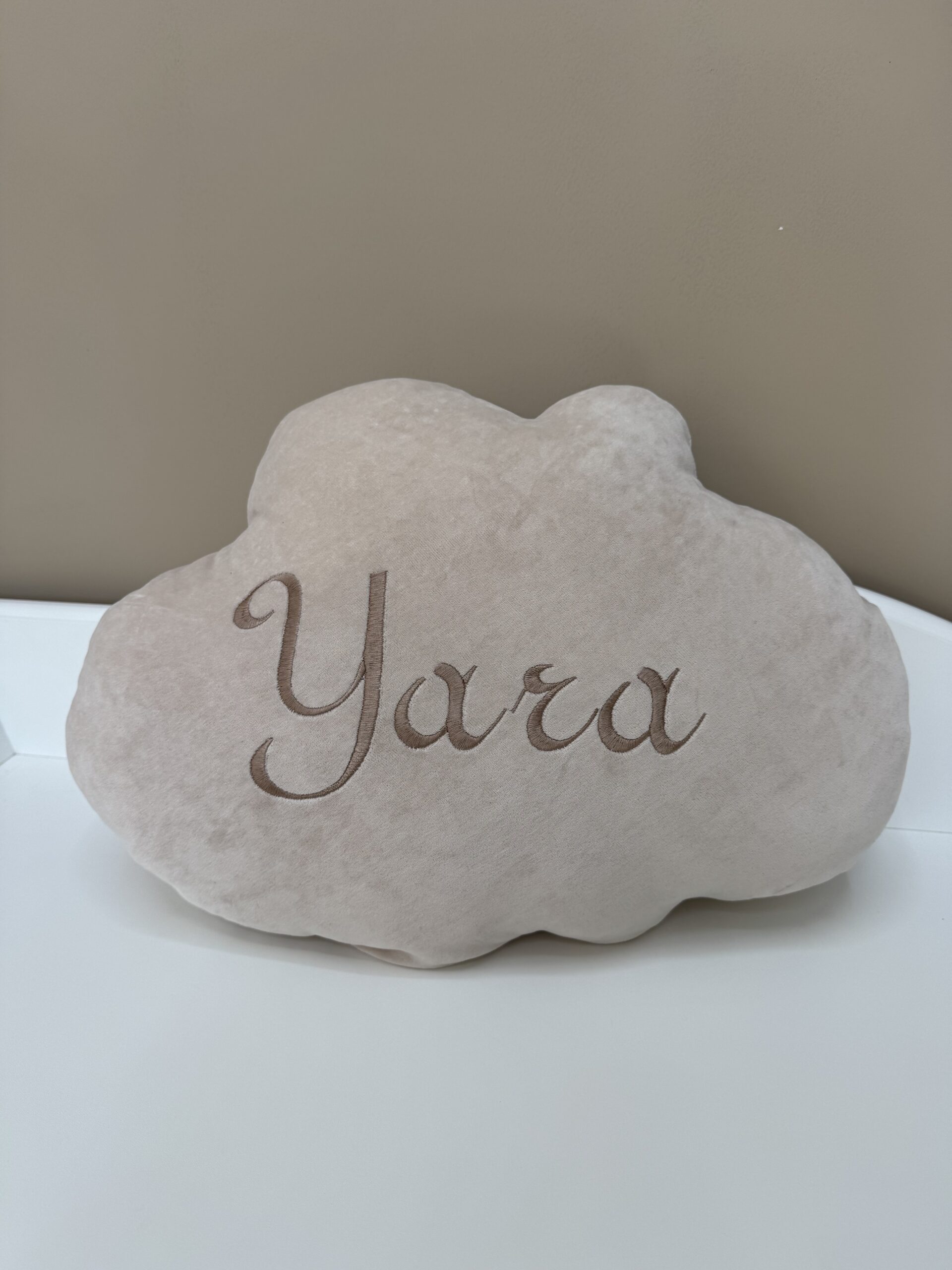 De handgemaakte kussens met geborduurde naam zijn verkrijgbaar in 45 cm en 55 cm.