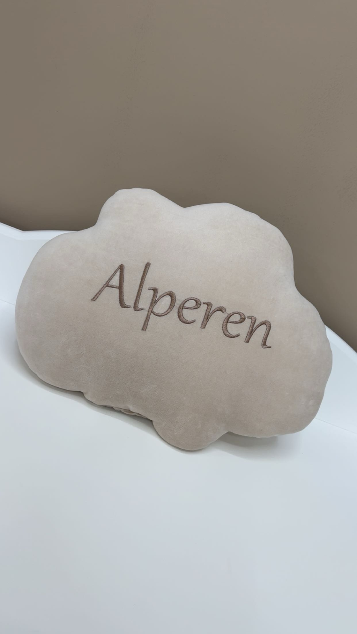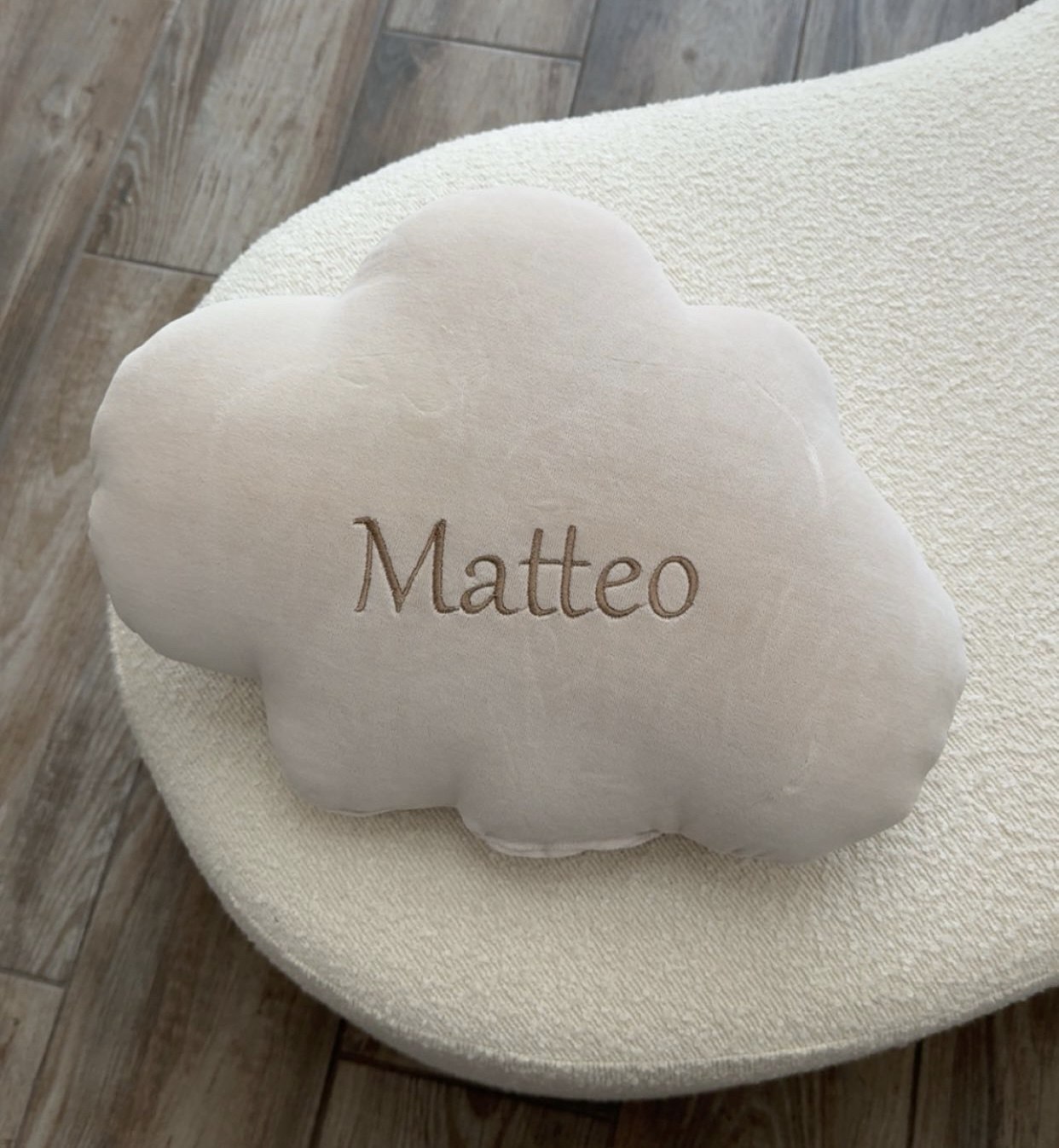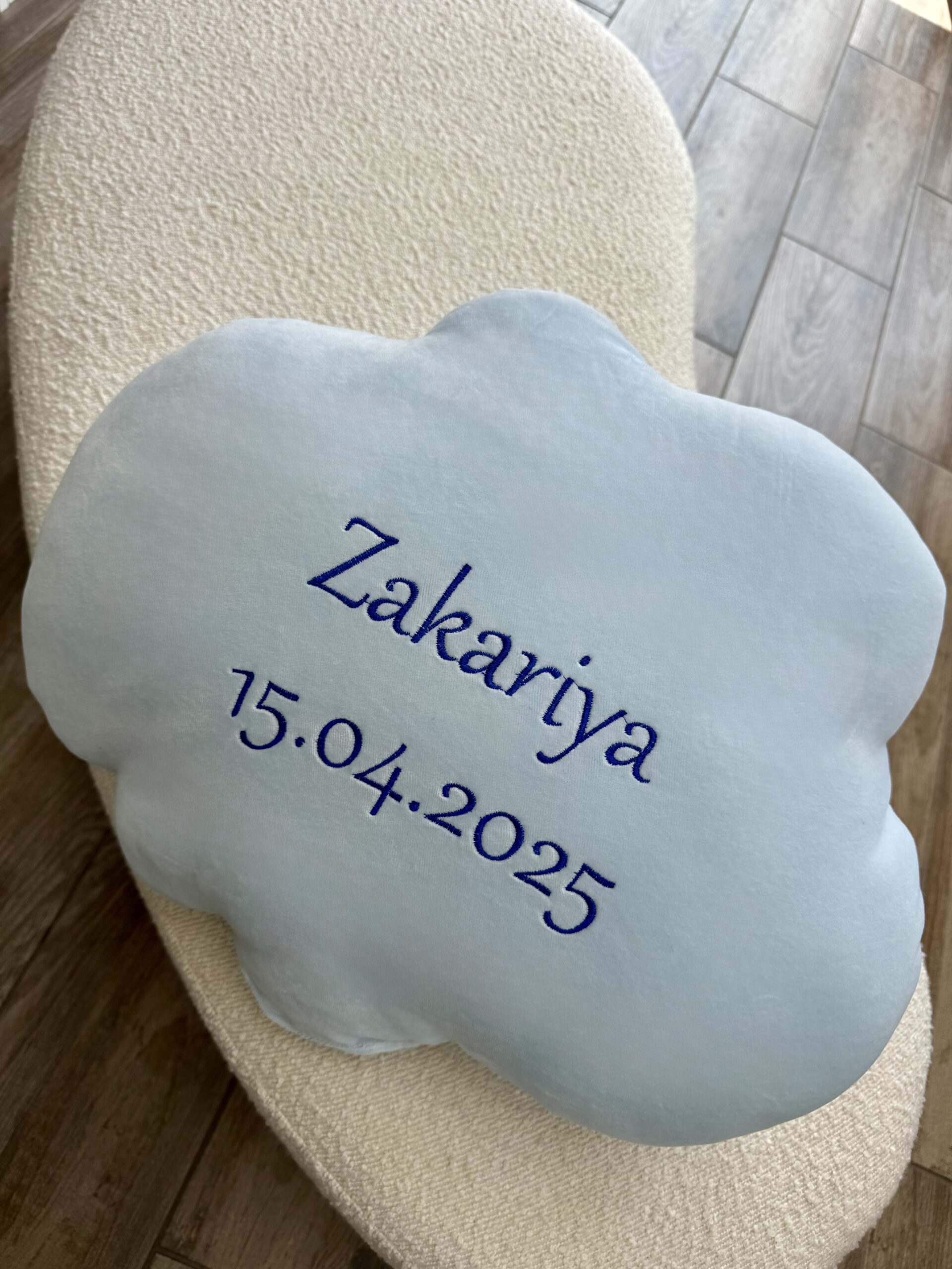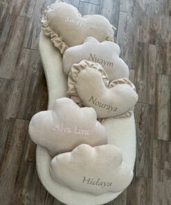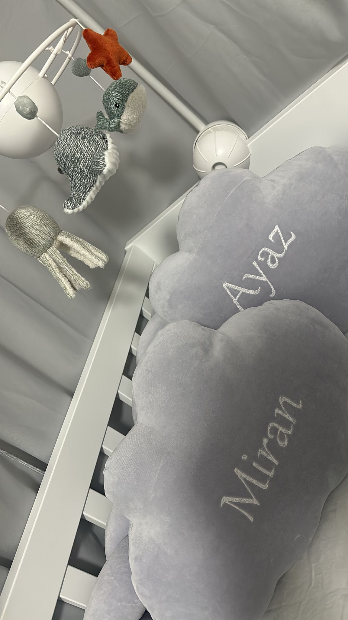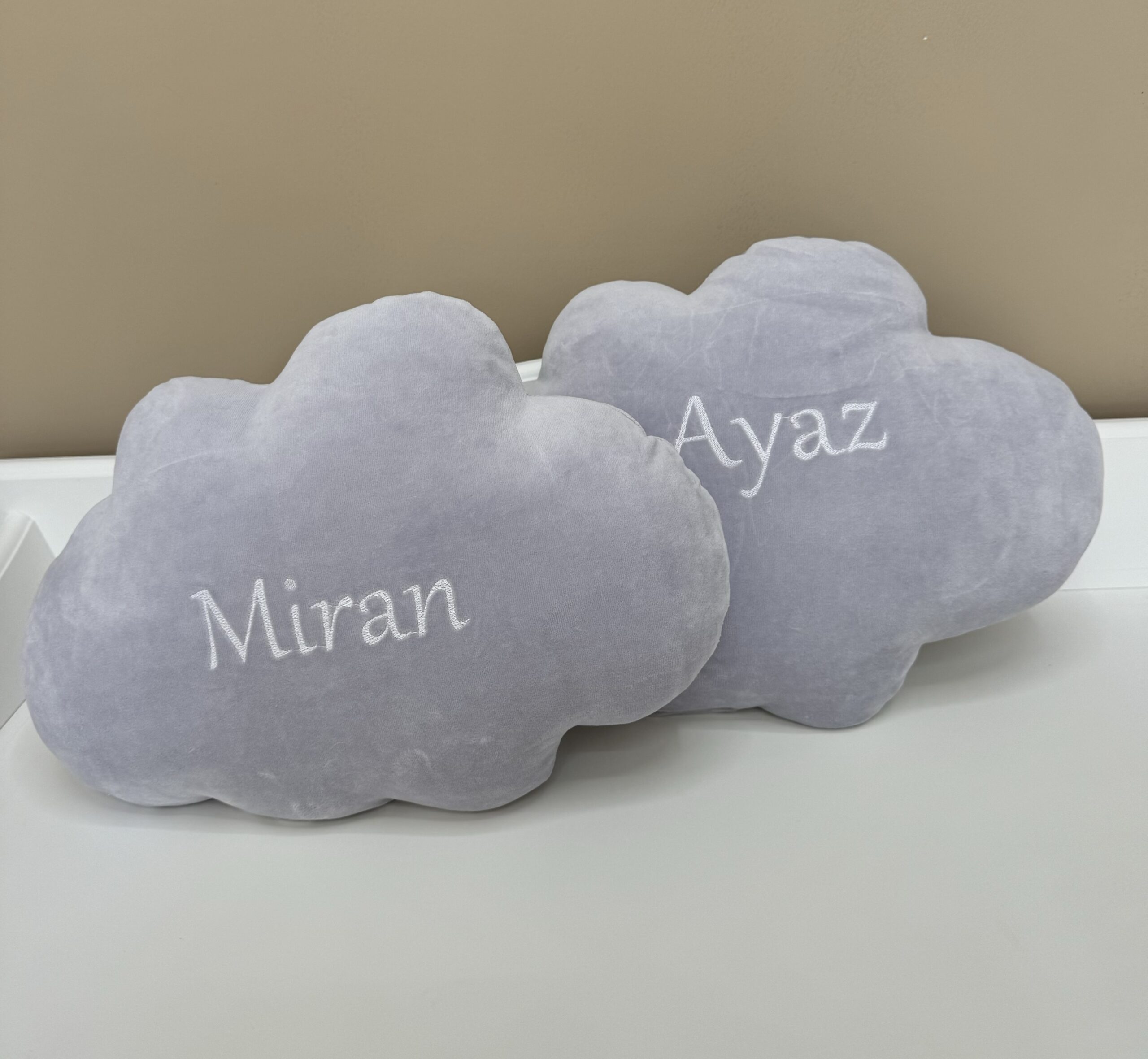 De handgemaakte kussens met geborduurde naam zijn verkrijgbaar in 45 cm en 55 cm.
