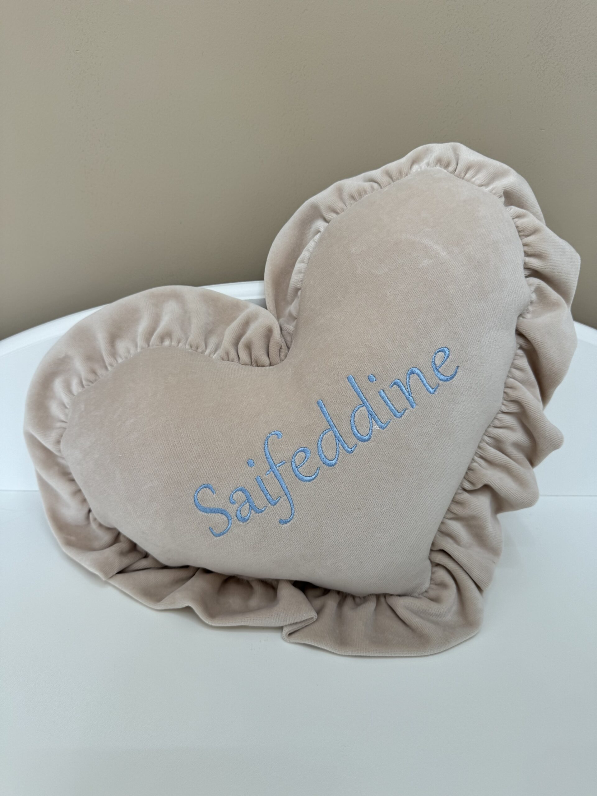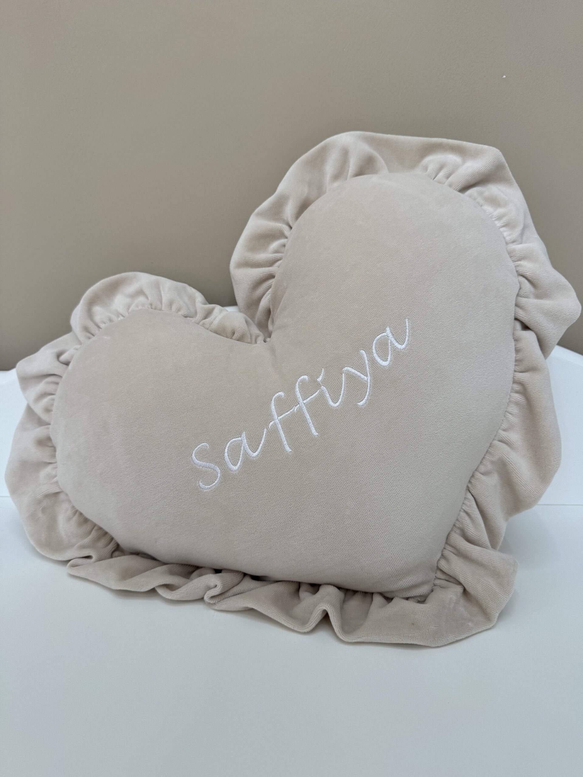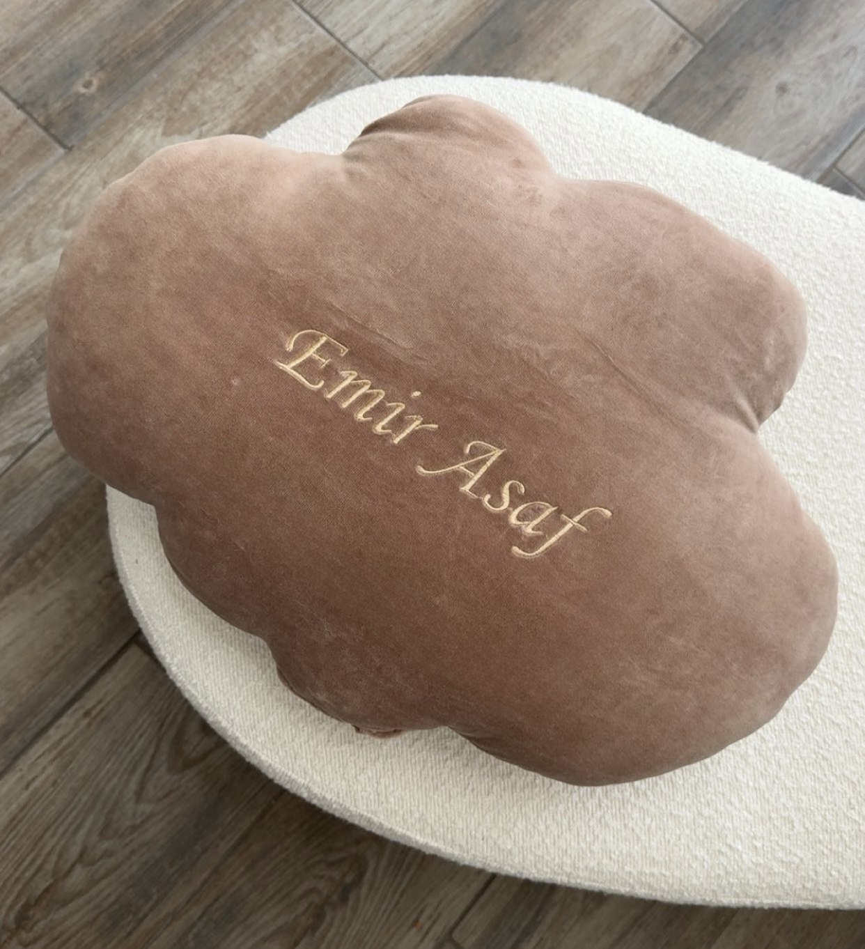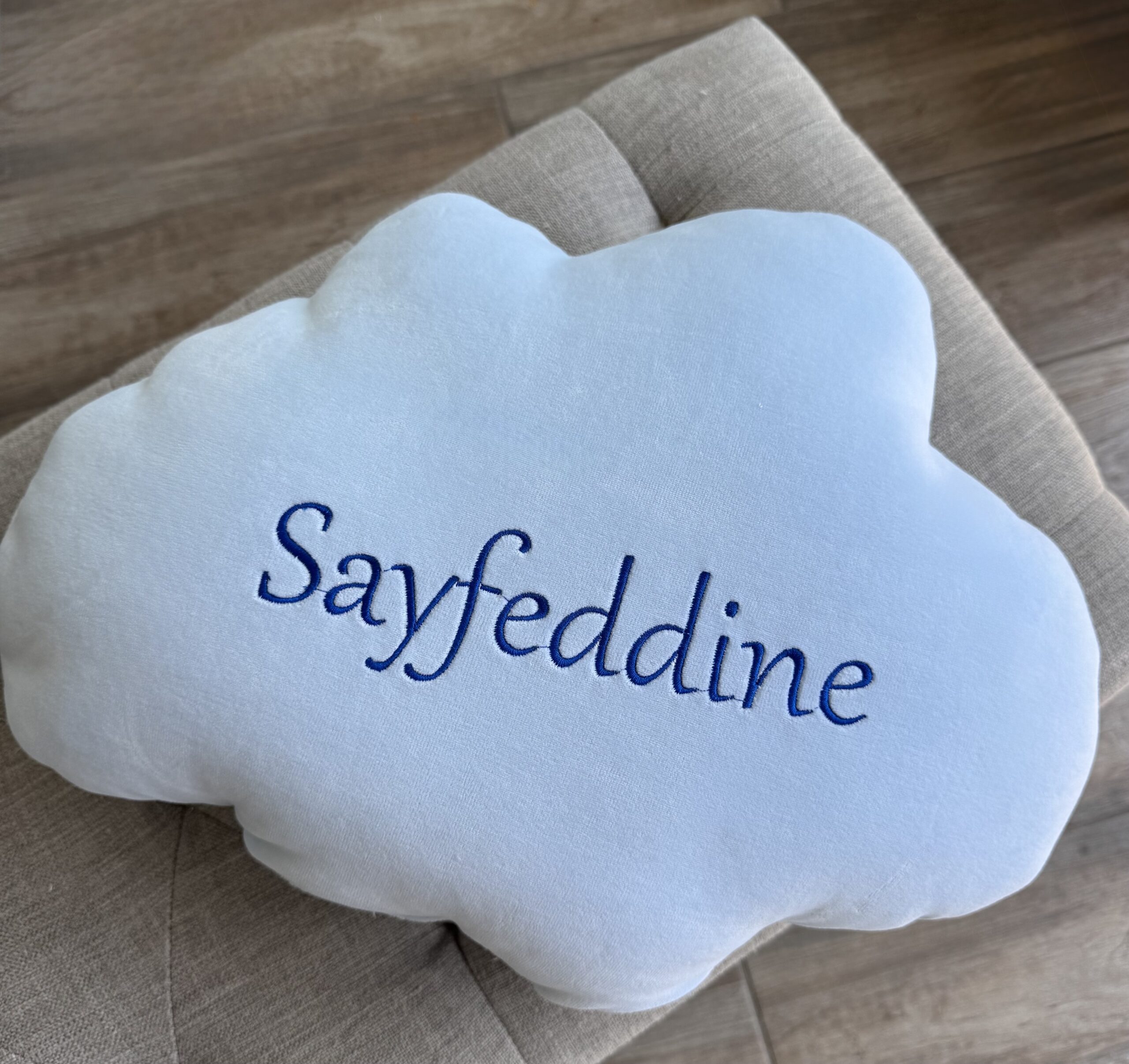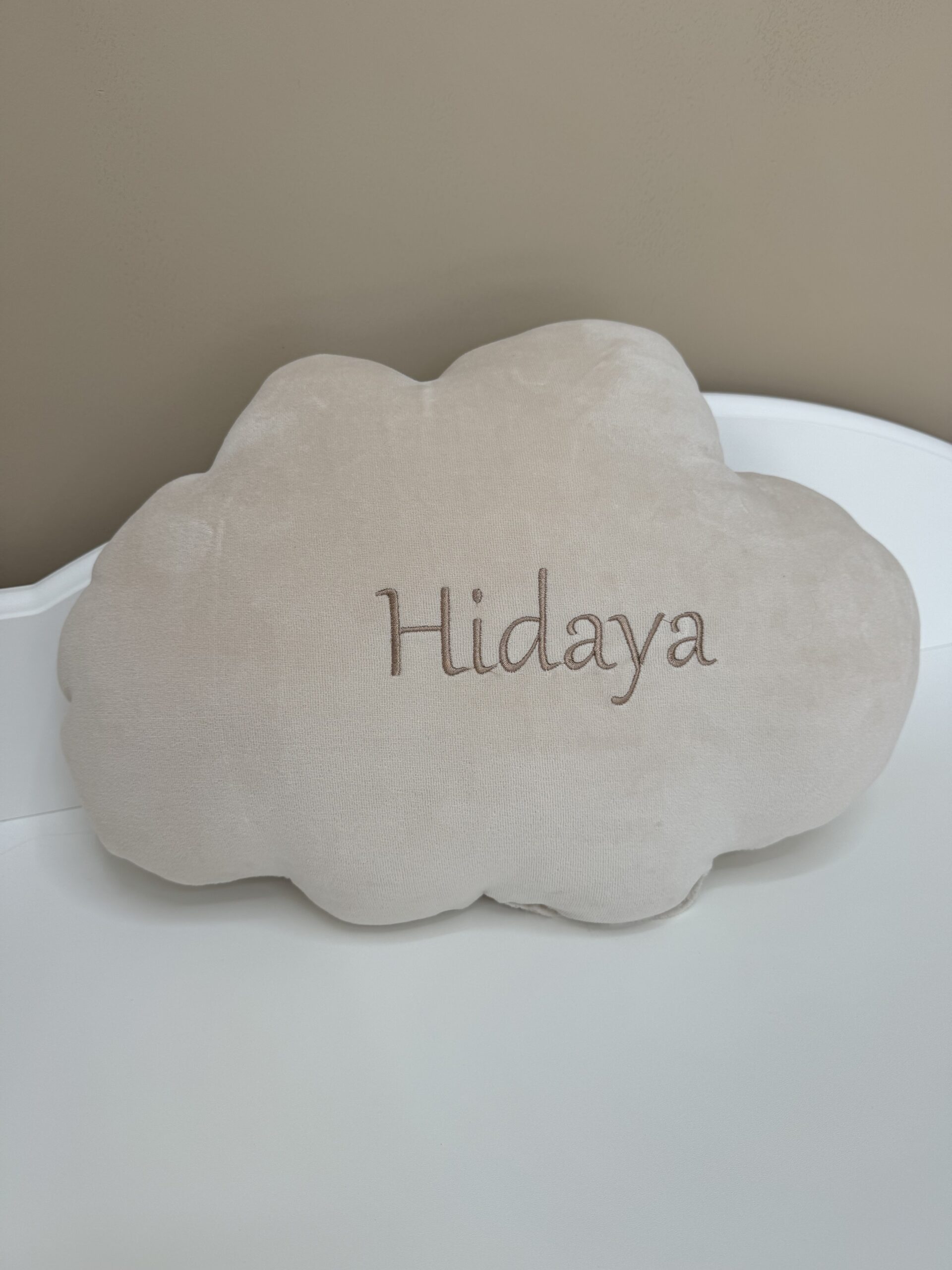 De handgemaakte kussens met geborduurde naam zijn verkrijgbaar in 45 cm en 55 cm.