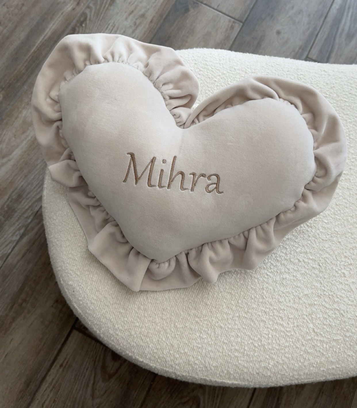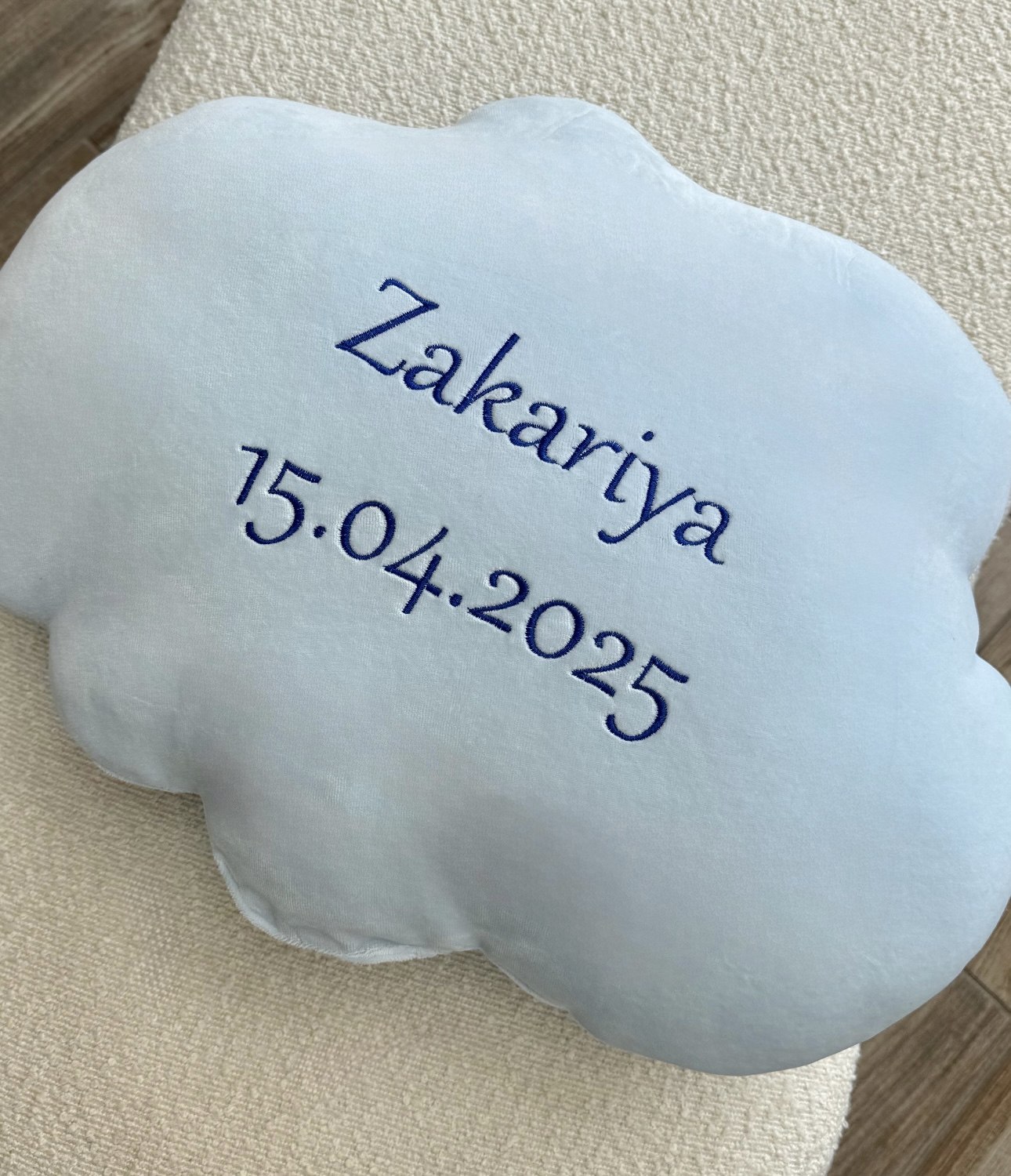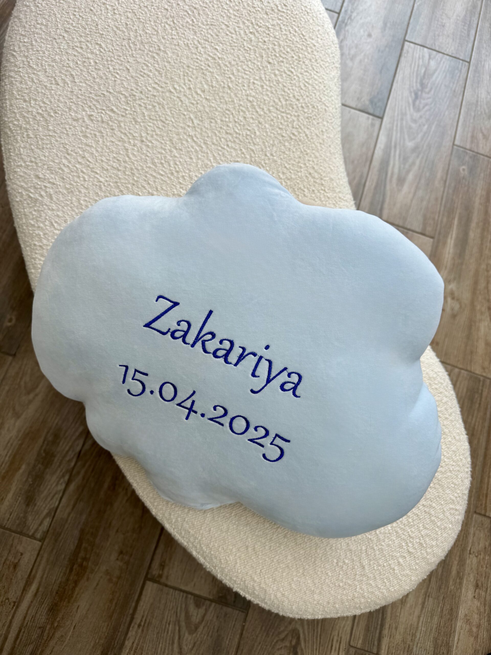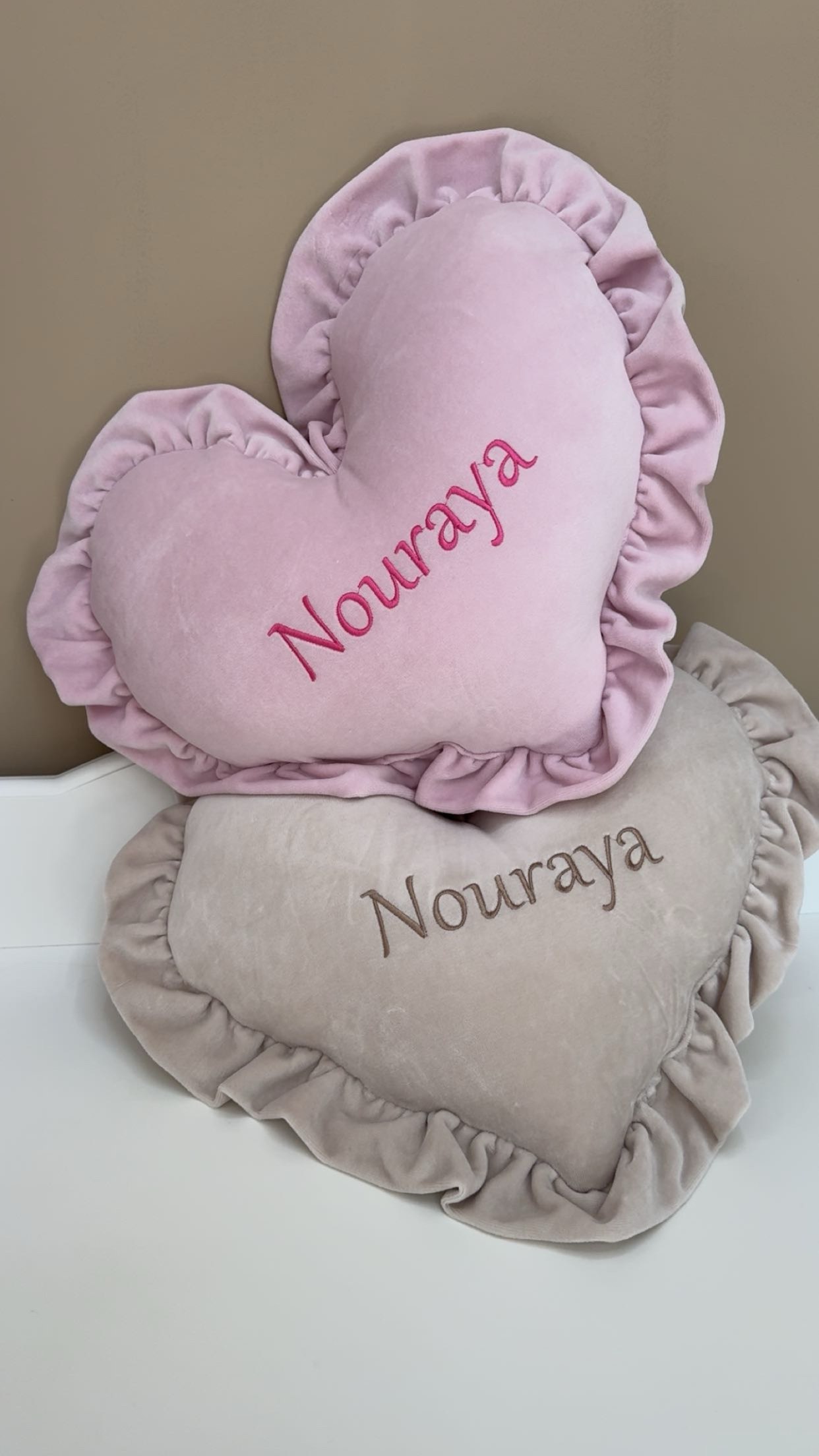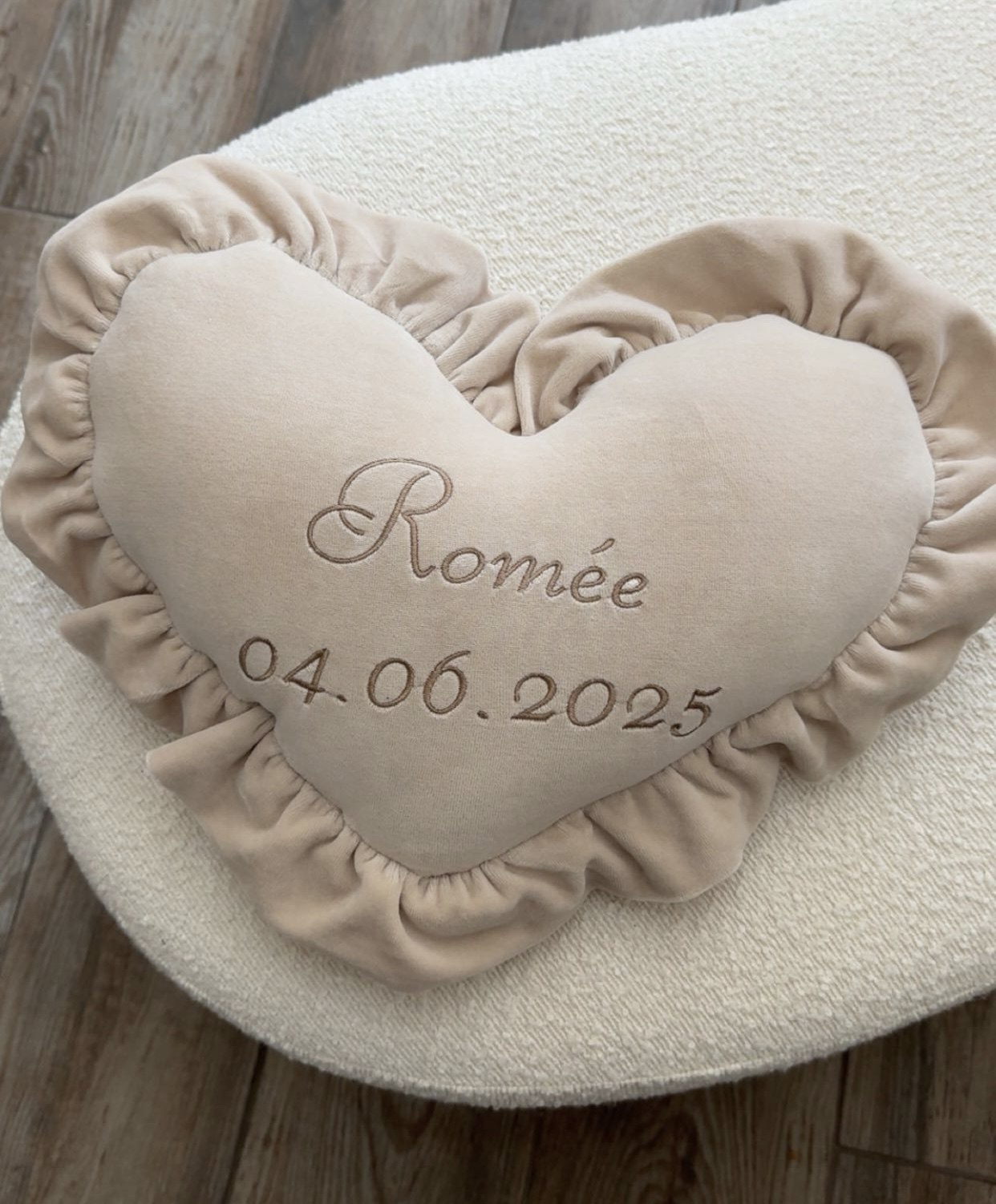 De handgemaakte kussens met geborduurde naam zijn verkrijgbaar in 45 cm en 55 cm.