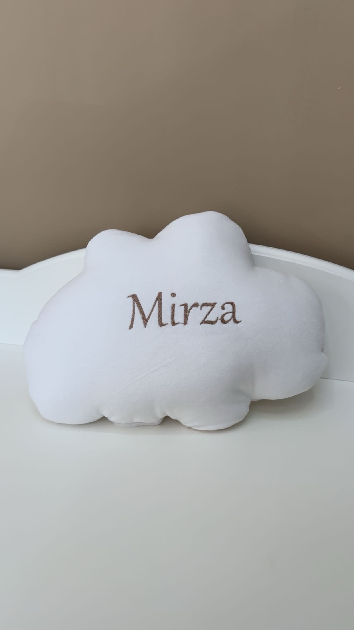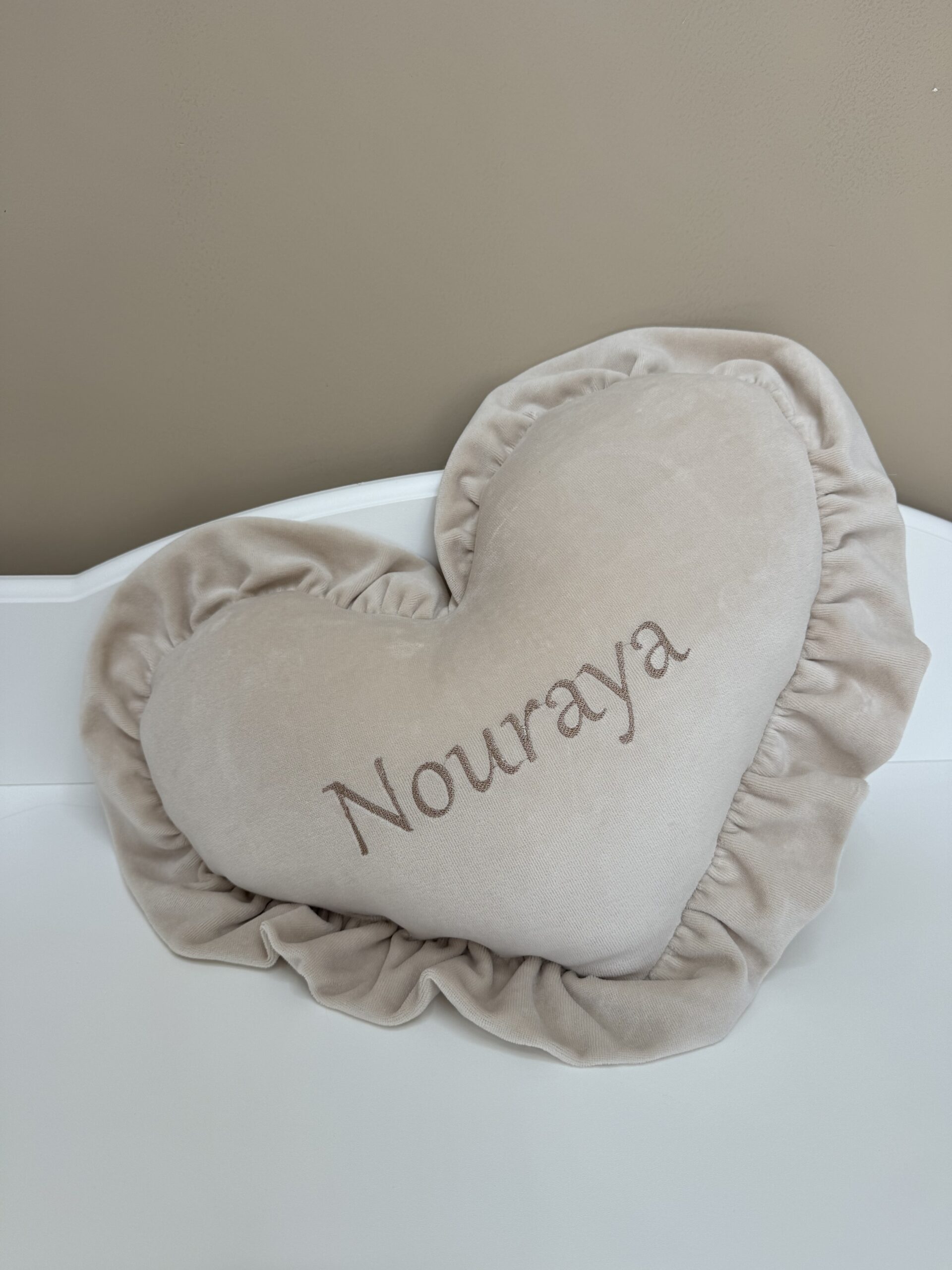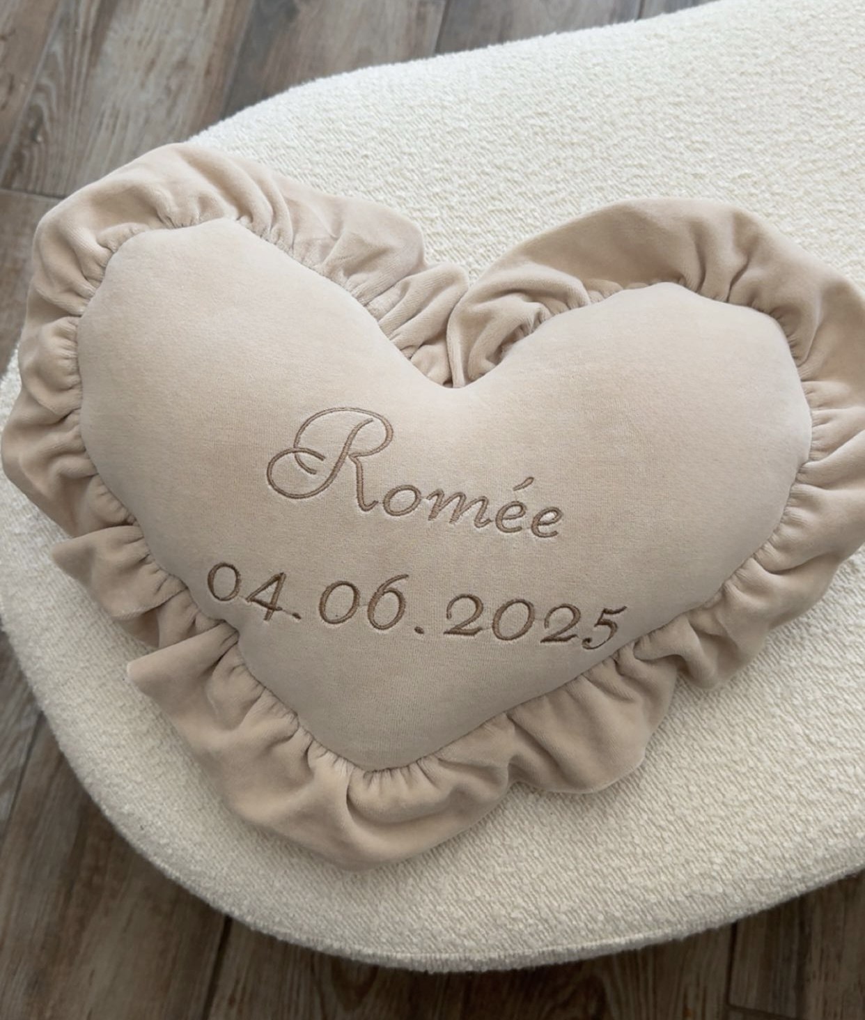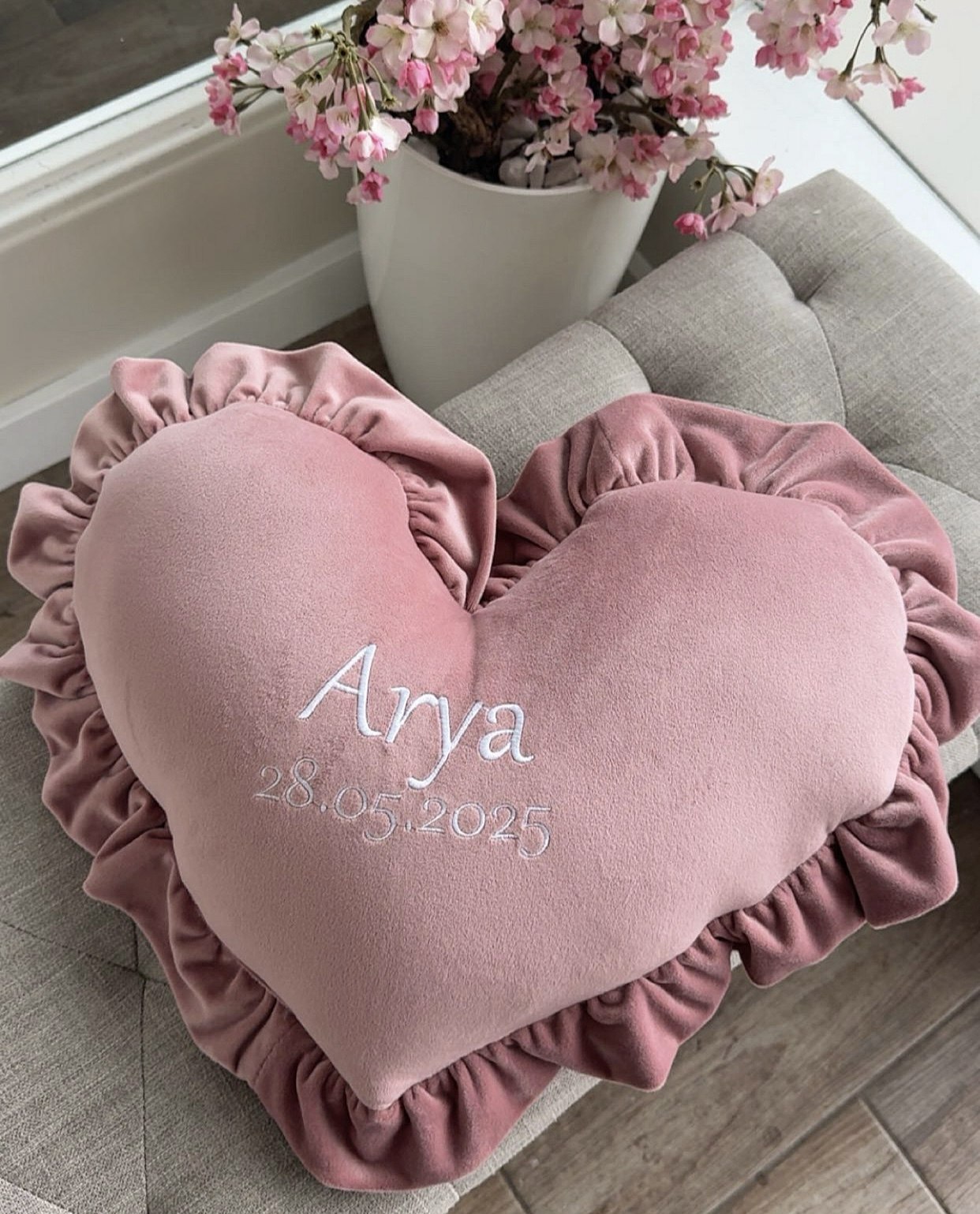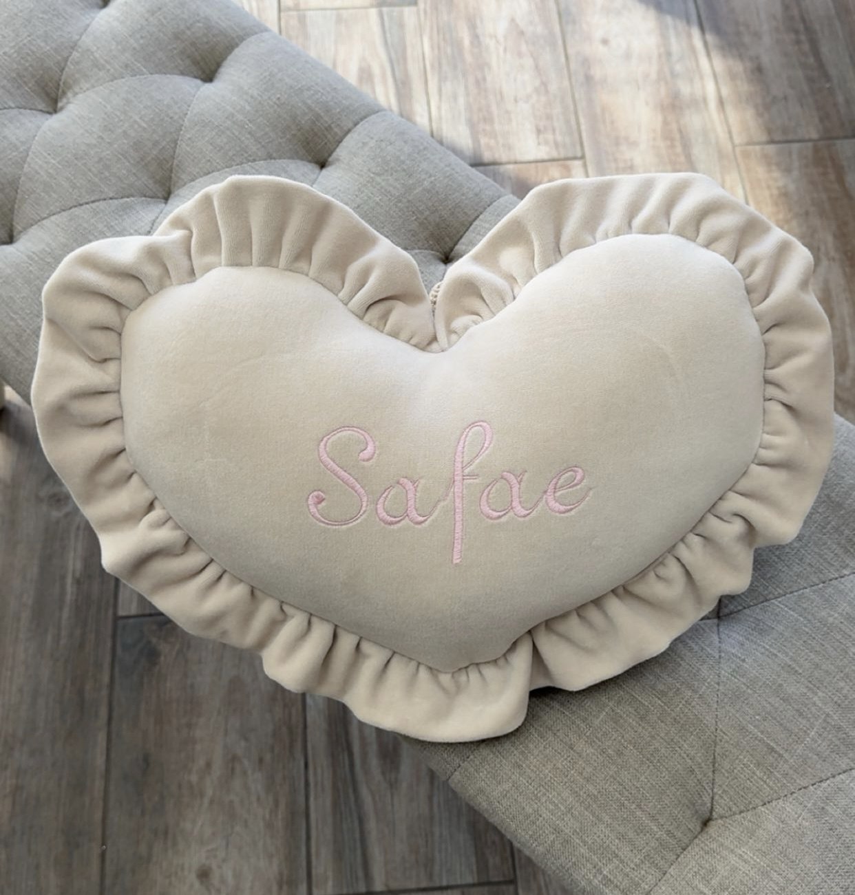 De handgemaakte kussens met geborduurde naam zijn verkrijgbaar in 45 cm en 55 cm.