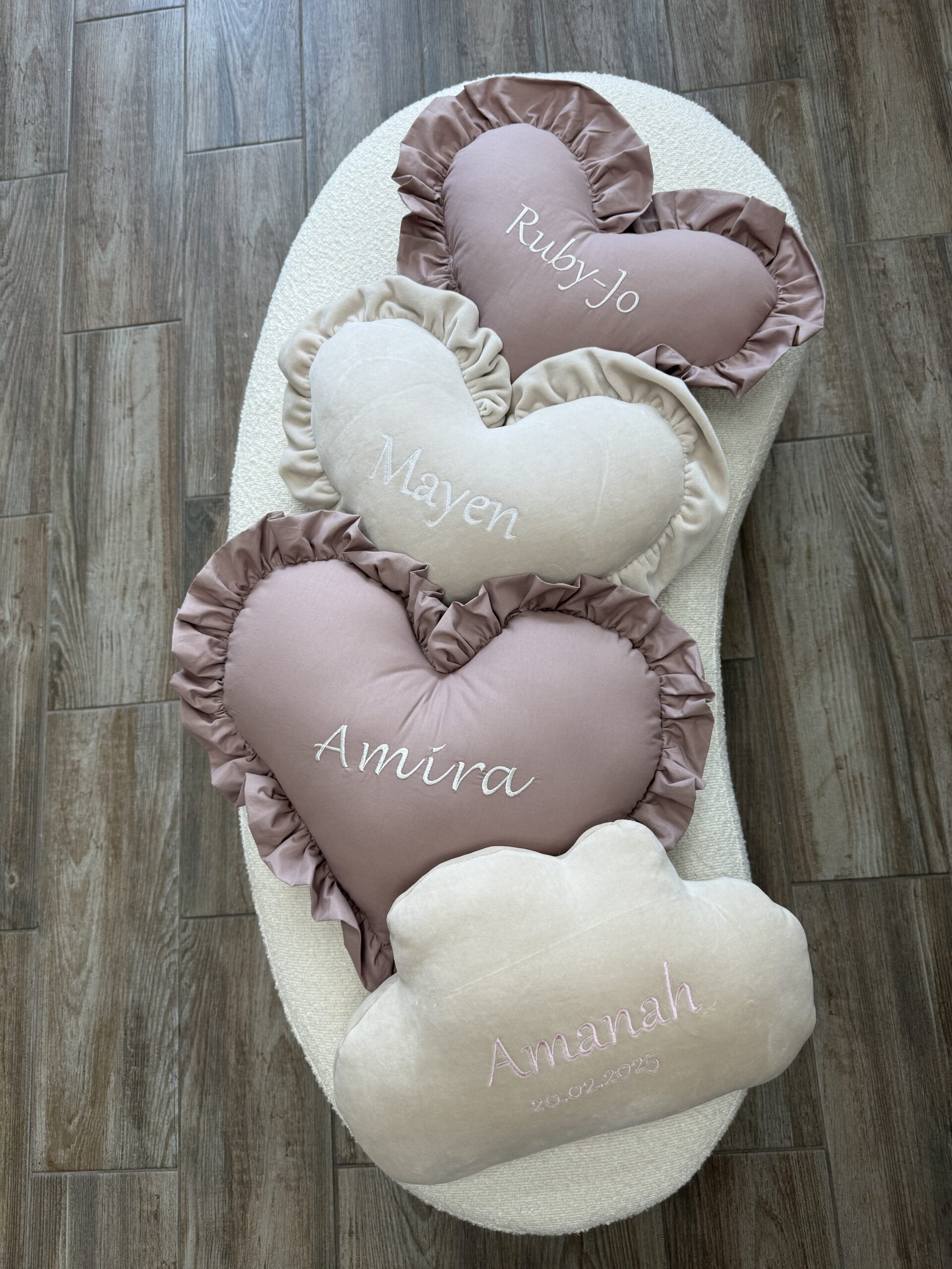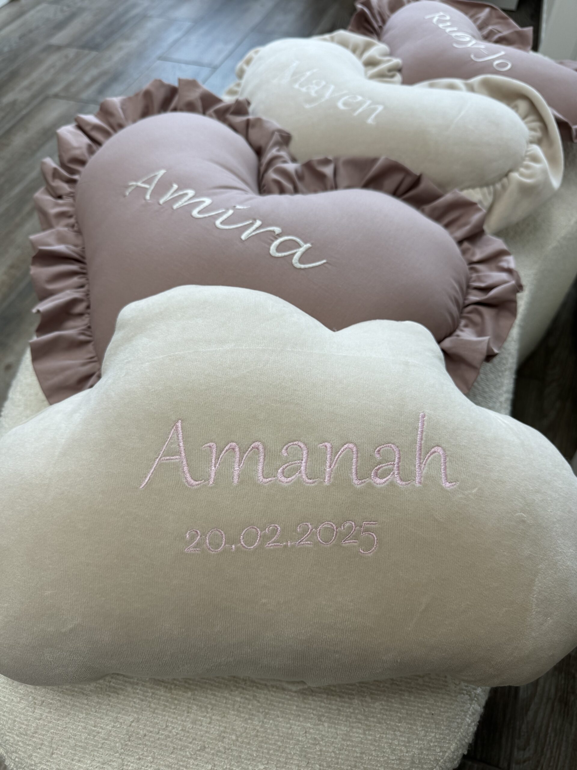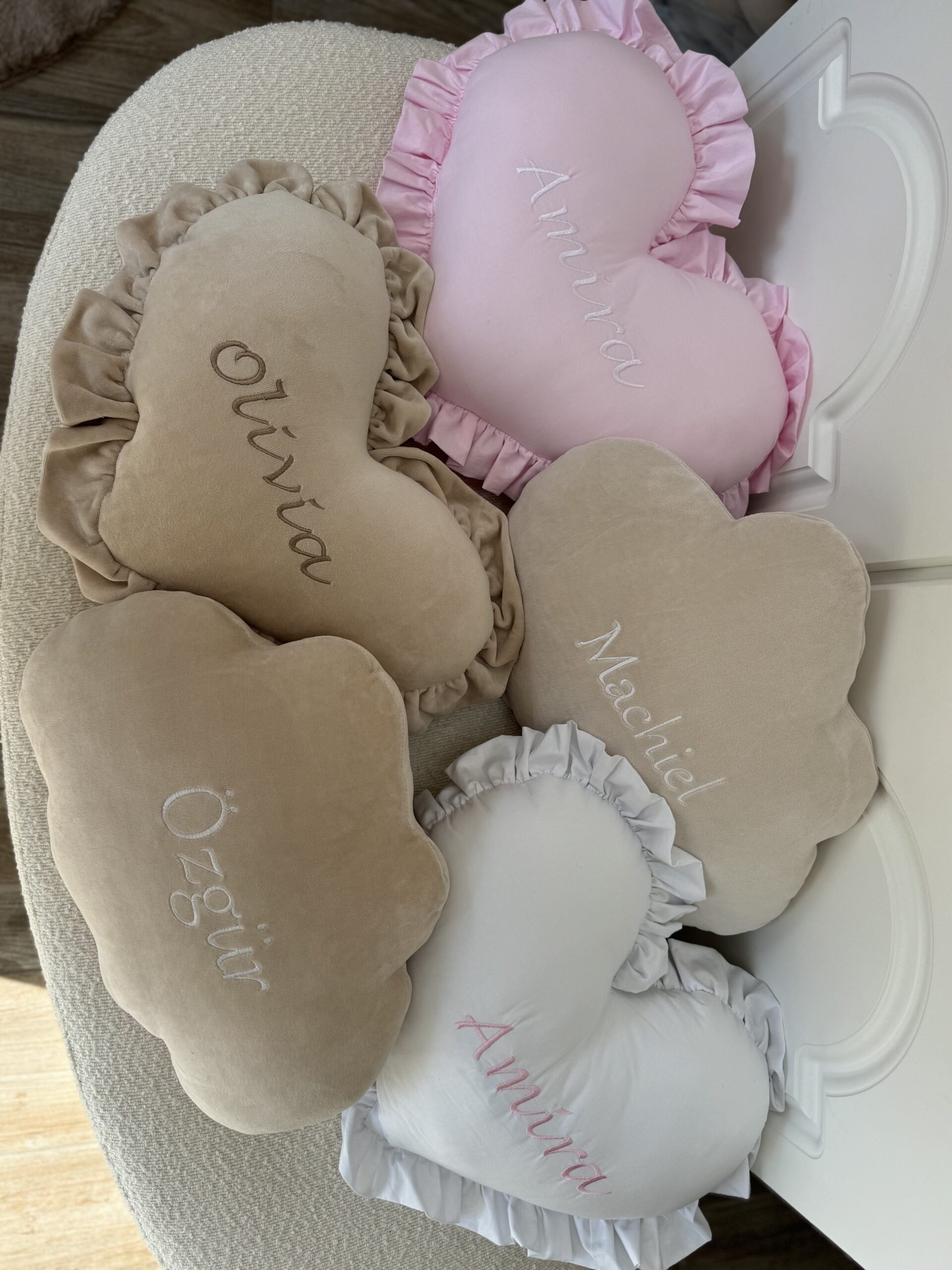 Ook de vorm van het kussen kun je zelf bepalen. Wij hebben een harten vorm, een wolk, en een beer. Maar elke andere vorm mag natuurlijk ook. Álles is mogelijk.