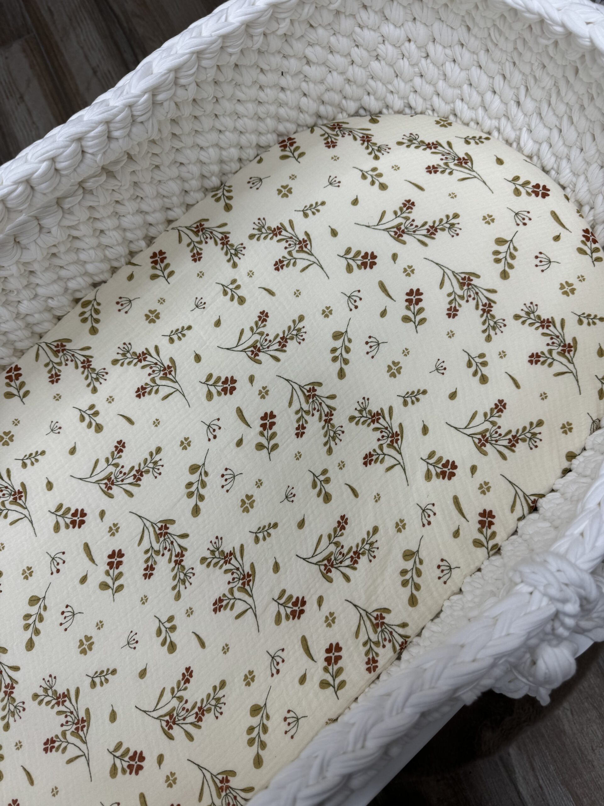 De hoeslaken is gemaakt van 100% katoen en kan gebruikt worden voor het matrasje van de verschoonmand én het matras van de mozesmand.