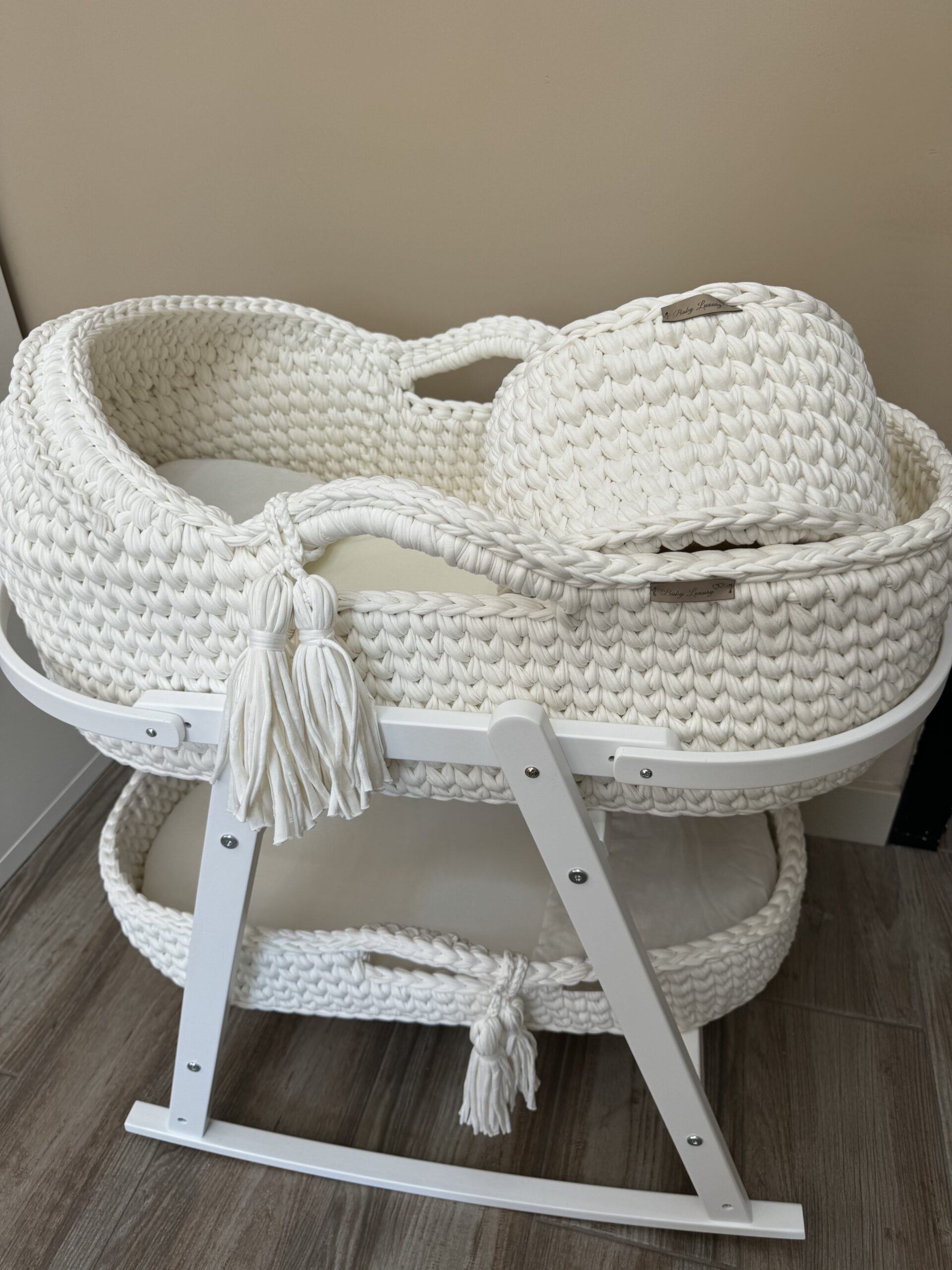De mozesmand wordt exclusief met de hand gehaakt en is voorzien van een stevig matrasje en kussentje.