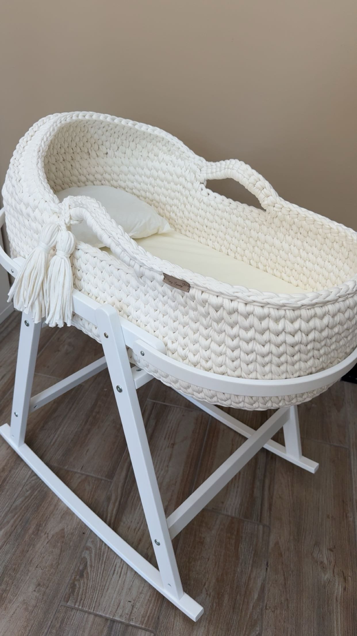 De mozesmand wordt exclusief met de hand gehaakt en is voorzien van een stevig matrasje en kussentje.