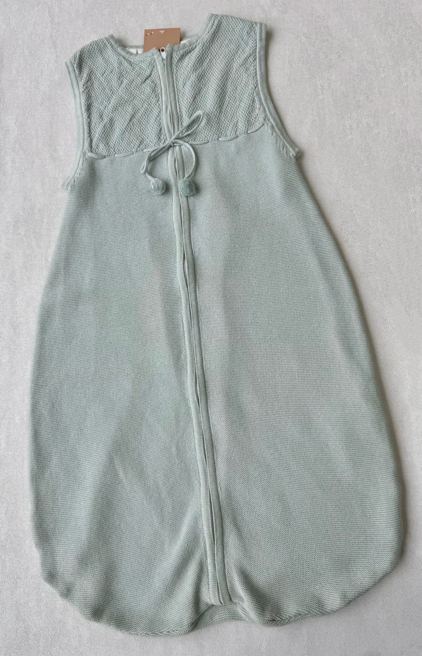 De slaapzak heeft een rissluiting en een gebreid patroon.