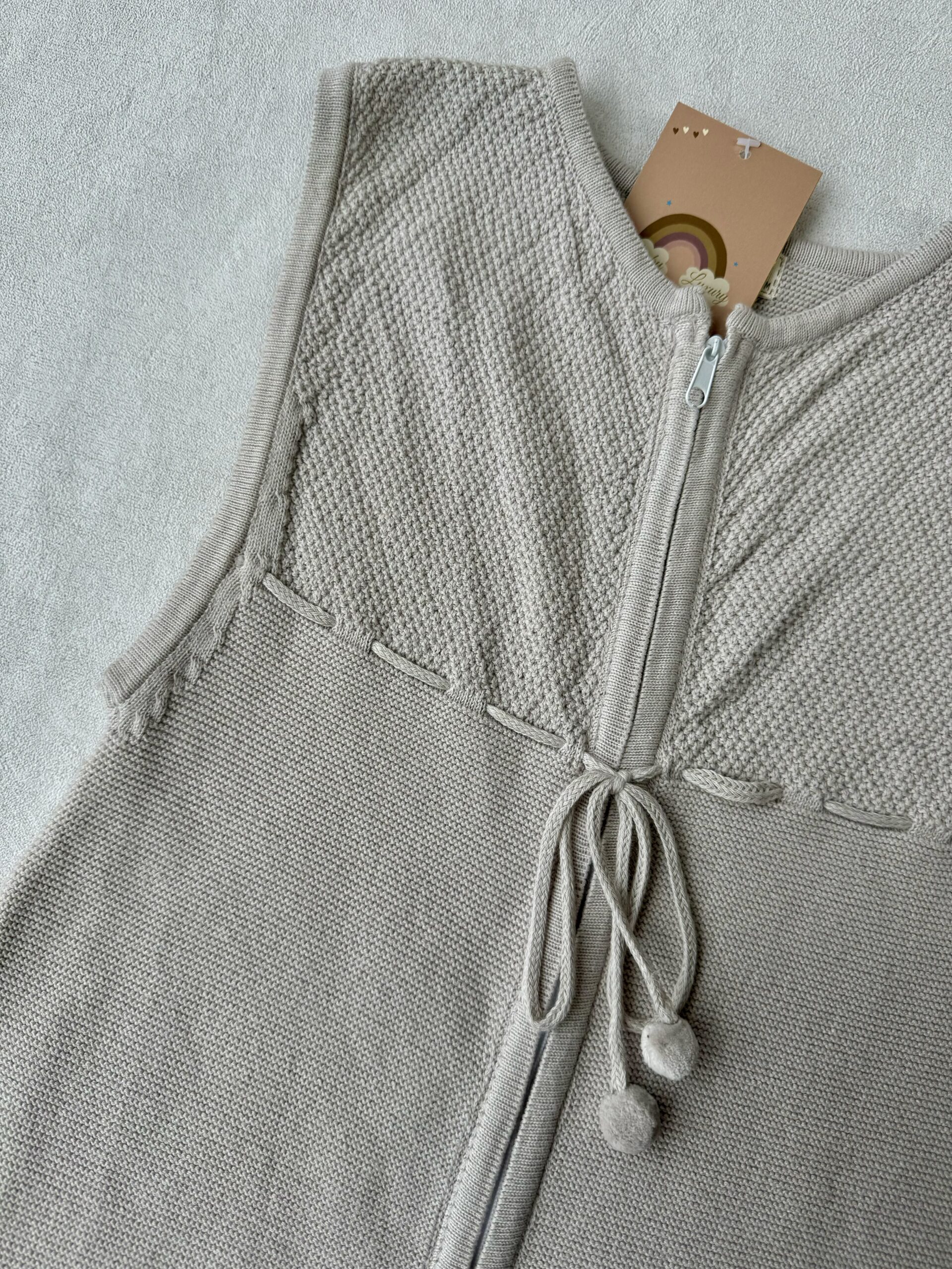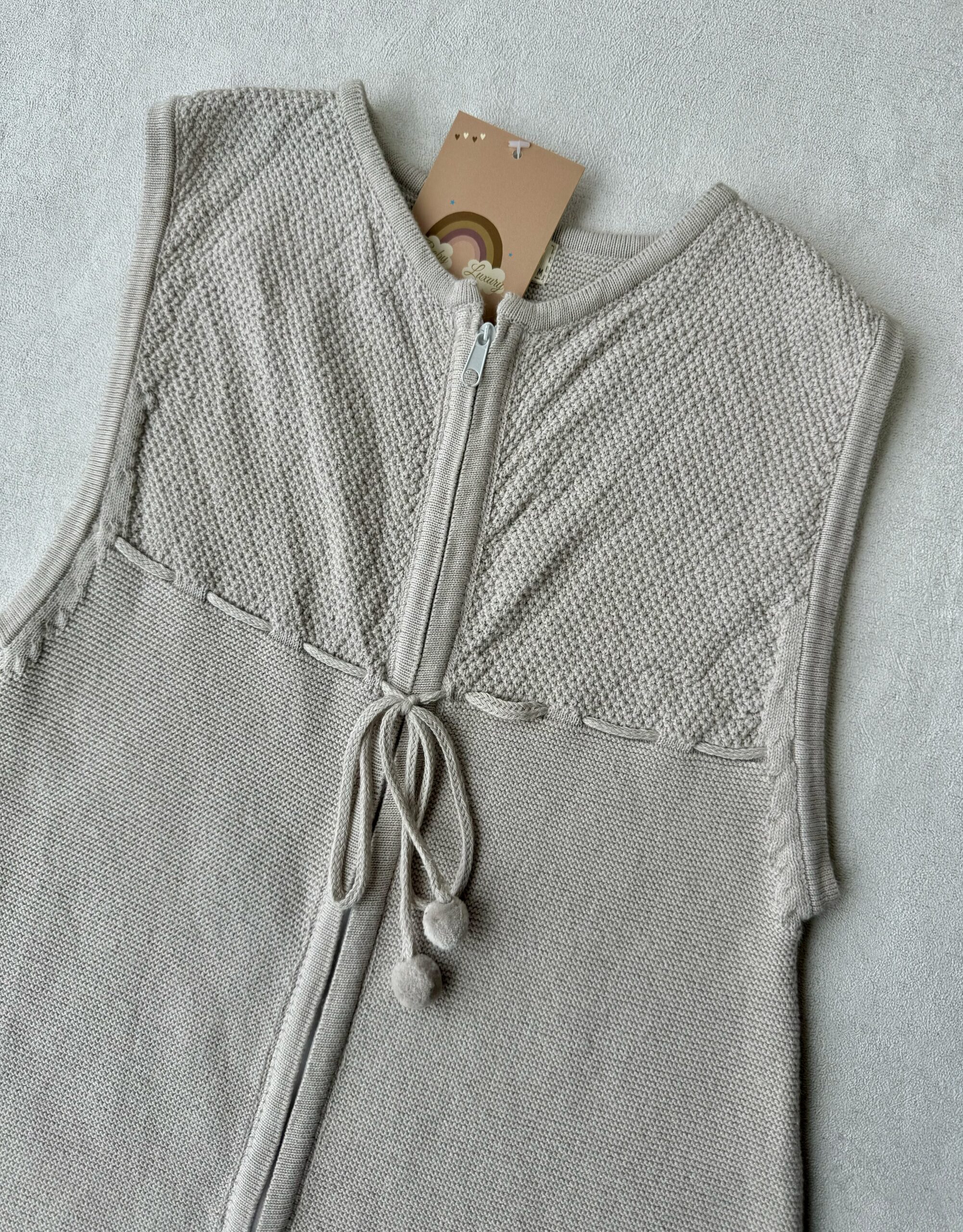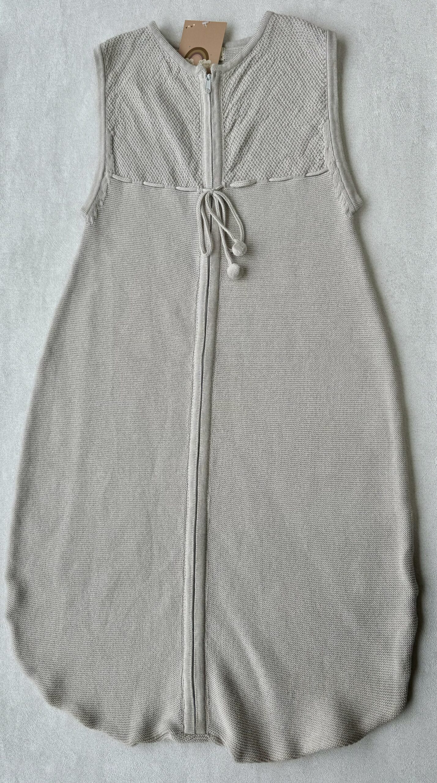 De slaapzak heeft een rissluiting en een gebreid patroon.
