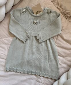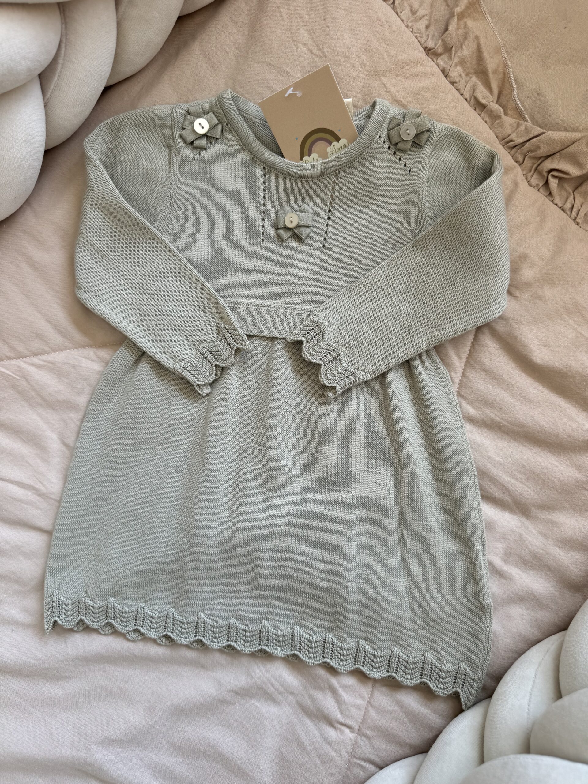 Het jurkje heeft strikjes en broderie afwerkingen.