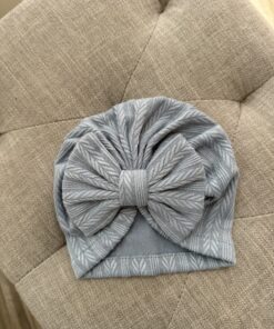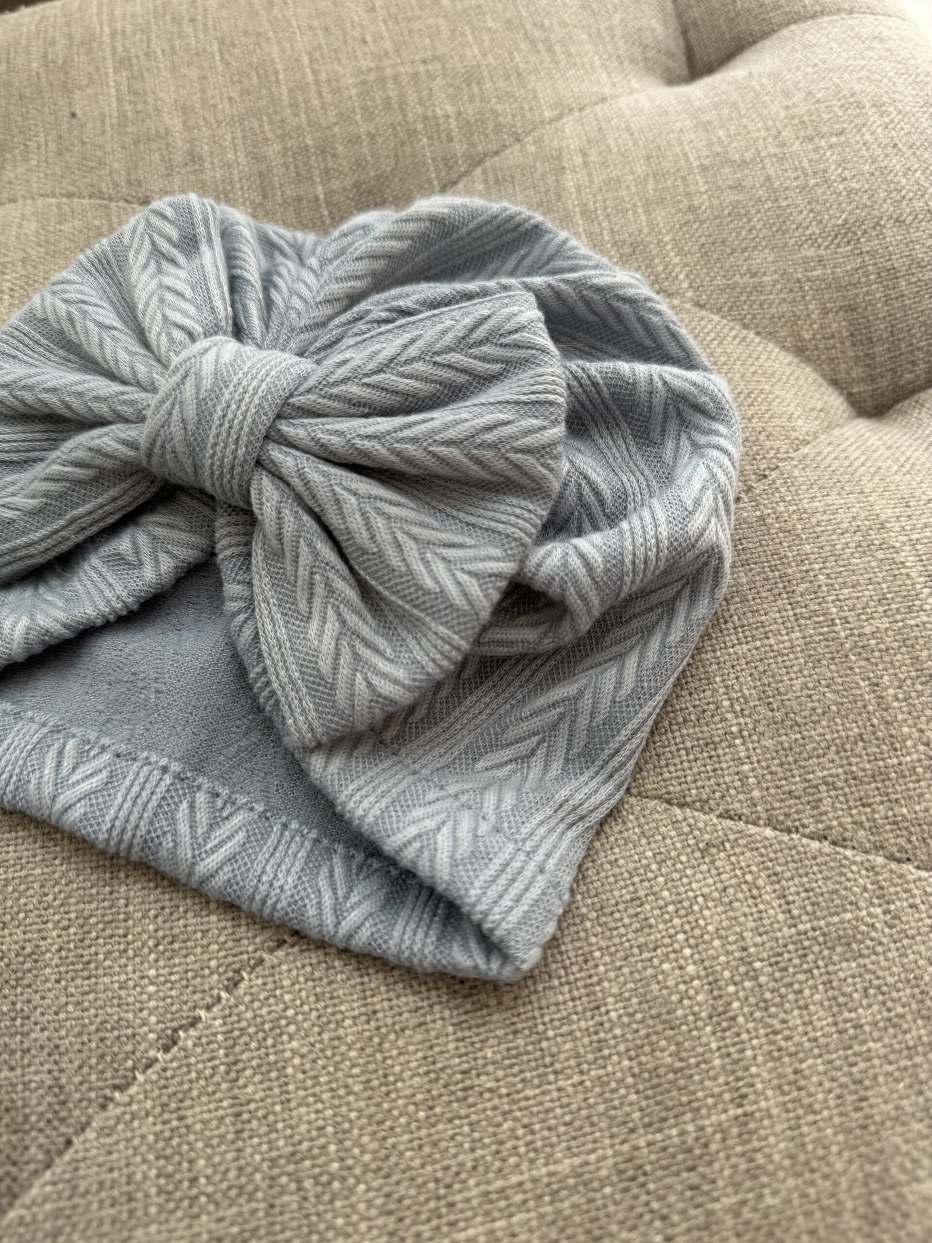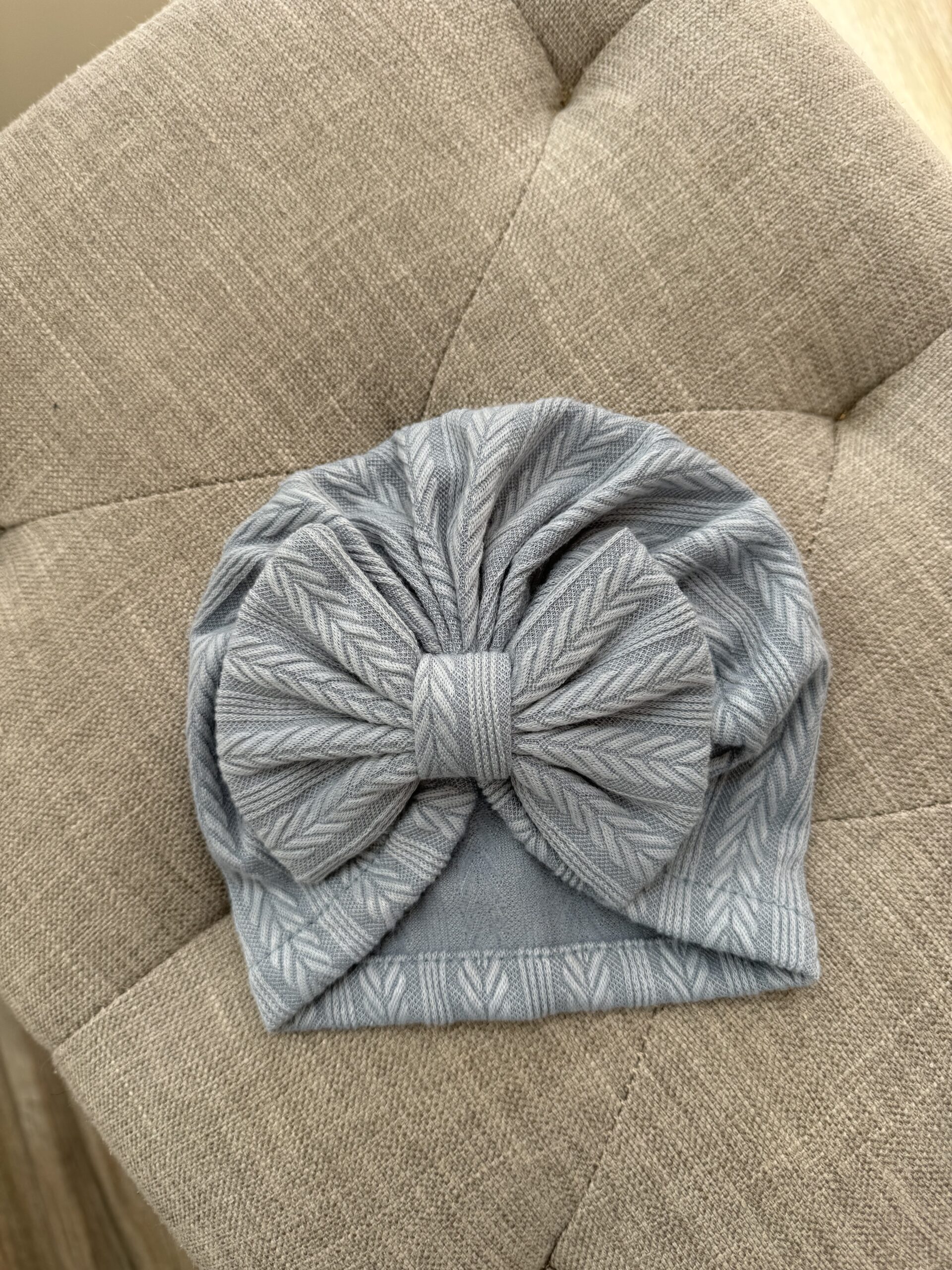 Een turban mutsje met een opvallende strik in de kleur ice.
