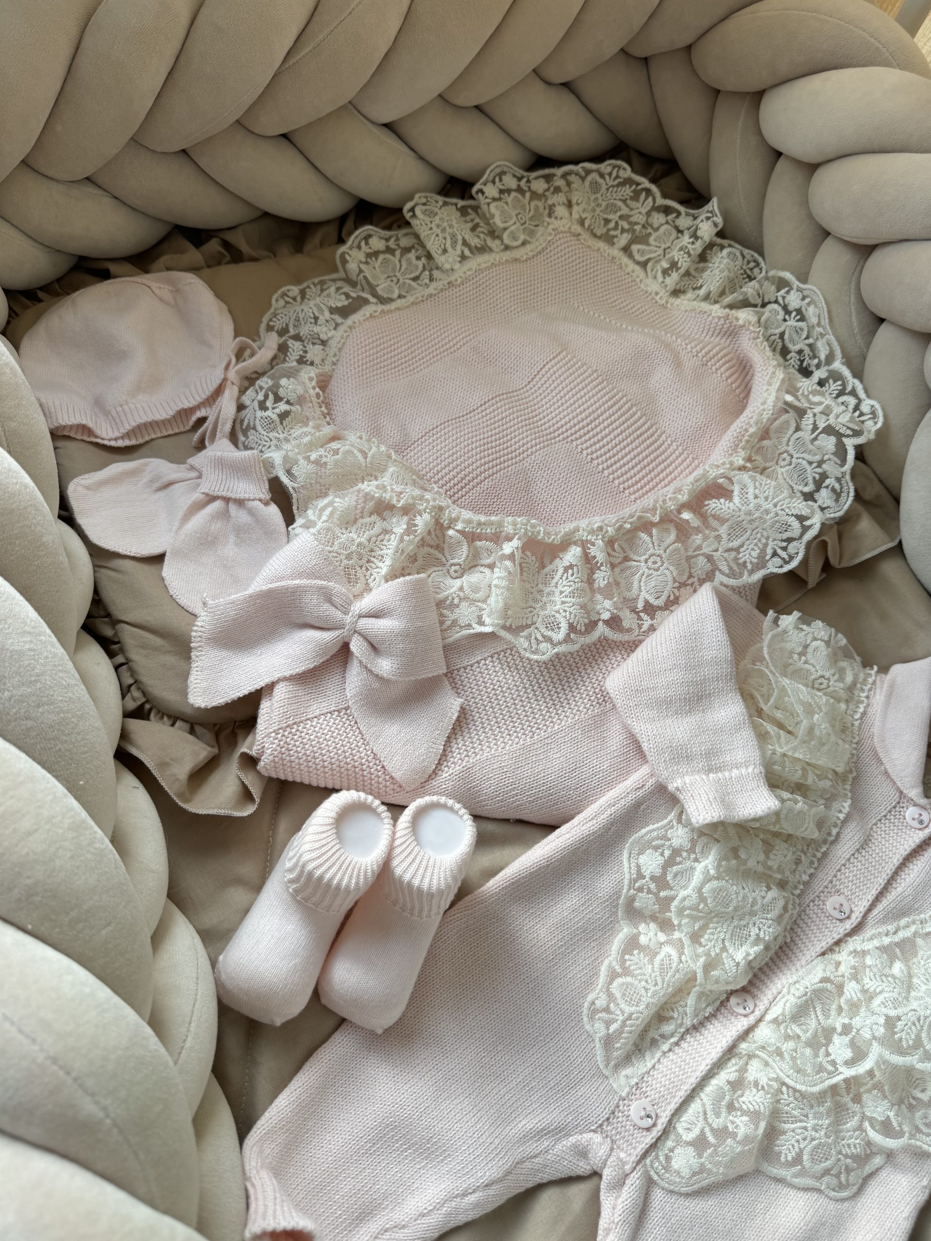 De set heeft prachtige kanten afwerkingen, diamantjes in de knoopjes, een wikkeldeken met kanten afwerkingen en een strik.