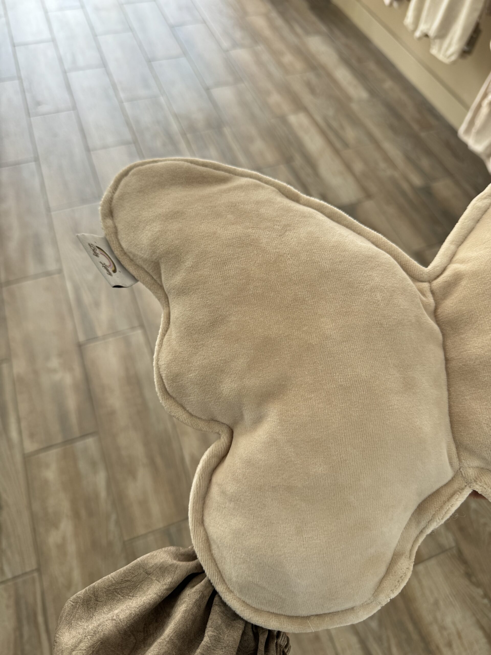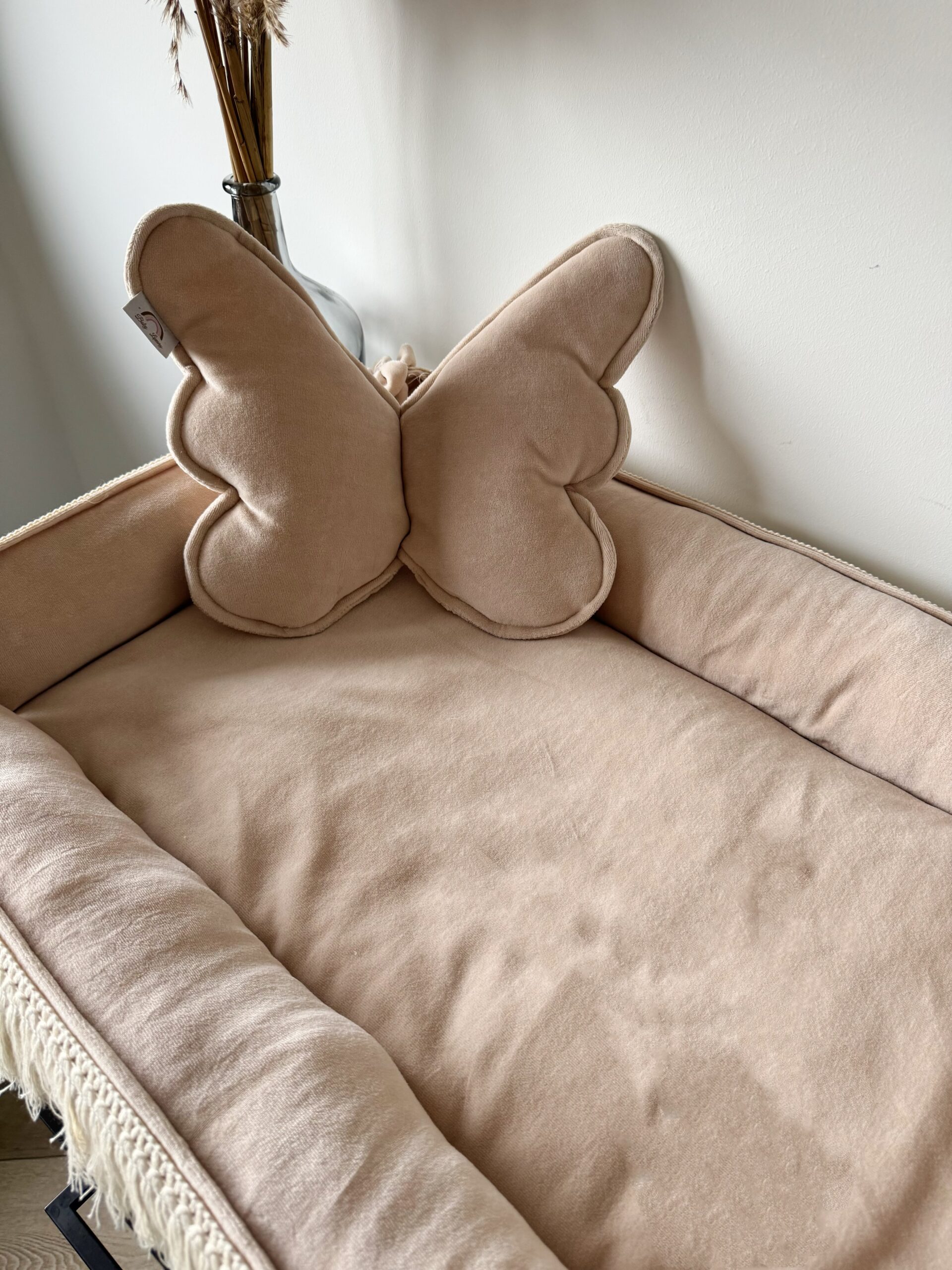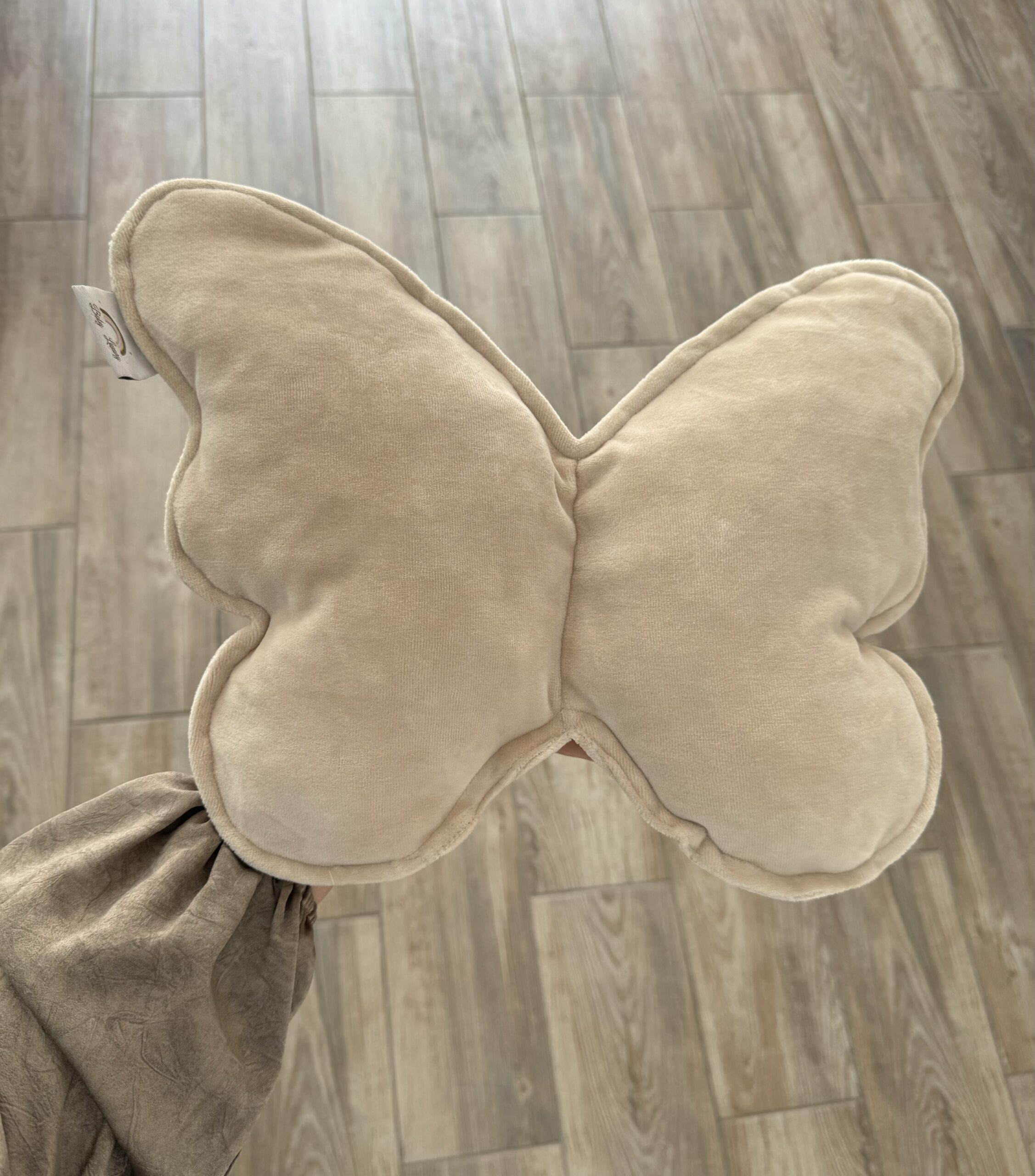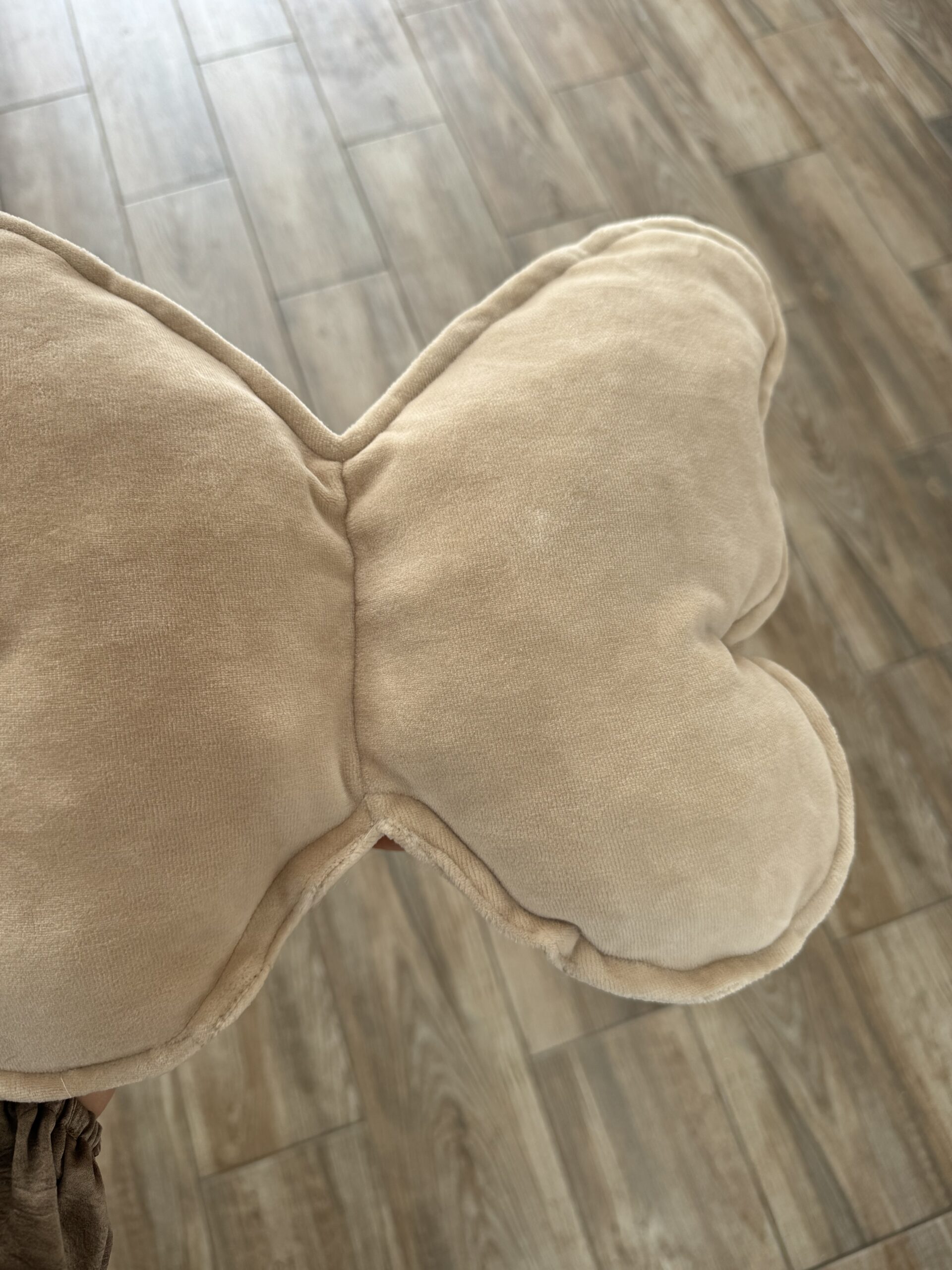 Een handgemaakt kussen in de vorm van een vlinder.