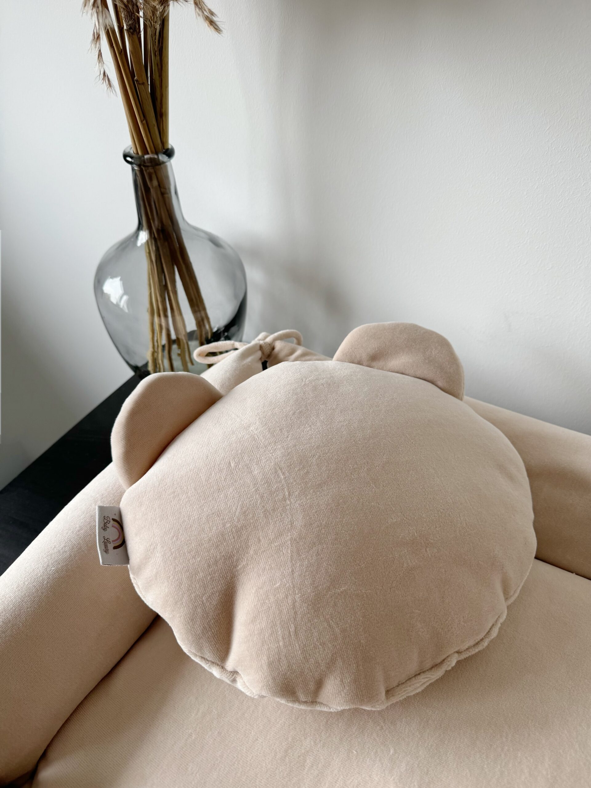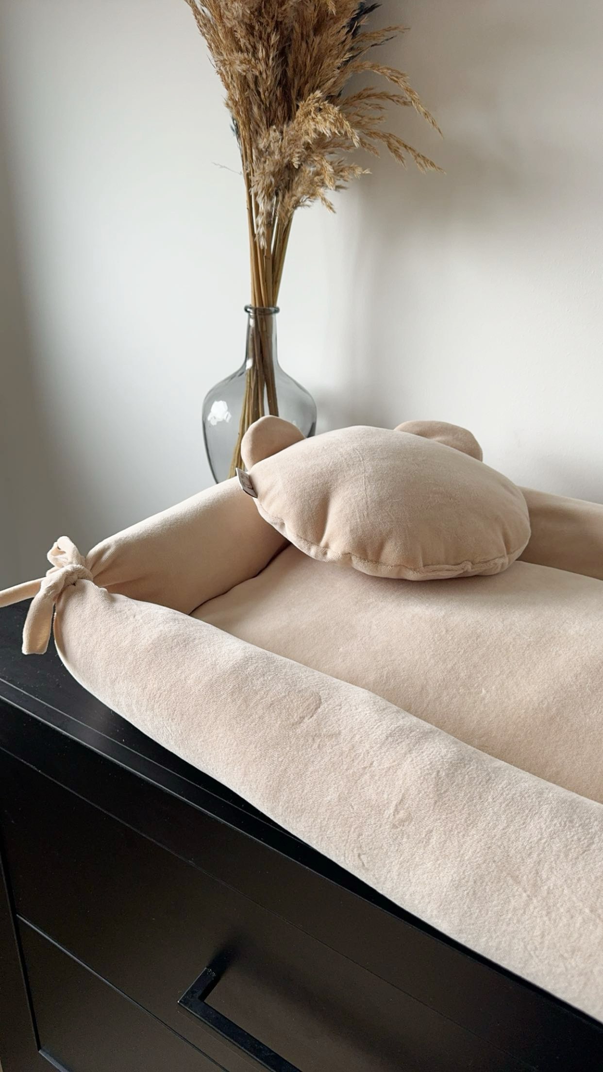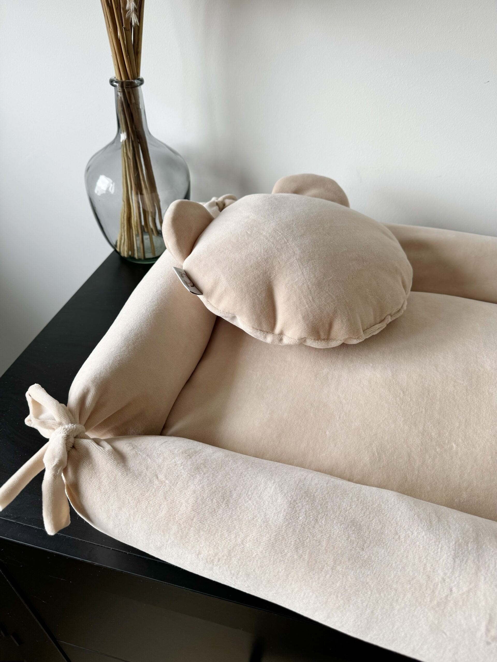 Het Velvety Natural babynestje in de kleur Velvety Beige met het kussentje Bear.